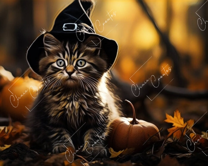 The kitten’s soft fur, detailed with warm browns and golds, contrasts beautifully with the black witch’s hat, complete with a silver buckle, adding a playful touch. The small pumpkin by its side ties the scene together, emphasizing the Halloween theme while maintaining a sense of innocence and wonder. This piece speaks to anyone who cherishes the magic of fall, the excitement of Halloween, or simply the joy that pets bring into our lives.