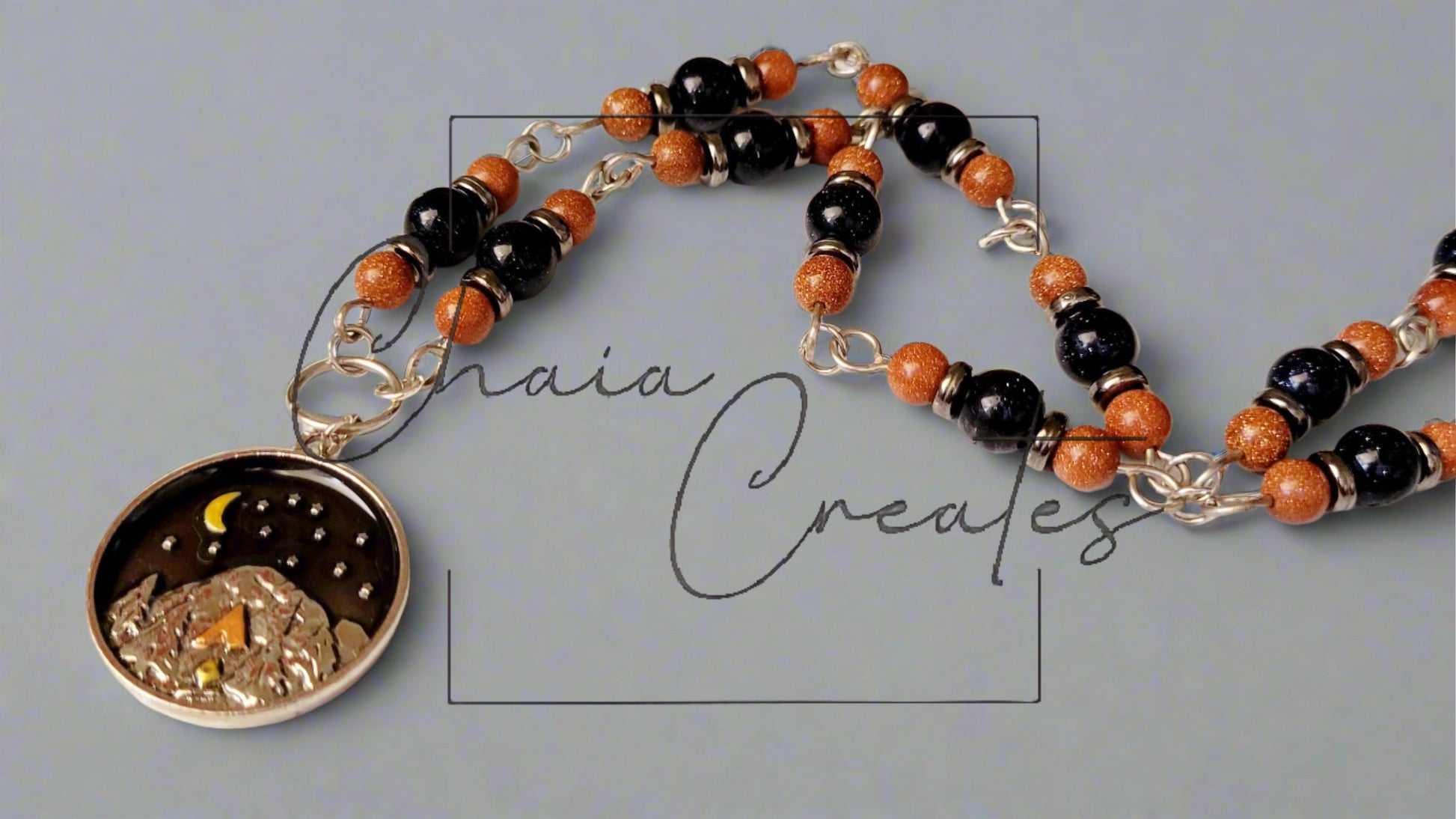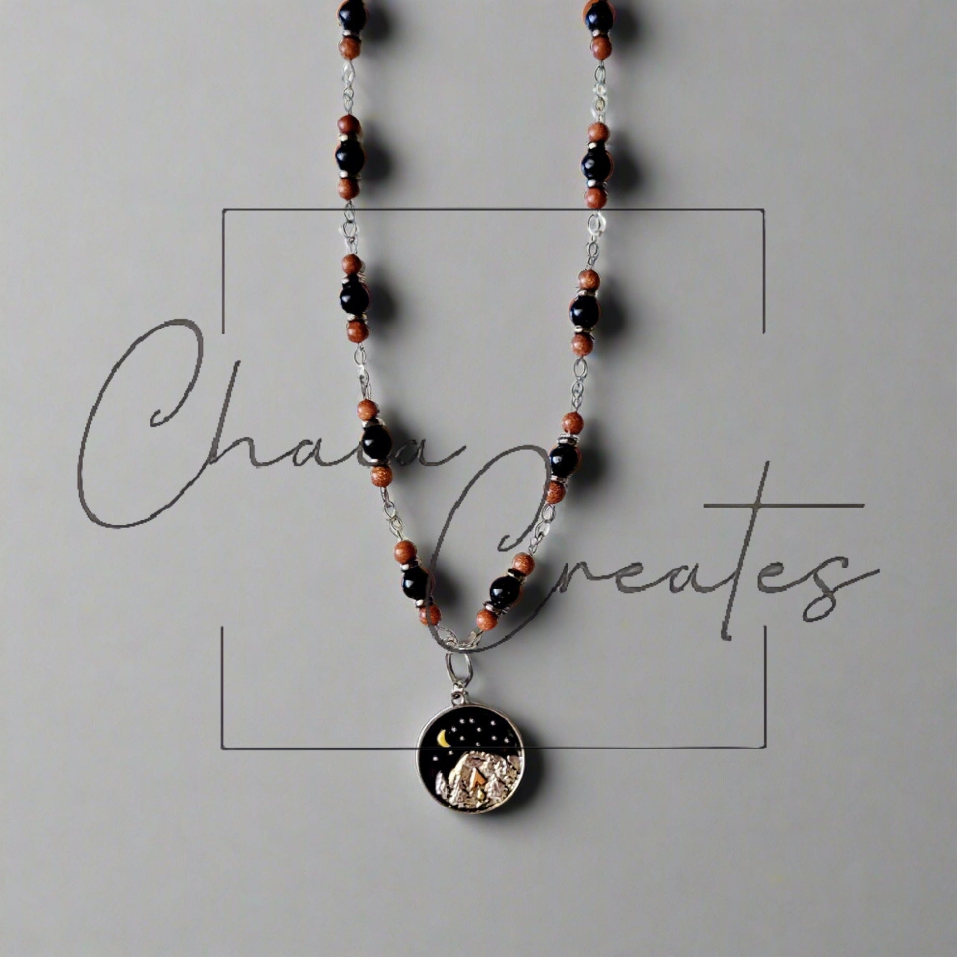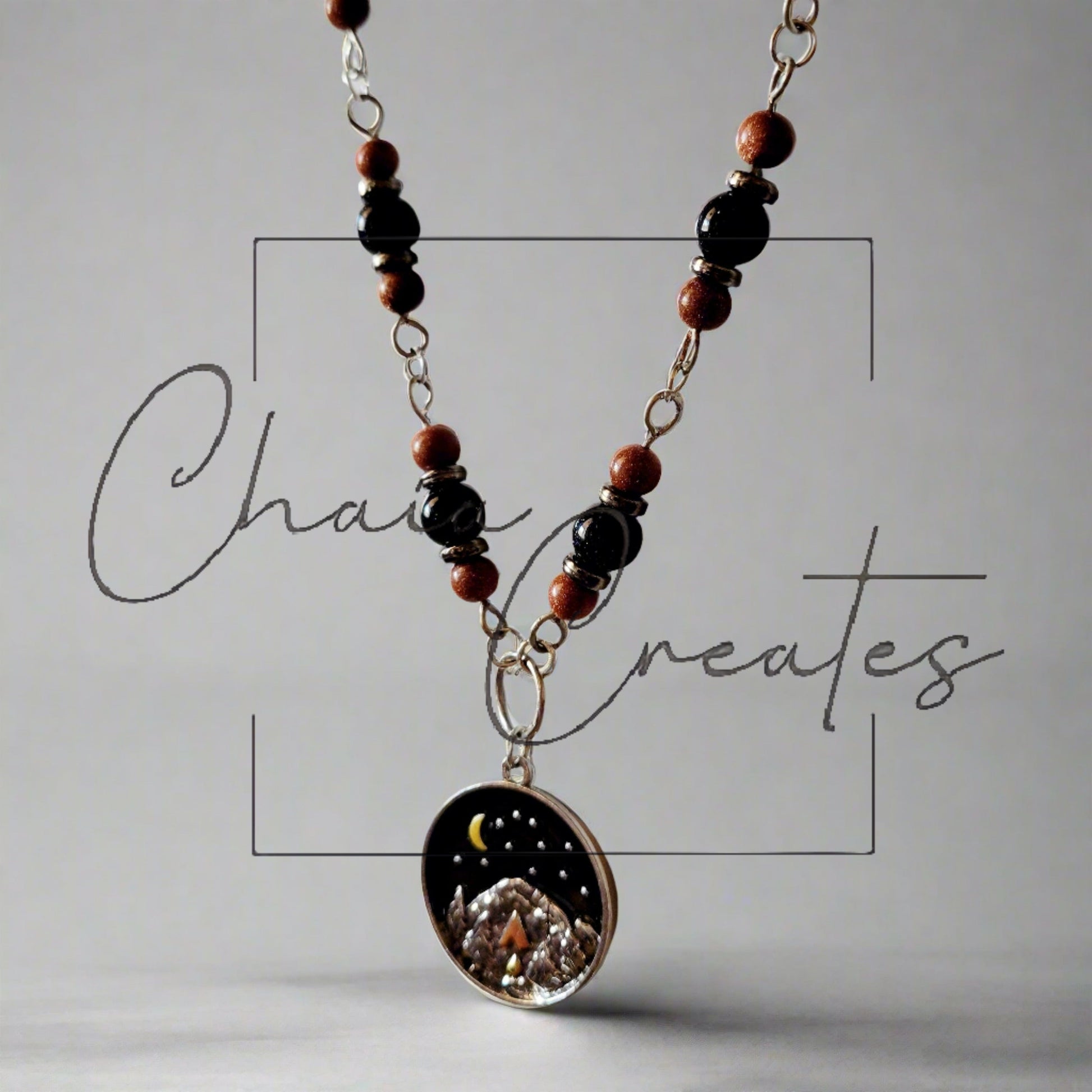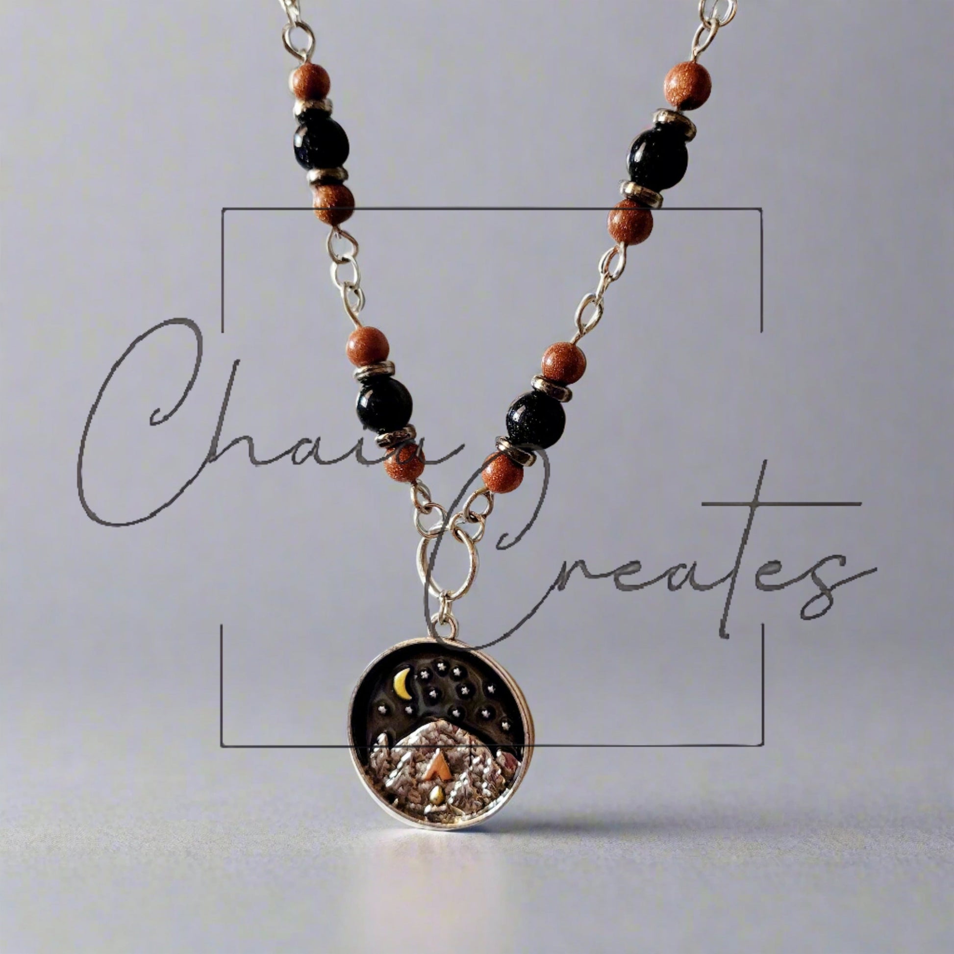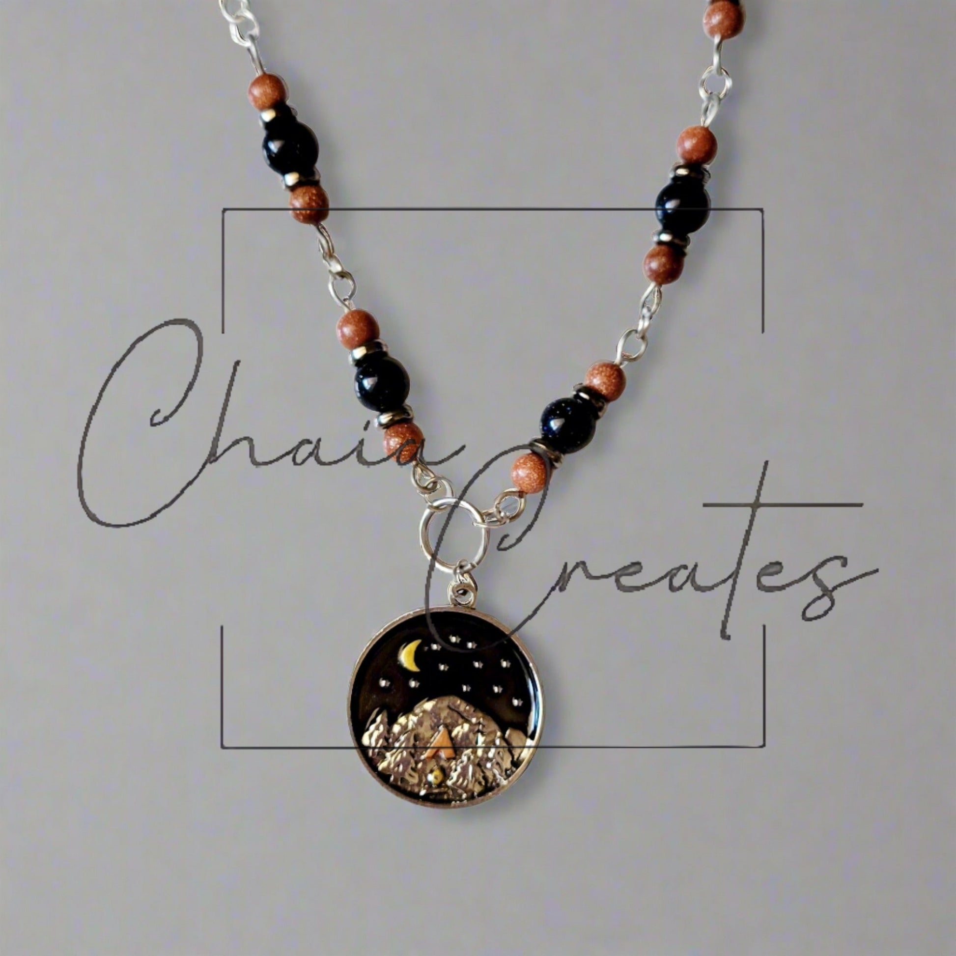 Experience the serene beauty of nature with our handcrafted Camping Pendant Necklace from Chaia Creates. This exquisite piece features a two-tone sandstone and silver design, beautifully capturing a detailed campsite and mountain scene.