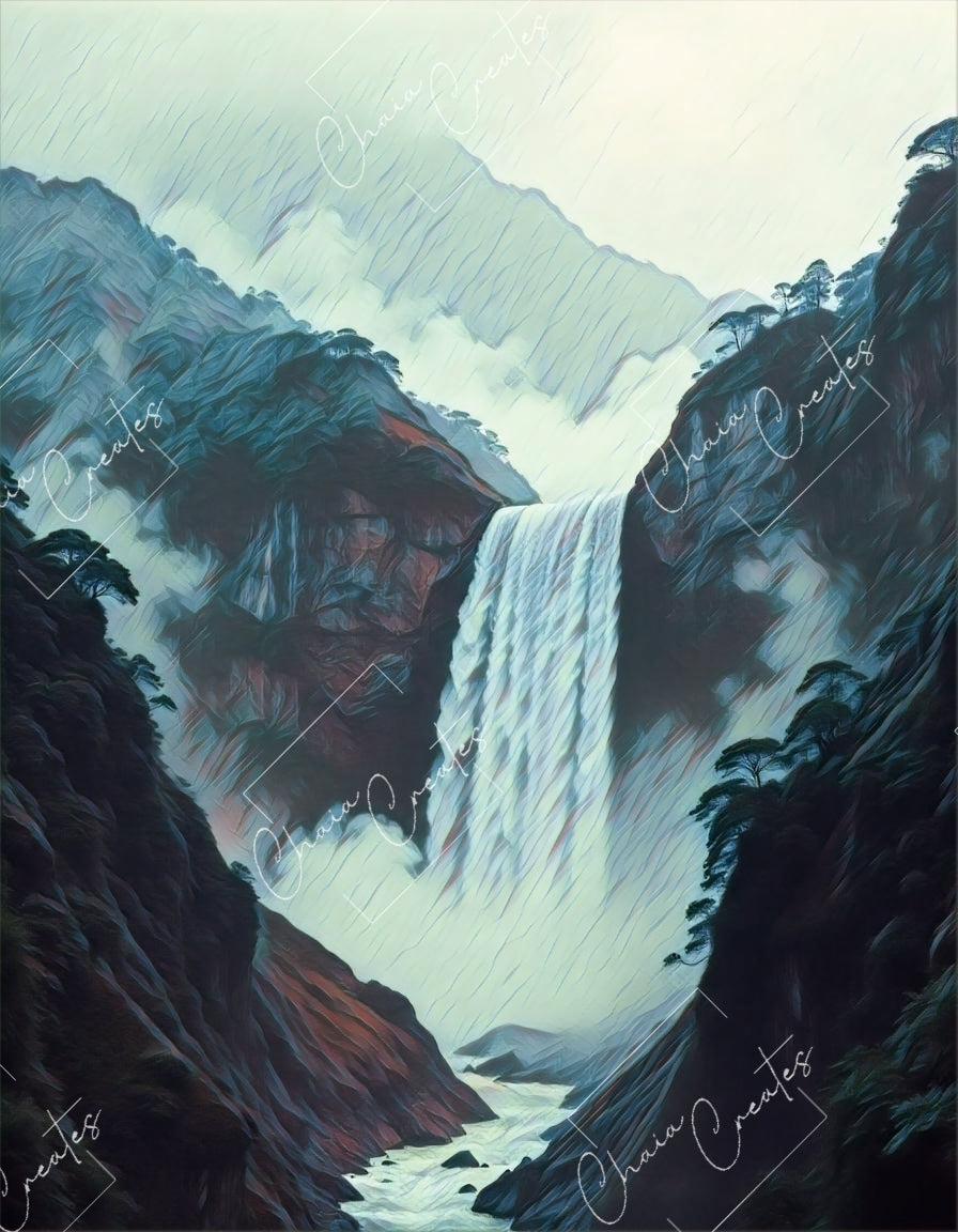 In Cascading Dreams, Chaia Malana takes viewers on a journey into the heart of nature’s wild beauty, portraying a towering waterfall that plummets gracefully into a misty valley. The scene is wrapped in an otherworldly, dreamlike atmosphere, where the jagged cliffs are softened by the dense fog that envelops the base of the falls. The cascade, vibrant and alive with motion, contrasts with the stillness of the surrounding mountains, drawing attention to the powerful force of water against the quiet strength of the landscape. Every detail, from the rushing water to the lush vegetation lining the cliffside, is crafted with a sense of reverence for the raw beauty of nature.