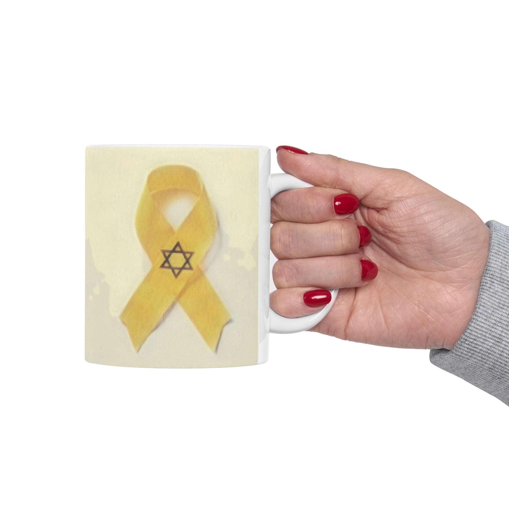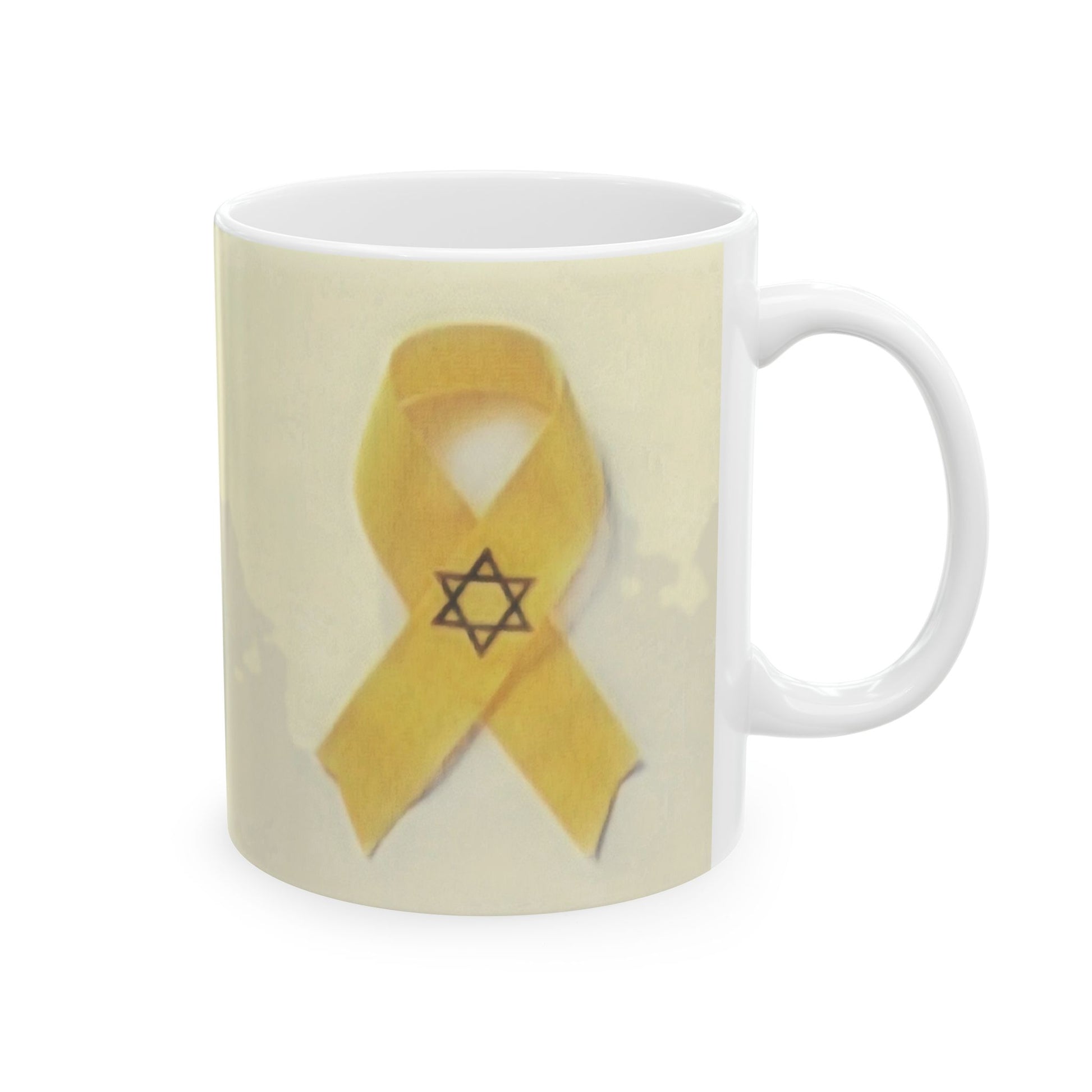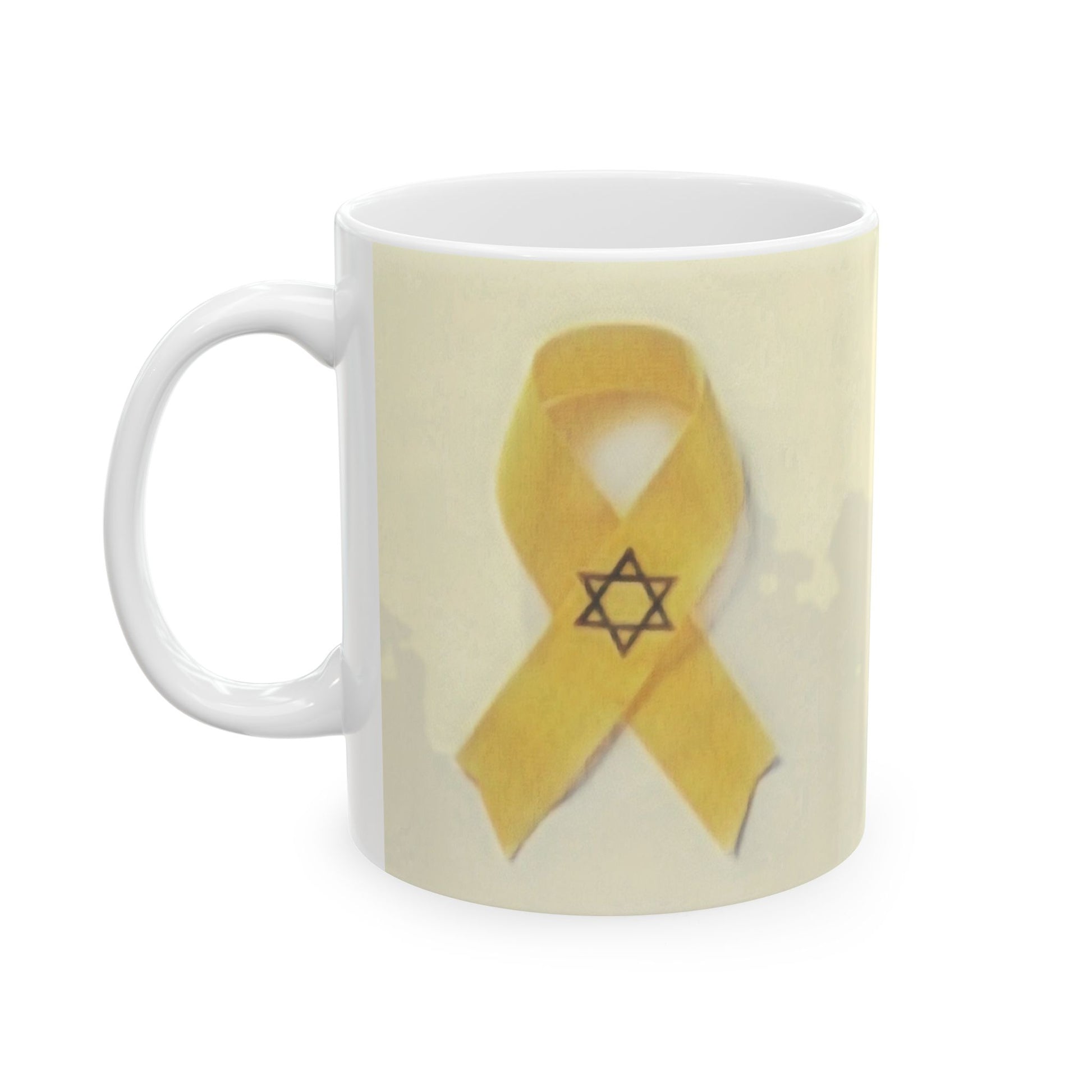 A heartfelt ceramic mug featuring a yellow ribbon and Star of David design, symbolizing solidarity and hope. Perfect for those seeking to show support and raise awareness for a cause, this mug exudes resilience and unity. Ideal for daily use or as a thoughtful gift for those affected by tragedies or in need of comfort.