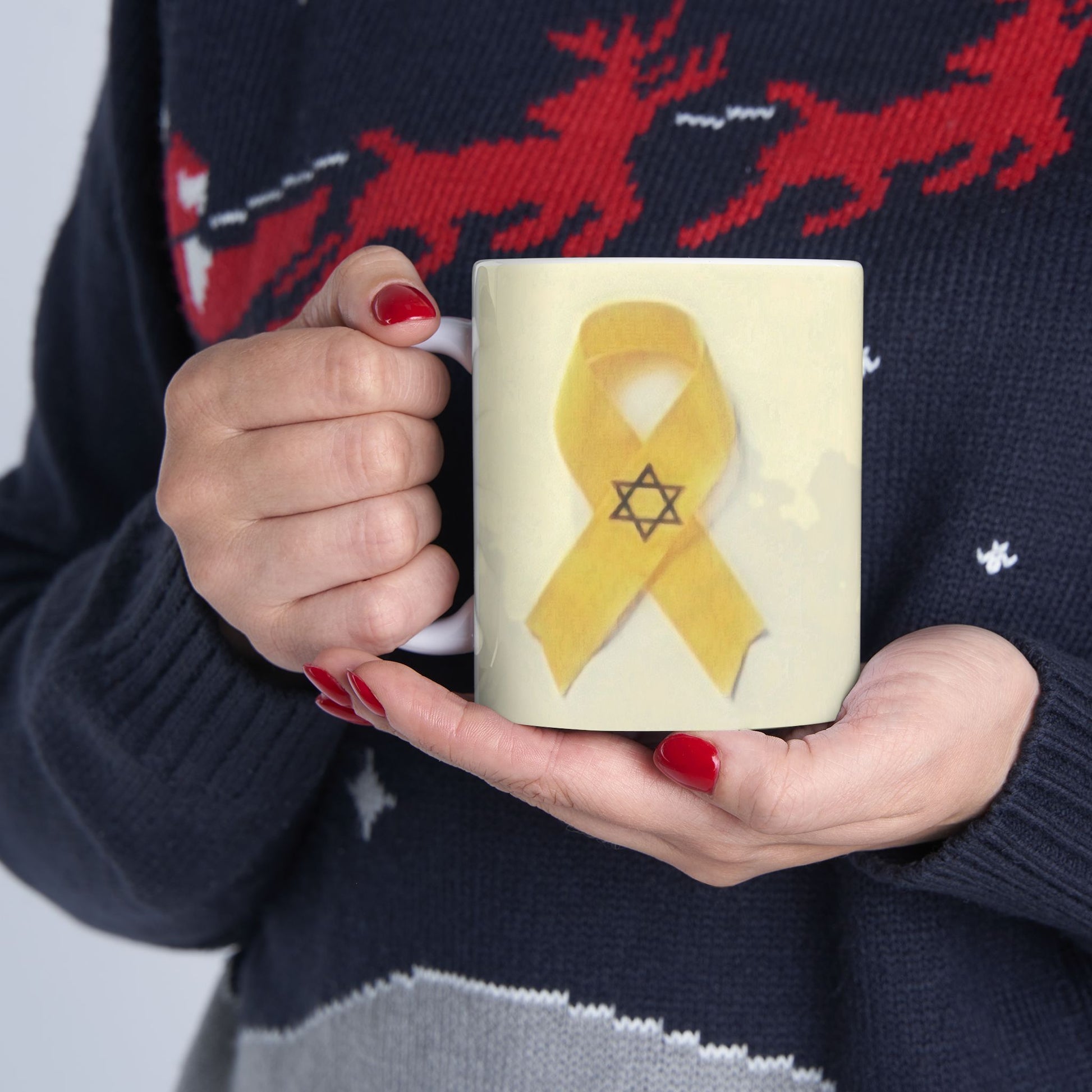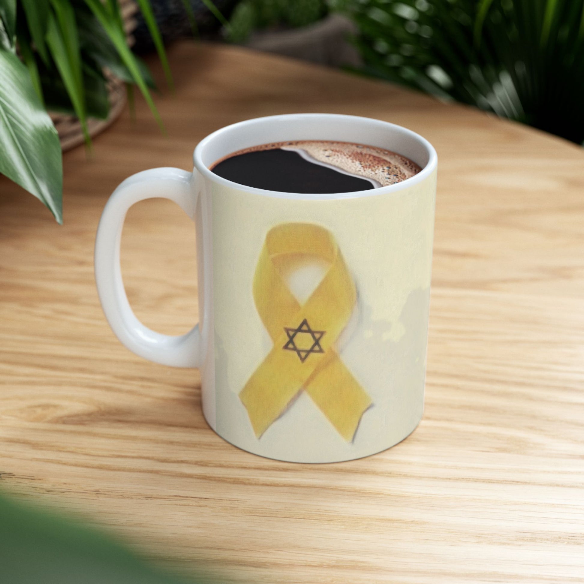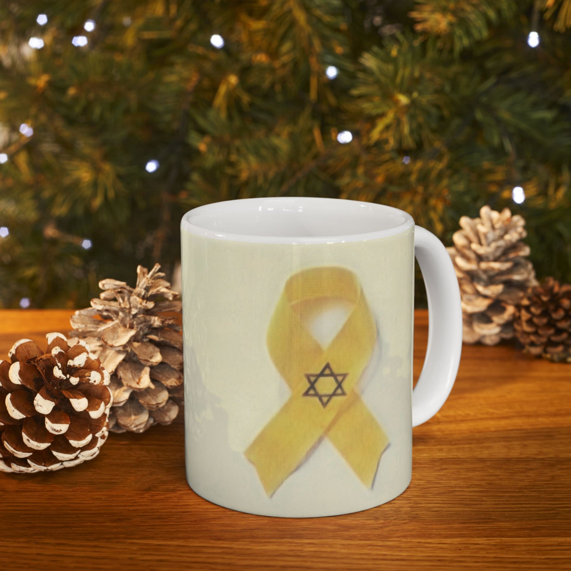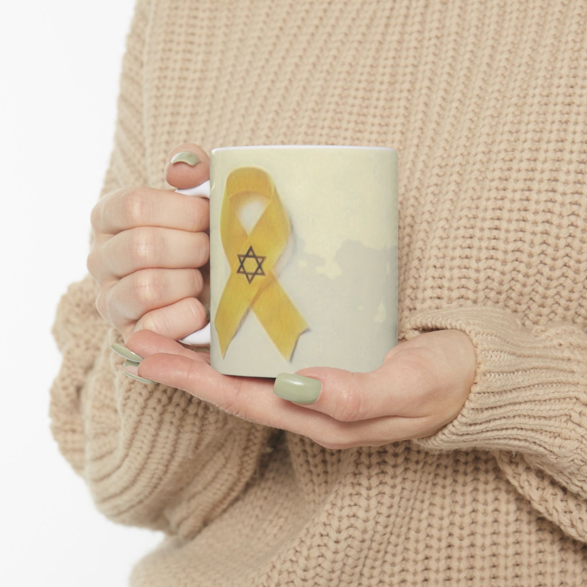 A heartfelt ceramic mug featuring a yellow ribbon and Star of David design, symbolizing solidarity and hope. Perfect for those seeking to show support and raise awareness for a cause, this mug exudes resilience and unity. Ideal for daily use or as a thoughtful gift for those affected by tragedies or in need of comfort.
