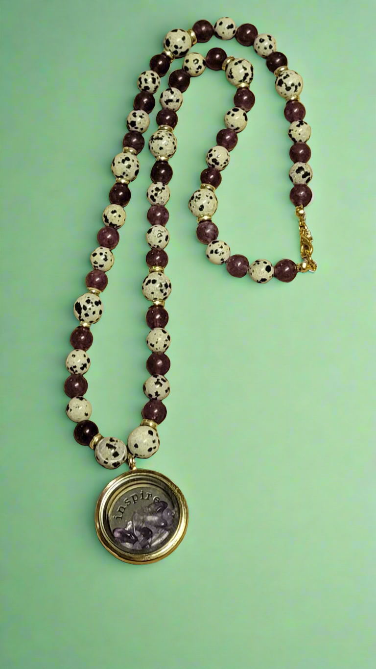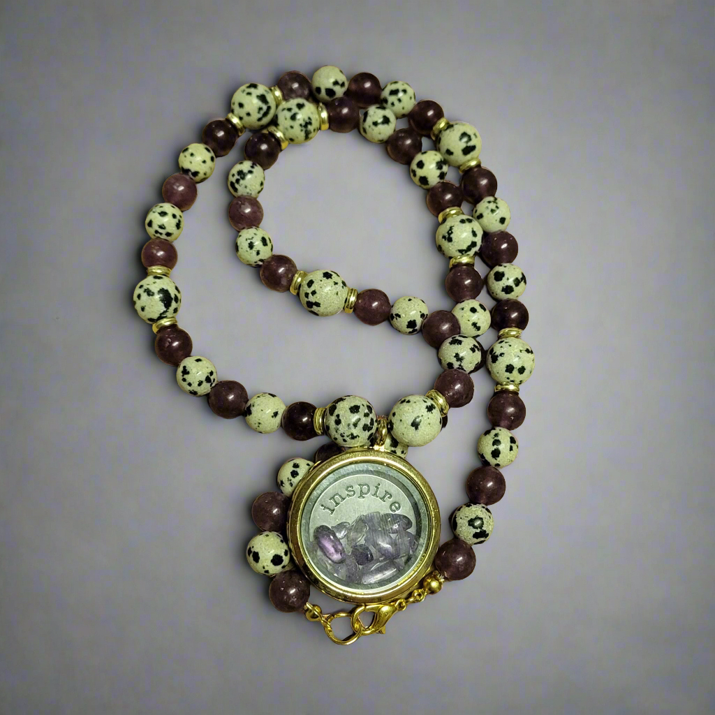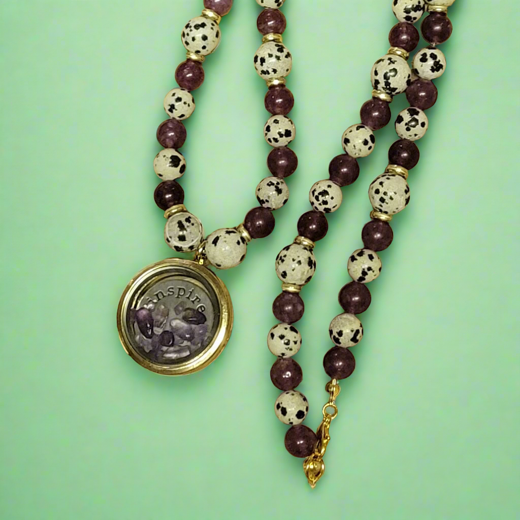 Speckle Stone Dalmatian Jasper Amethyst Wish Locket Amulet Necklace