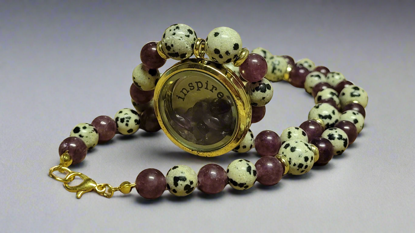 Unleash your creativity and inspiration with our Speckle Stone Dalmatian Jasper Amethyst Wish Locket Amulet Necklace. This unique piece combines the grounding properties of Dalmatian Jasper with the intuitive wisdom of Amethyst, providing the perfect canvas for your creative arts. Wear it as a constant reminder to embrace your inner muse and unlock your full potential.