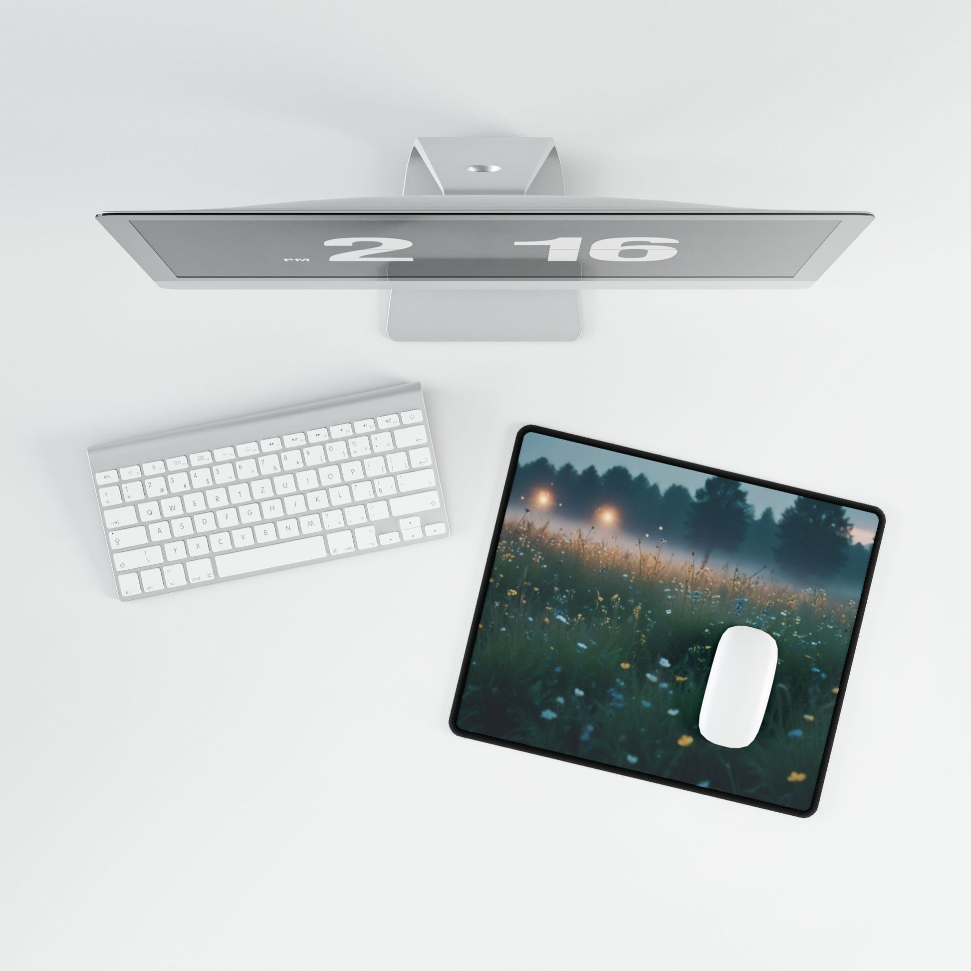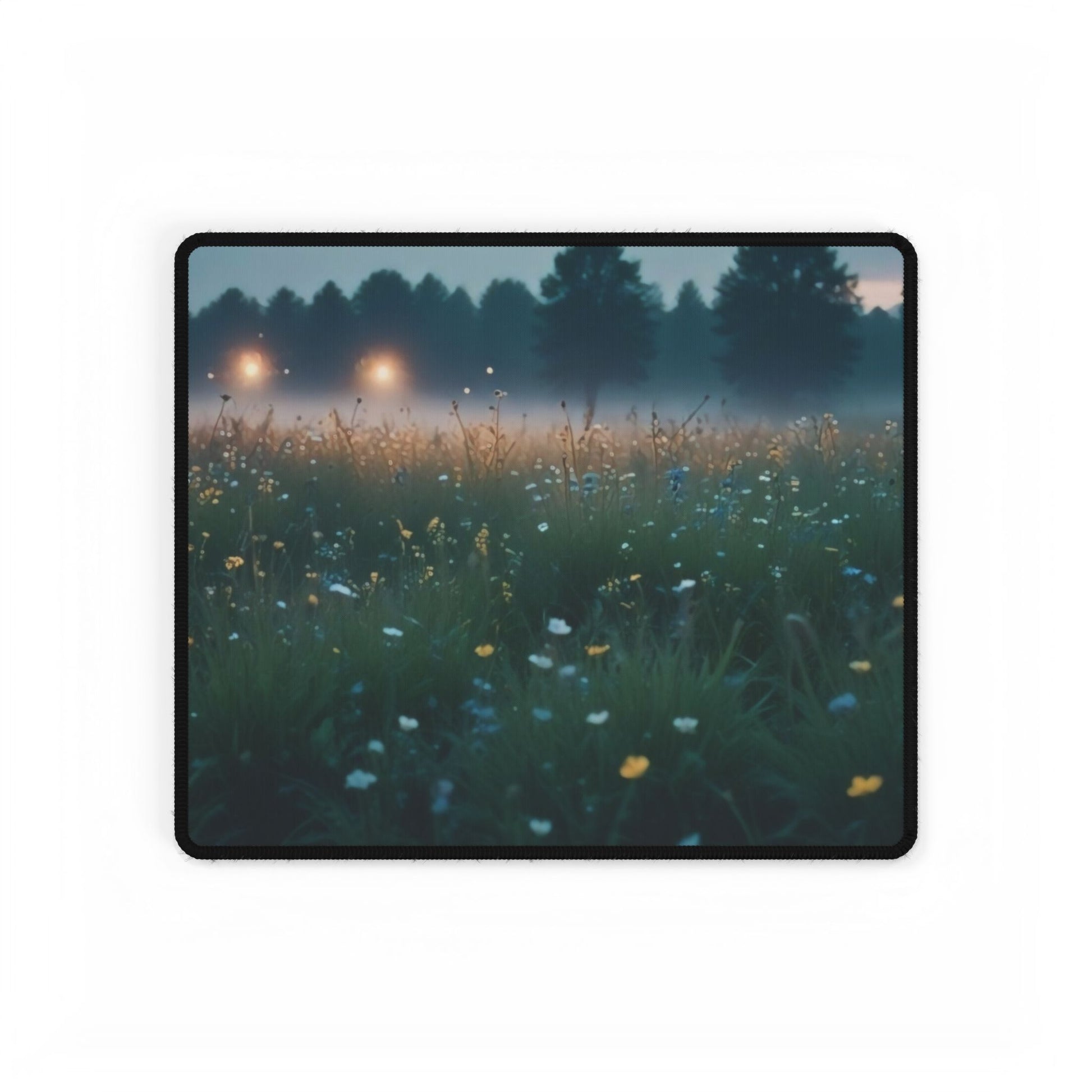A high-quality desk mat featuring a mist-covered meadow with delicate wildflowers swaying under a cool twilight sky. The vibrant colors and mysterious ambiance evoke curiosity and wonder, perfect for nature lovers and those who appreciate a touch of the unknown. Ideal for adding a serene yet intriguing vibe to any workspace, this desk mat is relevant for springtime, Earth Day, or as a unique gift for someone who enjoys peaceful scenes.