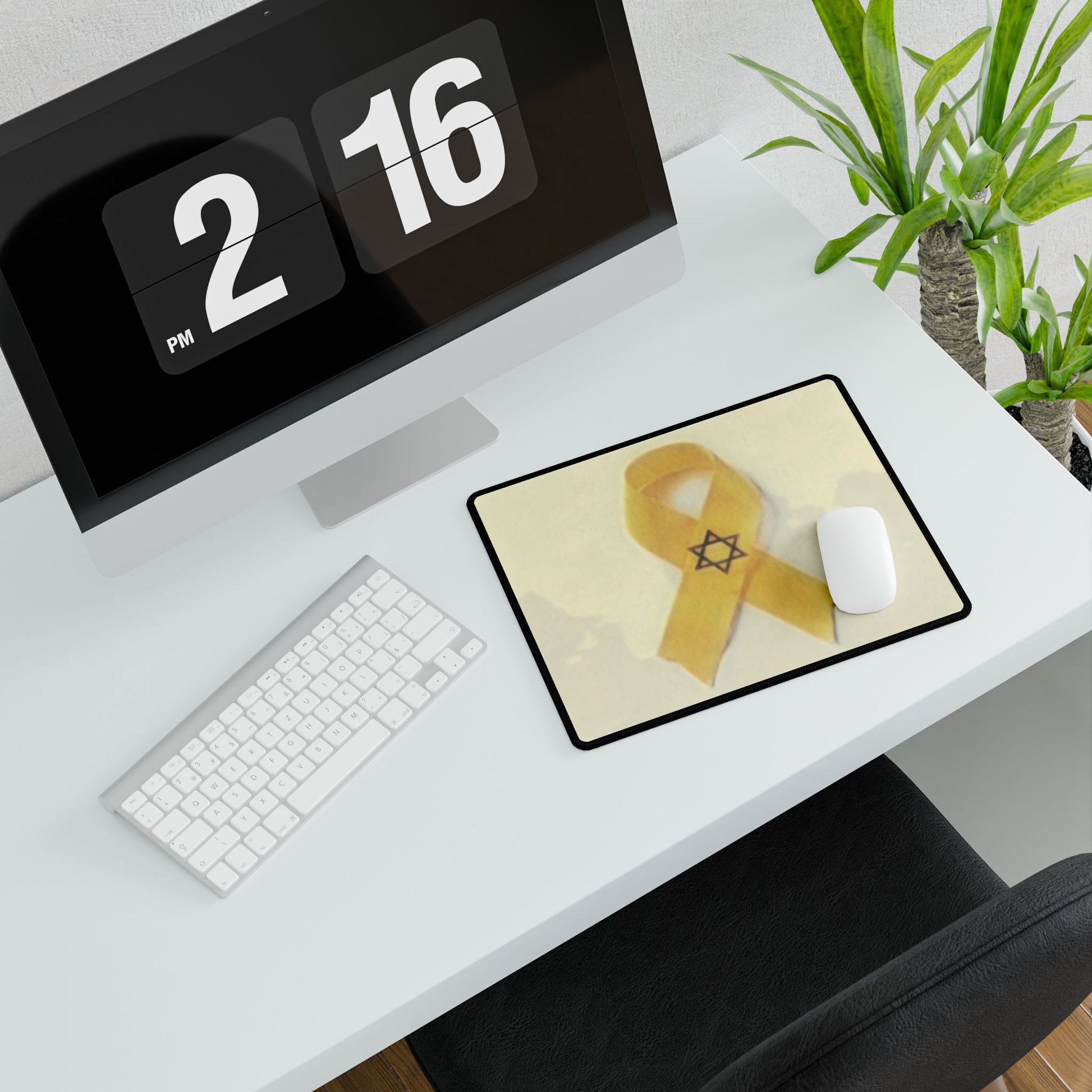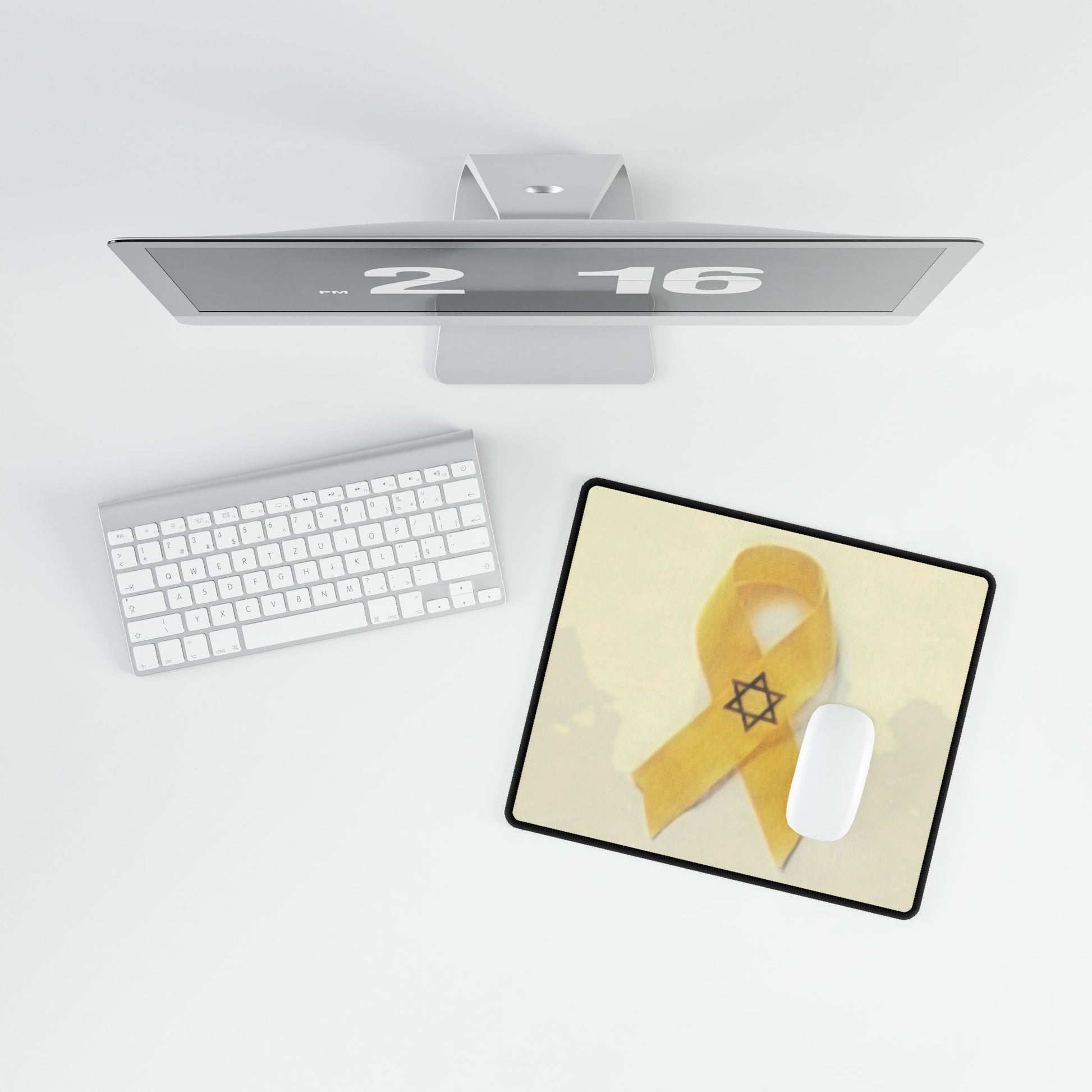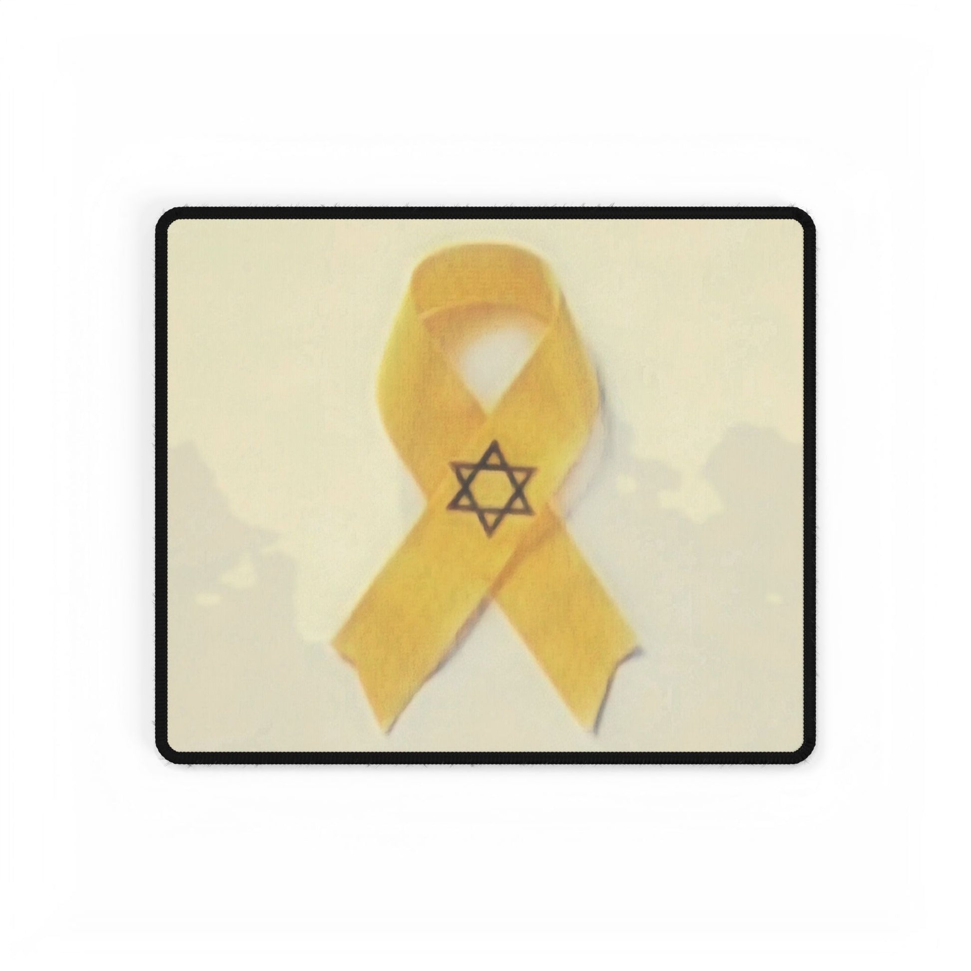 A vibrant yellow ribbon design mouse pad that says 'Bring Them Home Now', perfect for those who support bringing home the hostages taken on Oct 7, 2023. The mouse pad provides a smooth and even surface for effortless mouse gliding, making it ideal for both work and gaming. Relevant for supporters of hostage release and patriotic individuals.