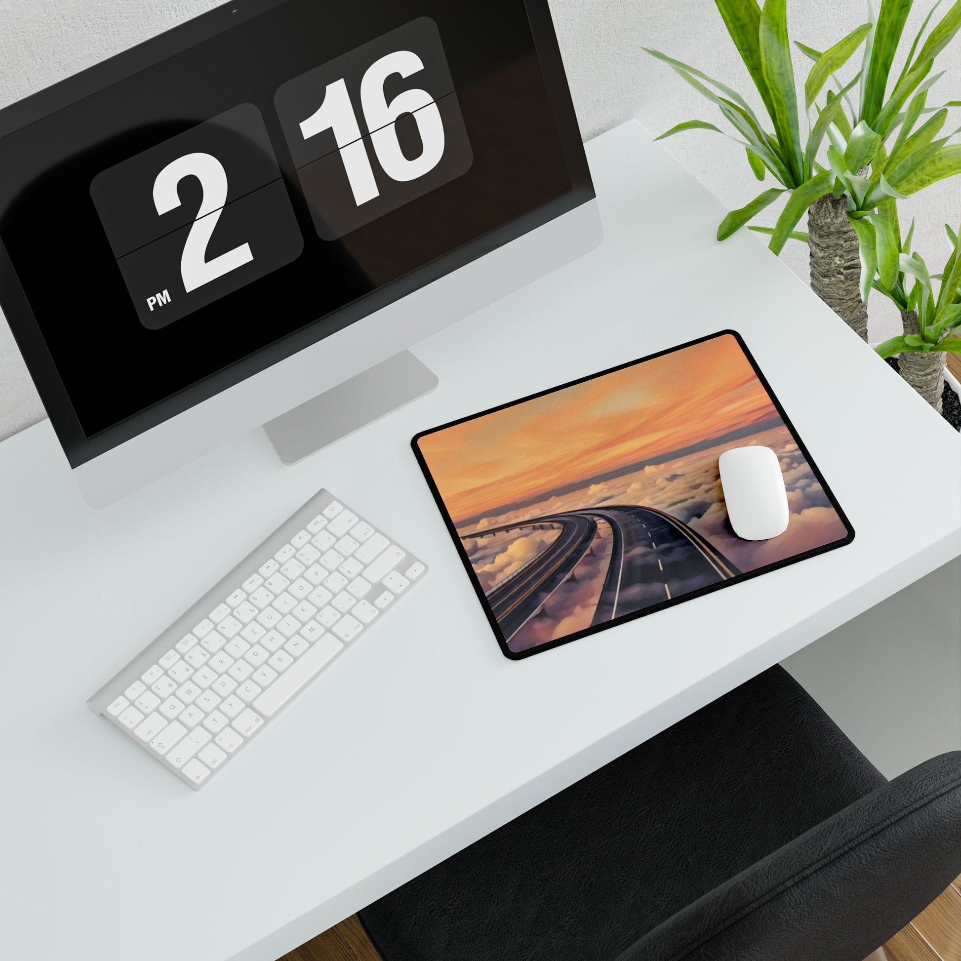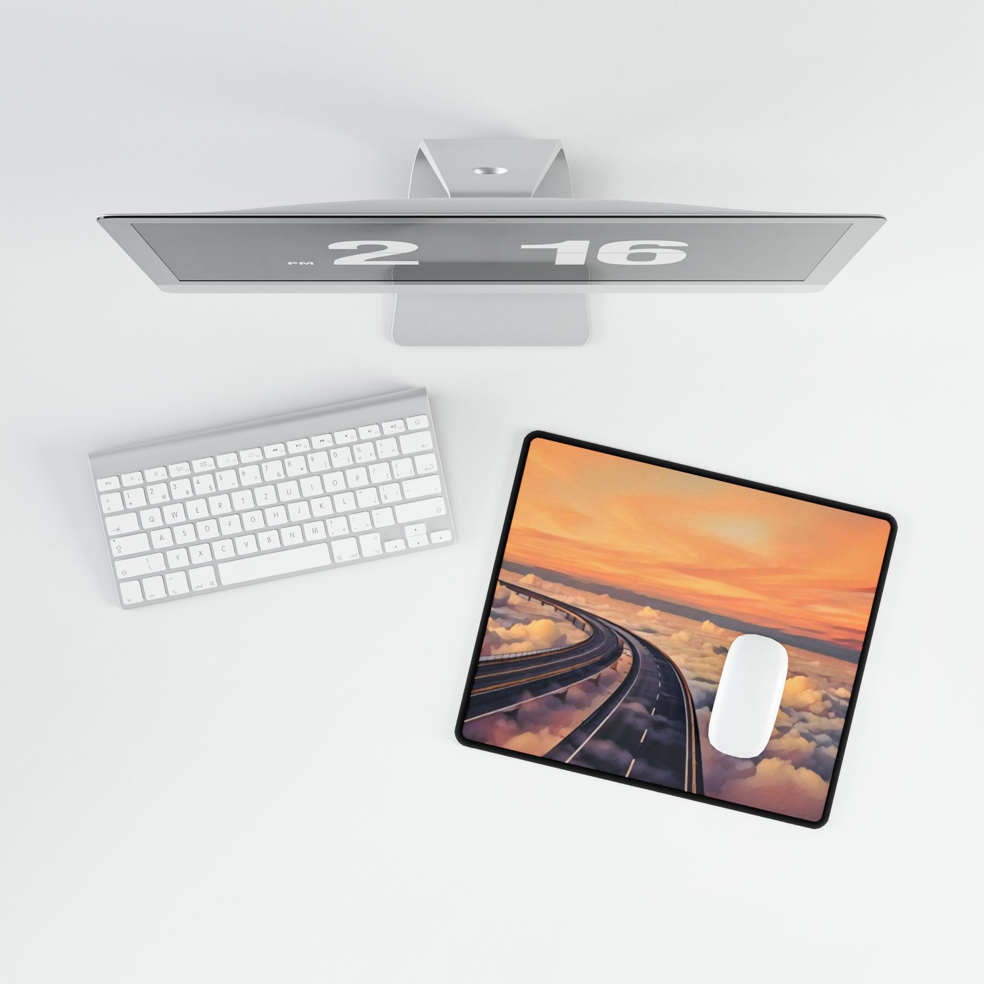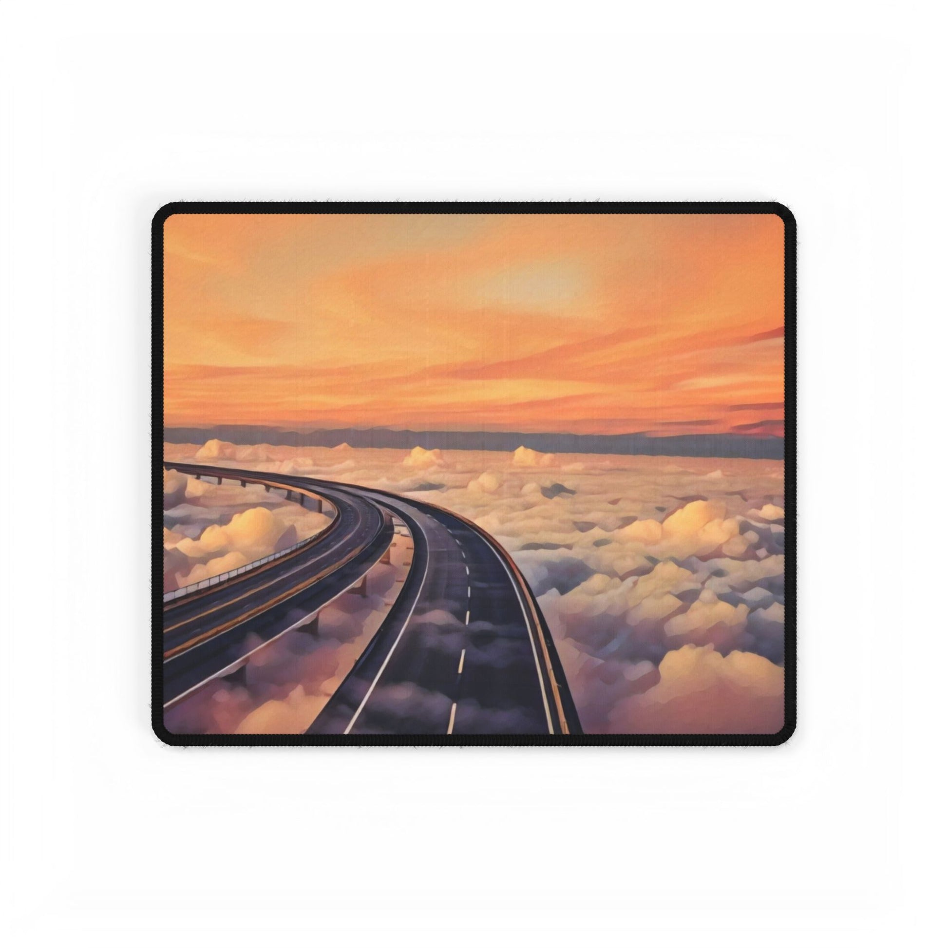Capture the allure of adventure and quiet peace with this ethereal mouse pad featuring a road stretching high above the clouds, painted in soft shades of peach, gold, and lavender. The vibrant sunset creates a dreamlike atmosphere, symbolizing freedom, aspiration, and the pursuit of dreams beyond what seems possible. Perfect for those who seek inspiration and a sense of calm in their workspace. Ideal for artists, writers, and dreamers. Relevant for birthdays, graduation, and new job celebrations.
