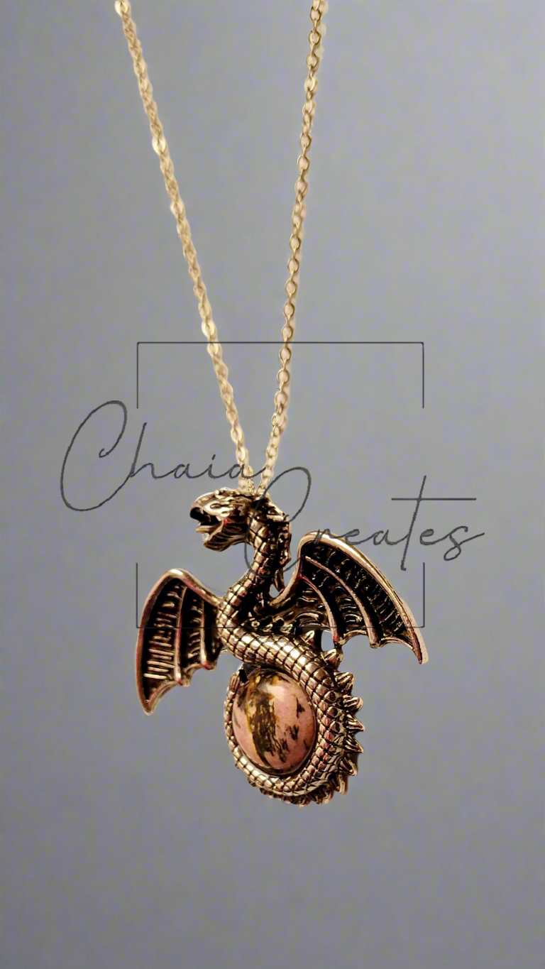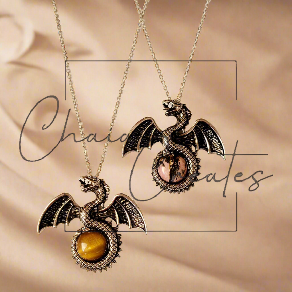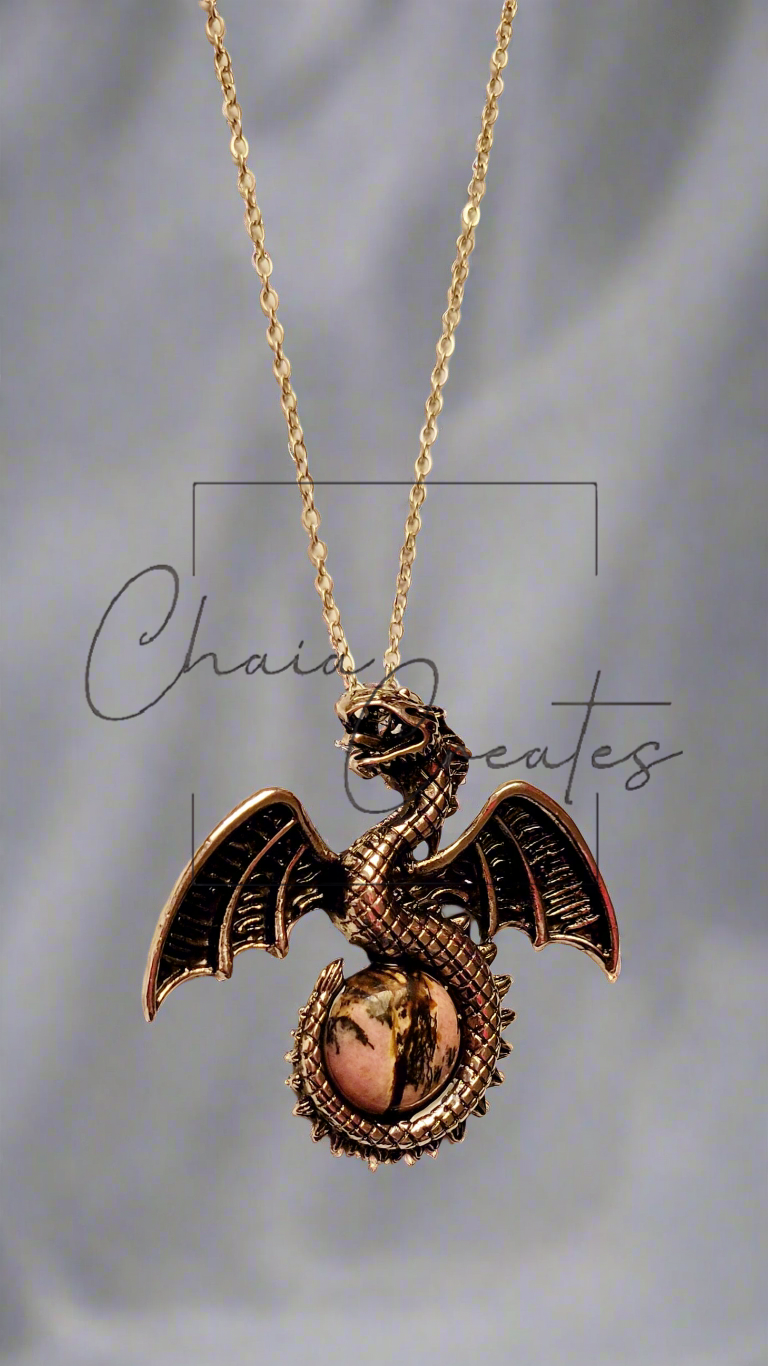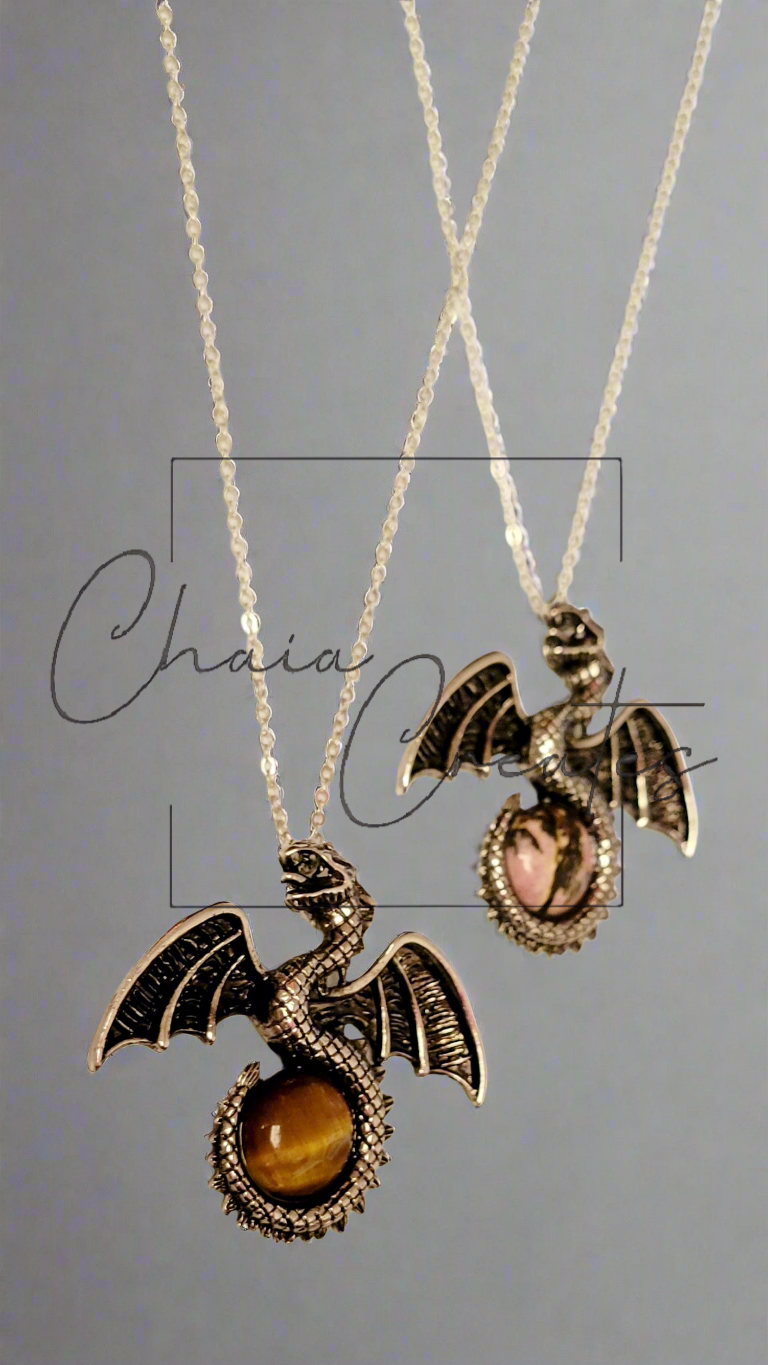 Unleash your inner warrior with our stunning Dragon Pendant Necklace, where mythical elegance meets earthy beauty. This necklace features a fierce dragon with its tail protectively coiled around a mesmerizing gemstone, available in two captivating options: the calming, rose-pink hues of Rhodonite or the warm, golden-brown swirls of Tiger's Eye. Made from high-quality metal alloy, this pendant hangs gracefully on a durable chain, making it a versatile accessory for any outfit or occasion.