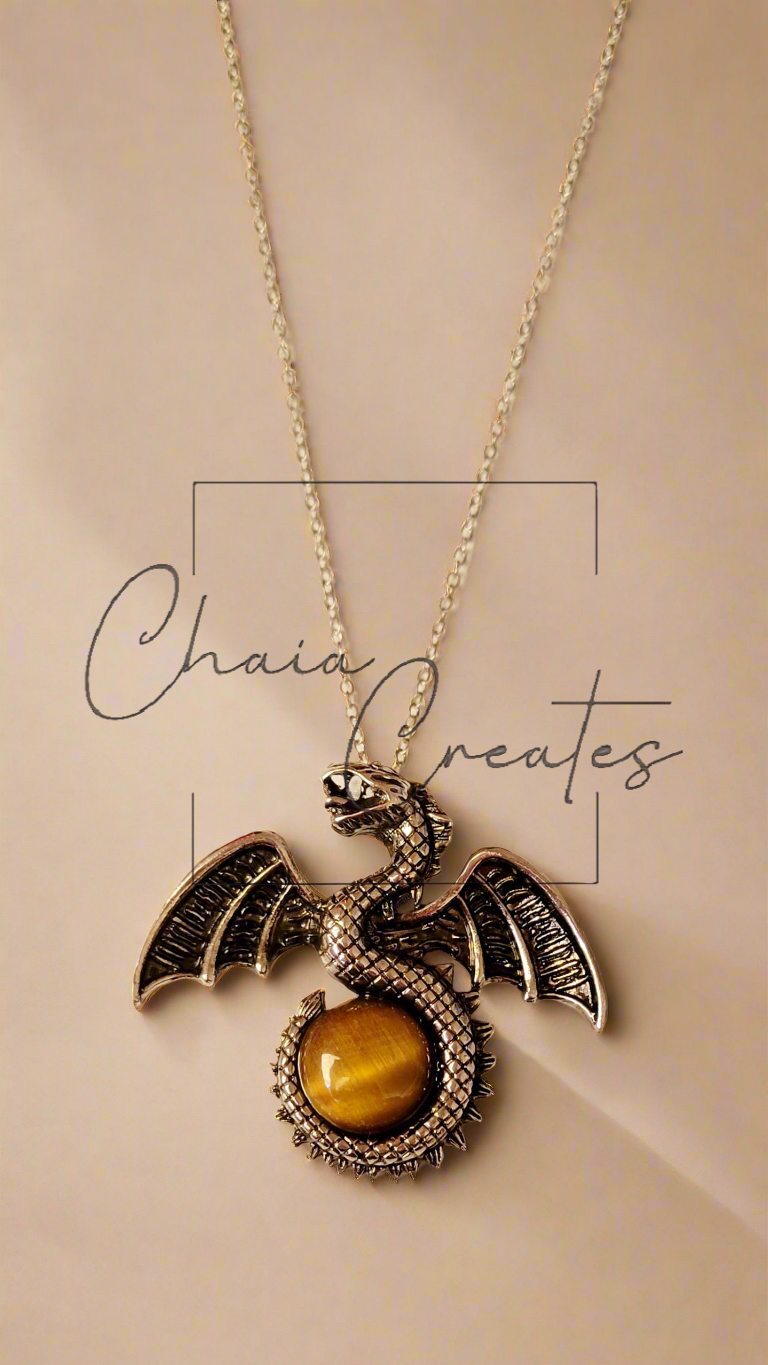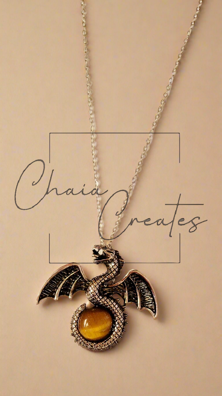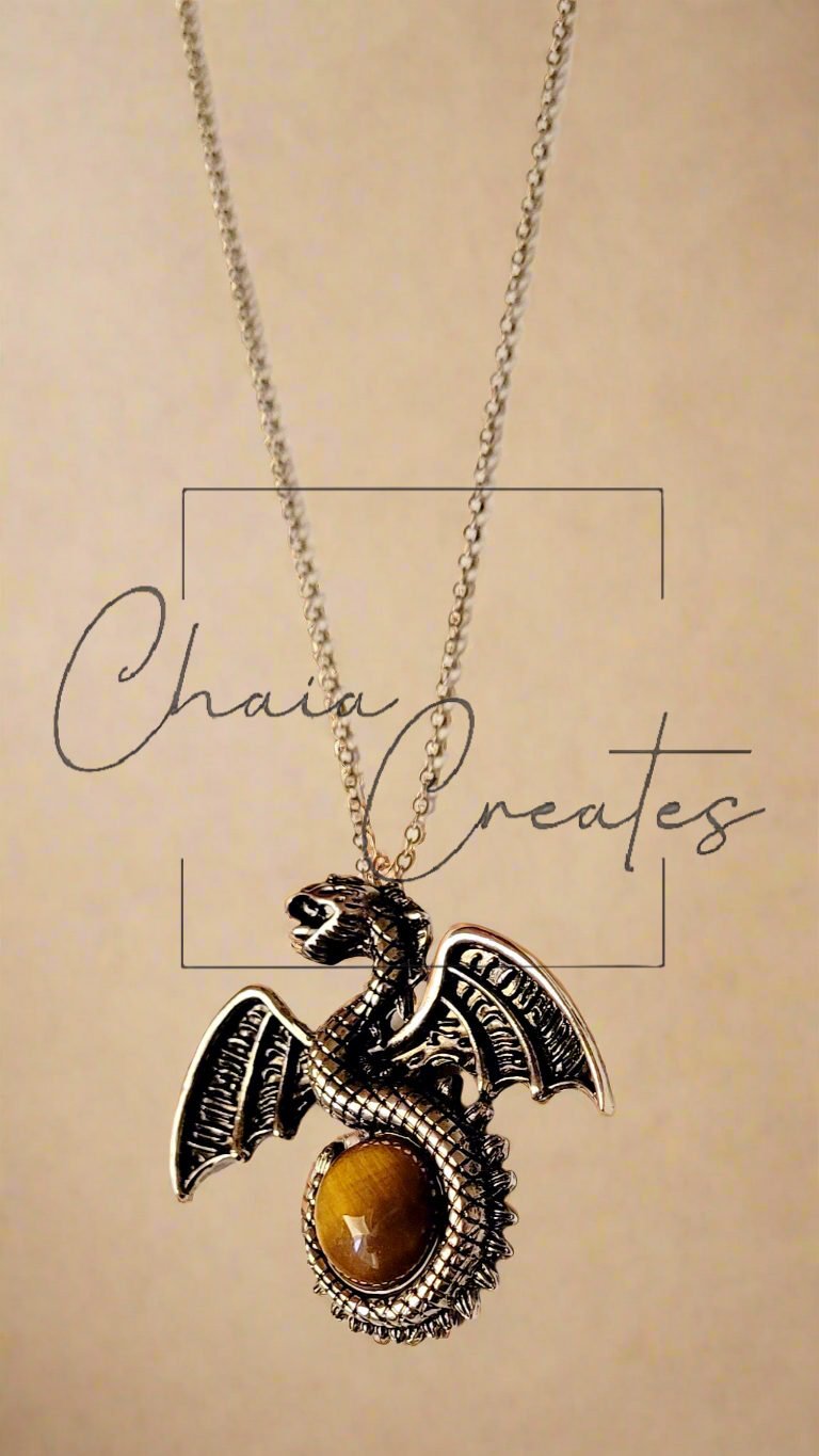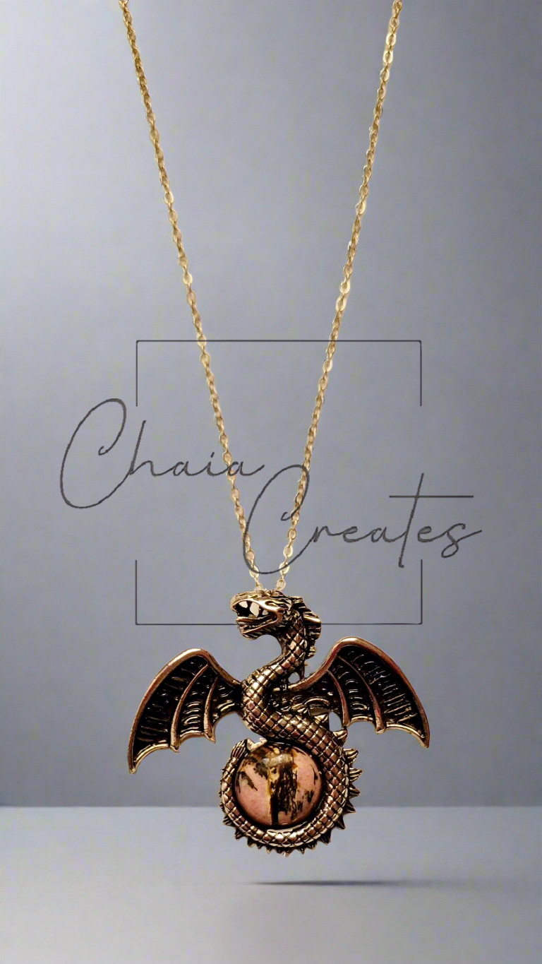Unleash your inner warrior with our stunning Dragon Pendant Necklace, where mythical elegance meets earthy beauty. This necklace features a fierce dragon with its tail protectively coiled around a mesmerizing gemstone, available in two captivating options: the calming, rose-pink hues of Rhodonite or the warm, golden-brown swirls of Tiger's Eye. Made from high-quality metal alloy, this pendant hangs gracefully on a durable chain, making it a versatile accessory for any outfit or occasion.