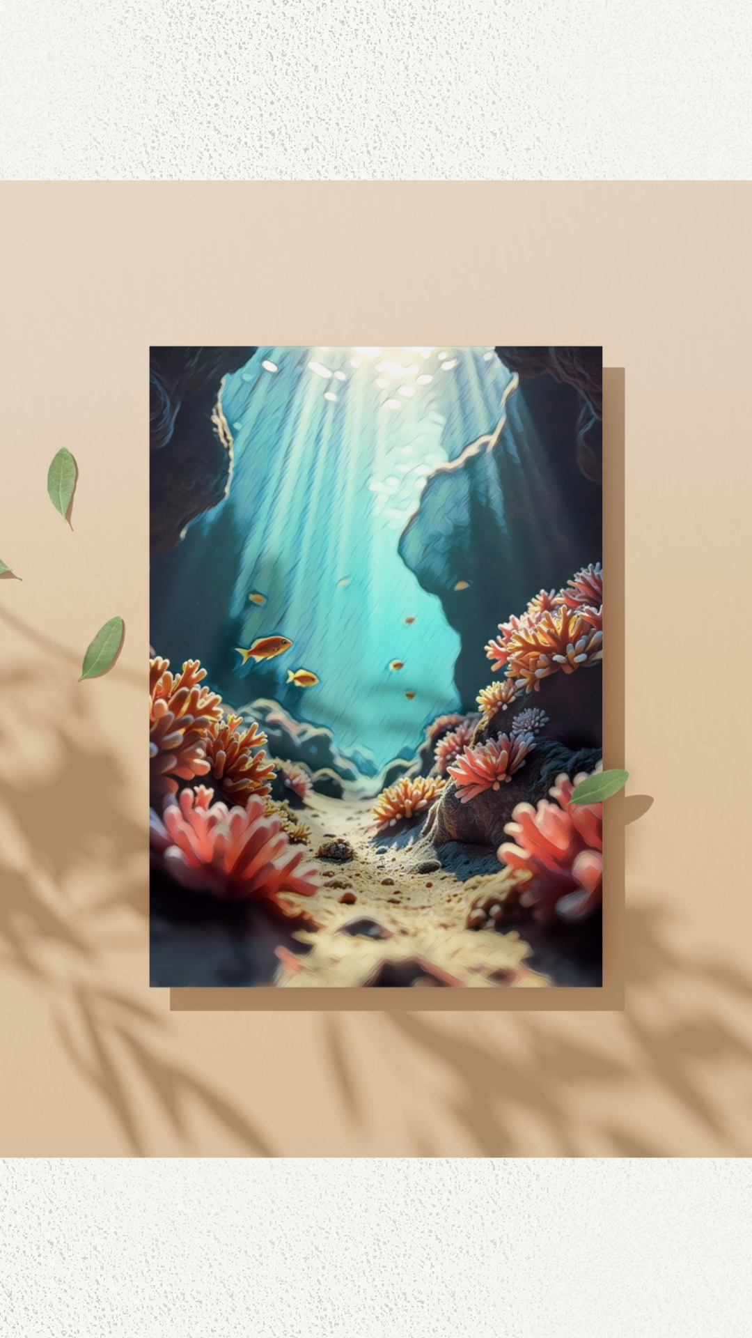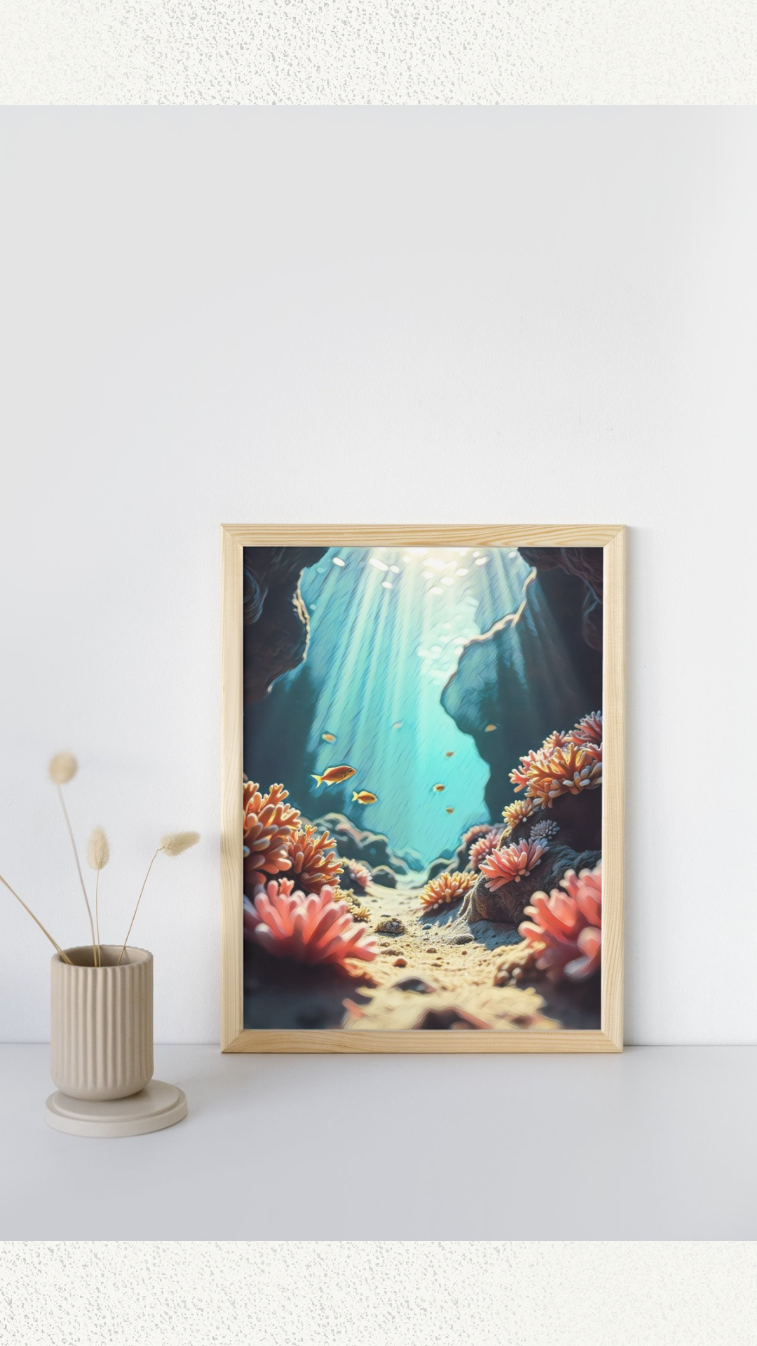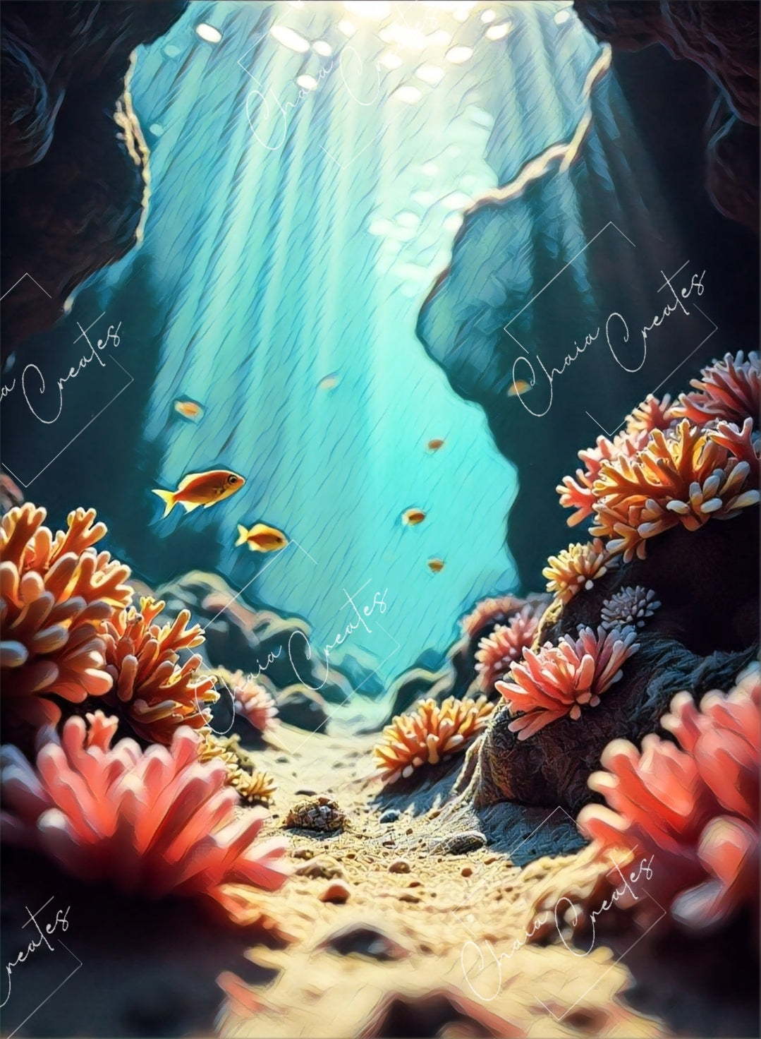 This artwork captures the breathtaking beauty of an underwater haven, where beams of sunlight pierce through the gentle surface and illuminate a secluded coral enclave. Vibrant pink and orange corals adorn the ocean floor, creating a stunning pathway that guides the eye deeper into the tranquil scene. Tiny, golden fish swim gracefully, gliding through the crystalline water with effortless elegance, as if inviting the viewer to explore the serenity of their world.