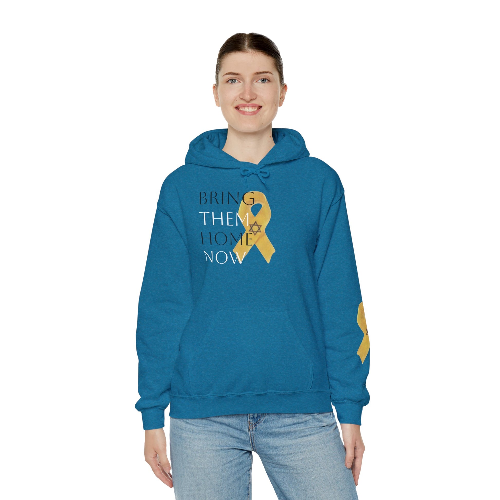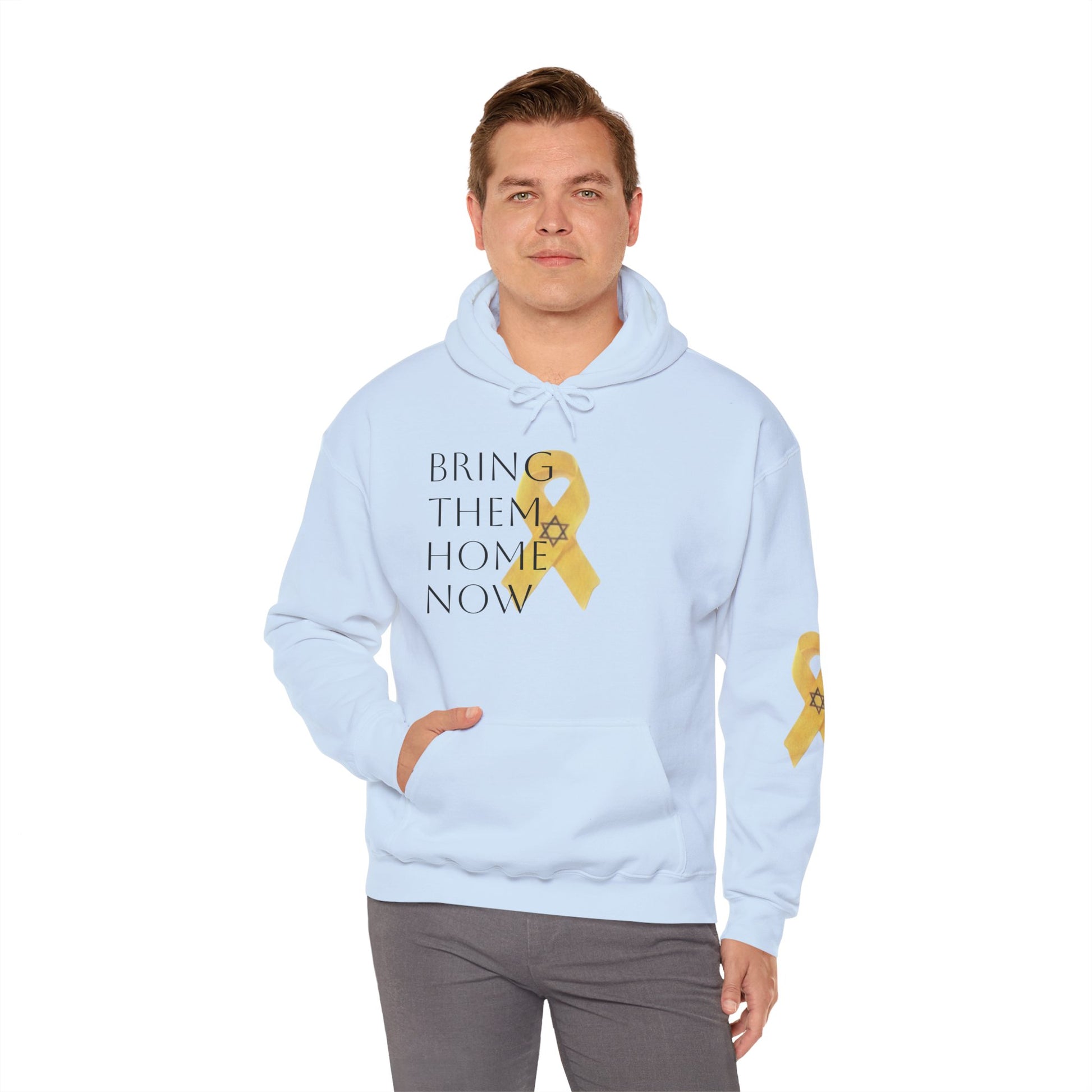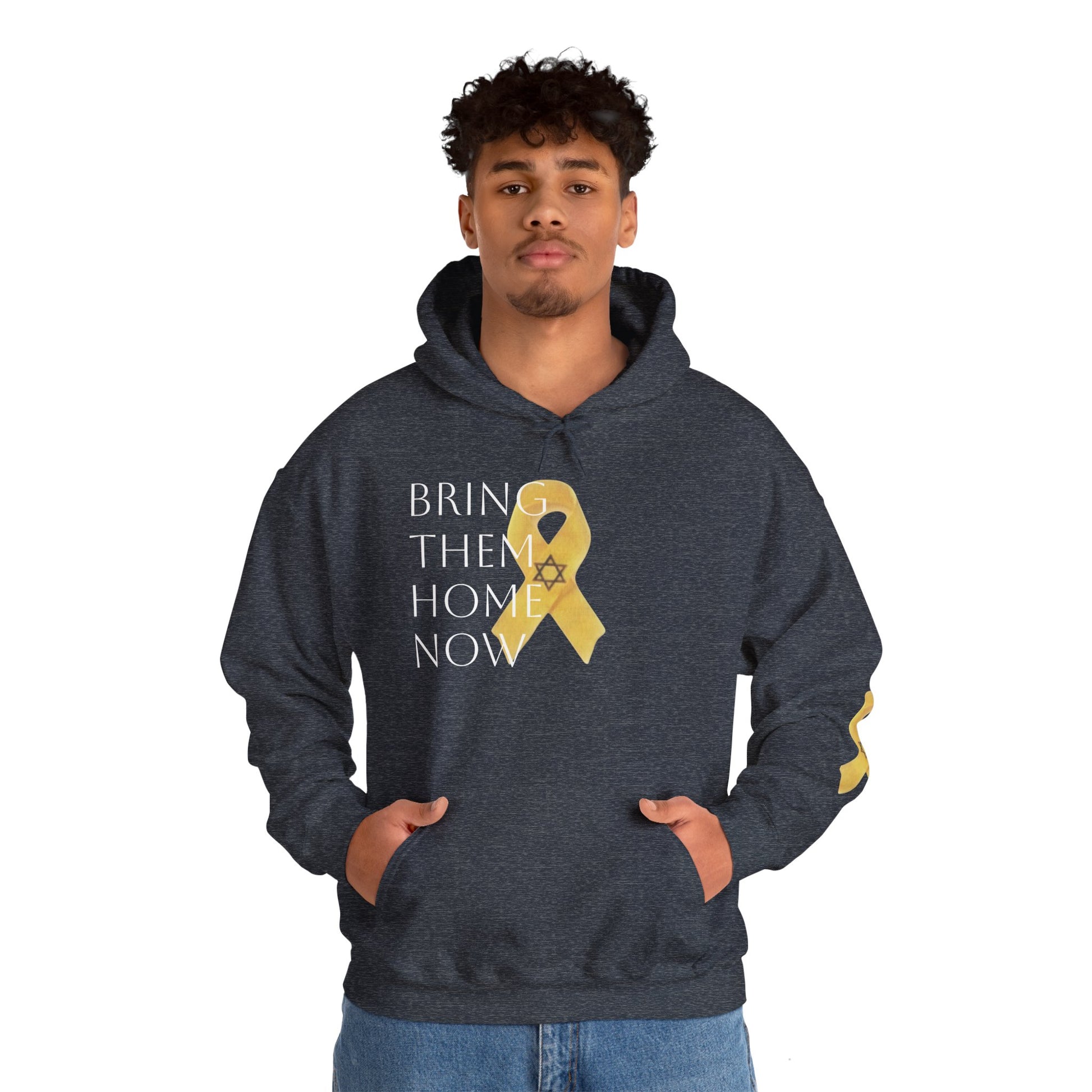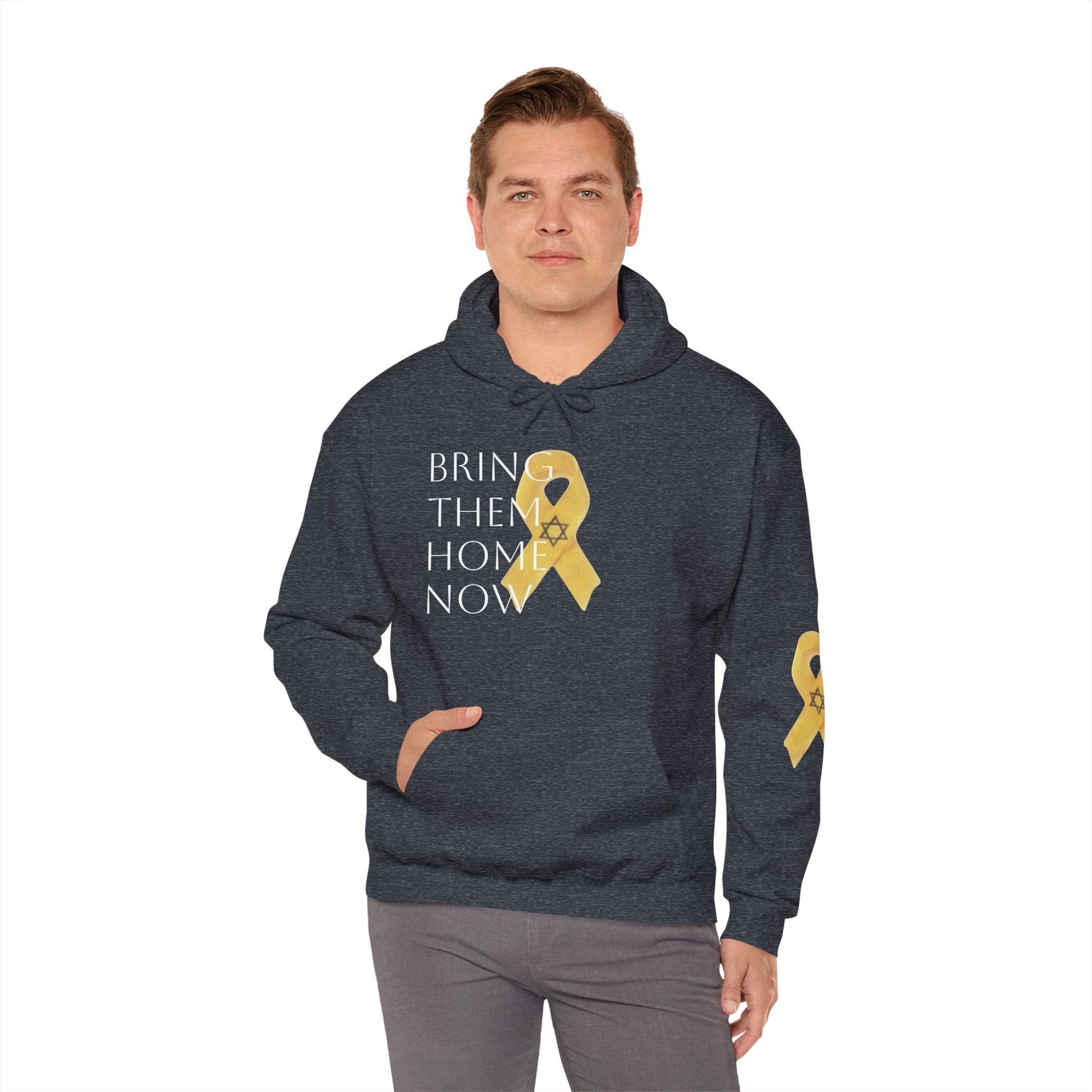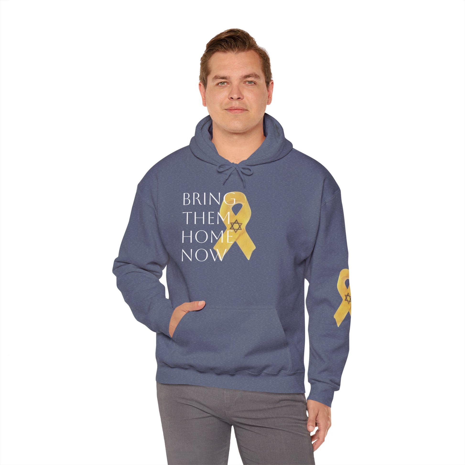 Stay warm and stylish with this Unisex Heavy Blend™ Hoodie featuring a yellow ribbon design that says "Bring Them Home Now". Perfect for those who support bringing home the hostages taken on Oct. 7, 2023.