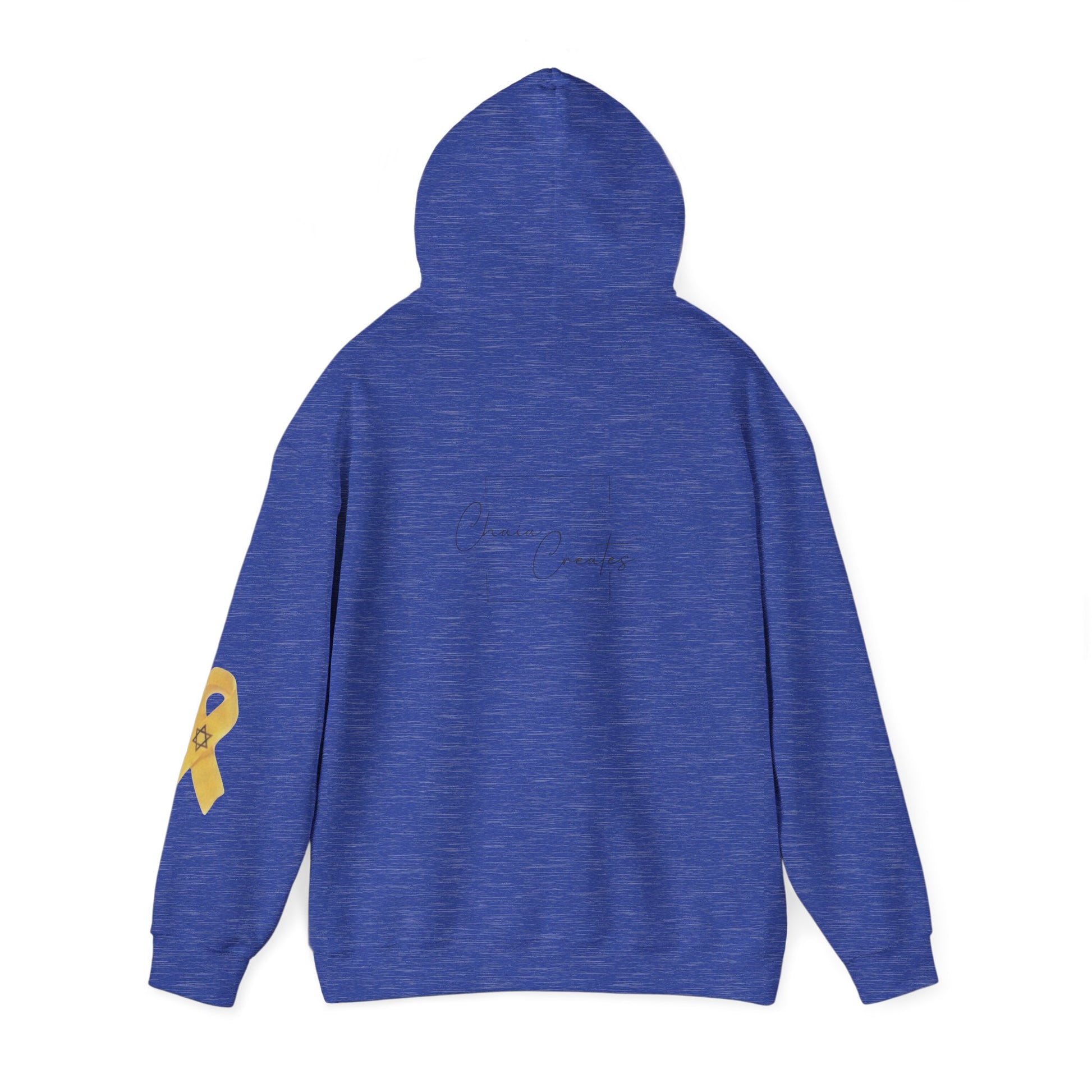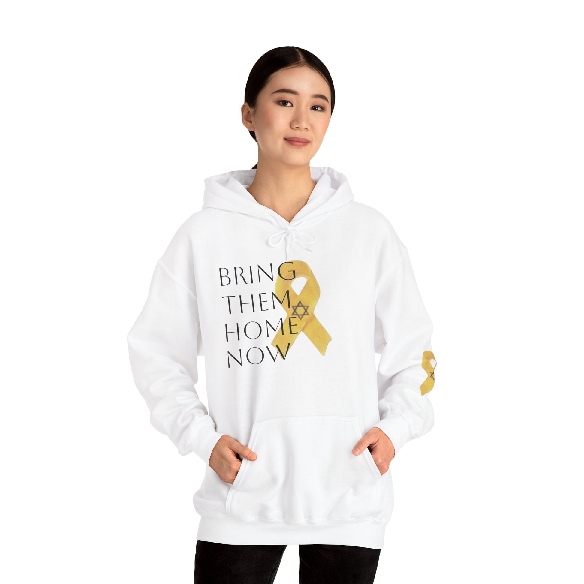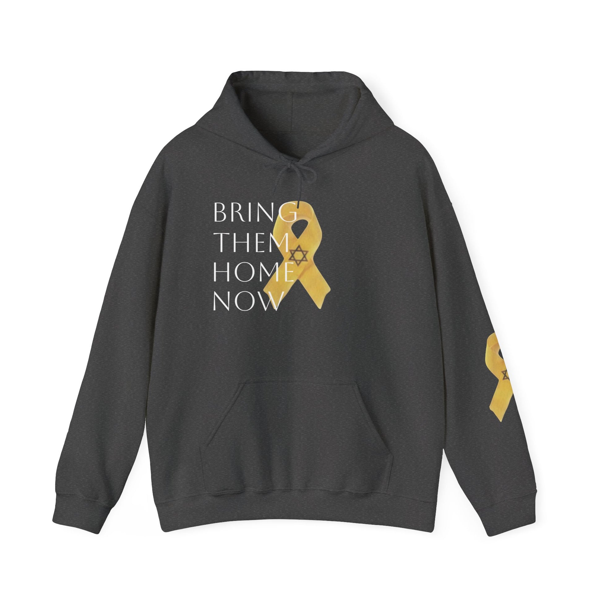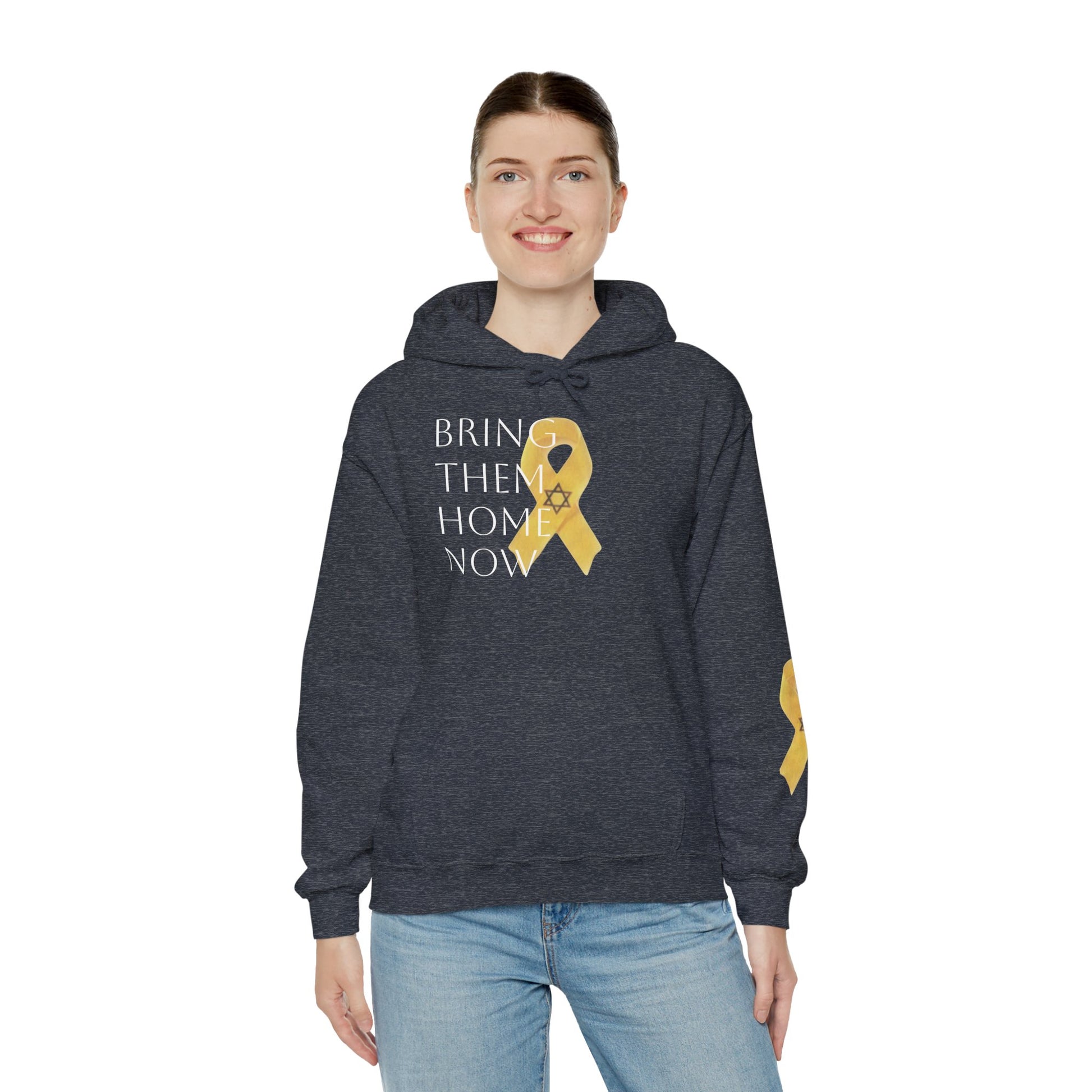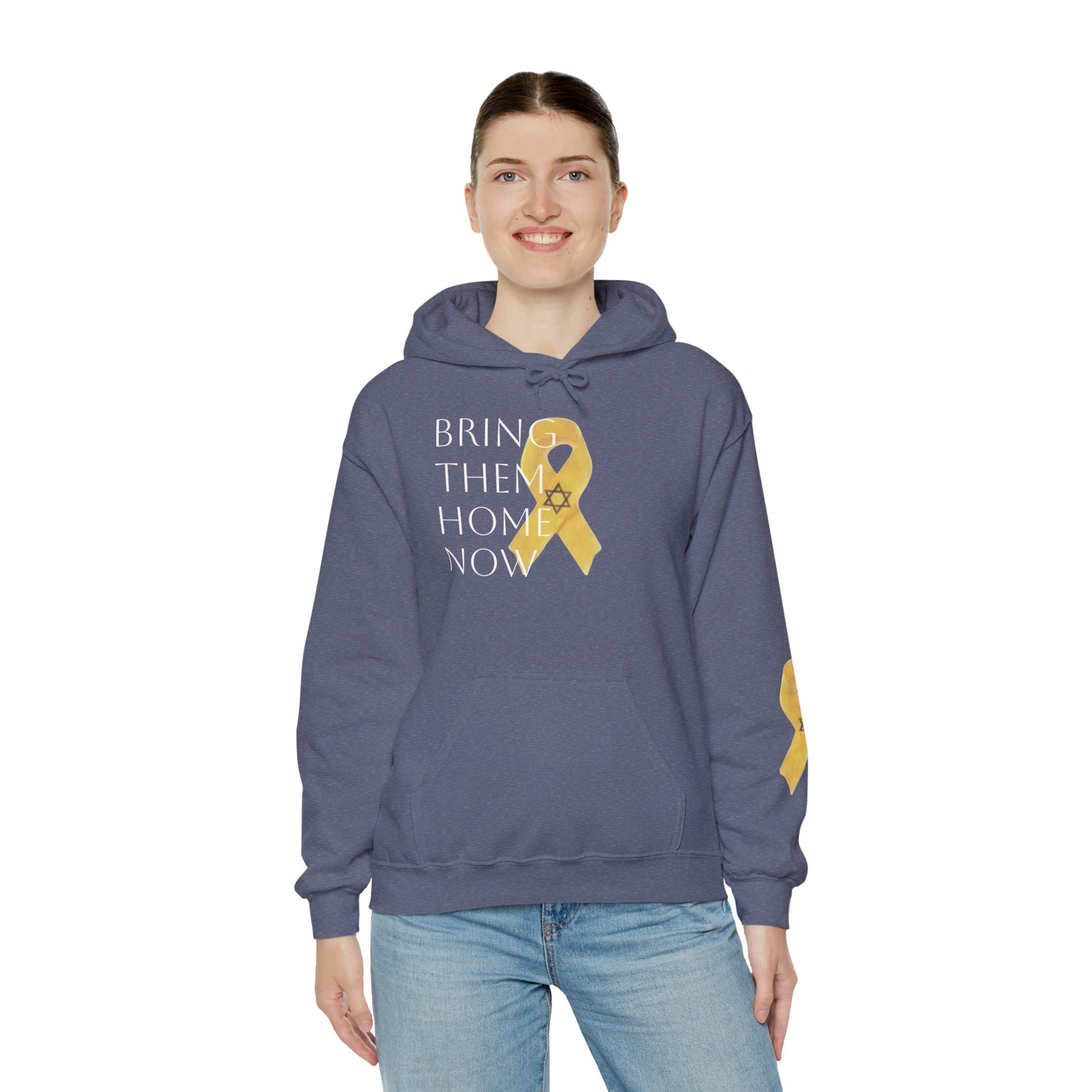 Stay warm and stylish with this Unisex Heavy Blend™ Hoodie featuring a yellow ribbon design that says "Bring Them Home Now". Perfect for those who support bringing home the hostages taken on Oct. 7, 2023.