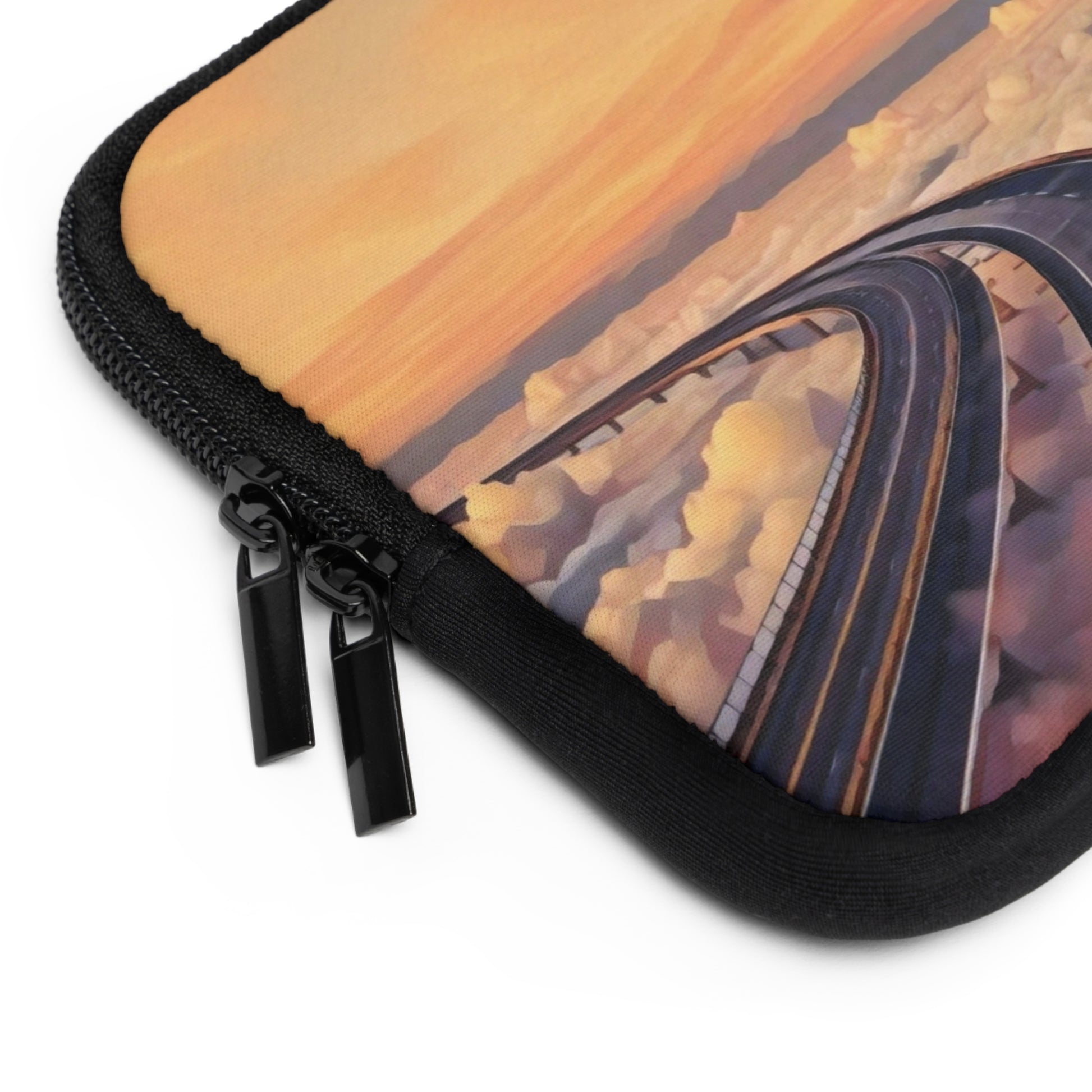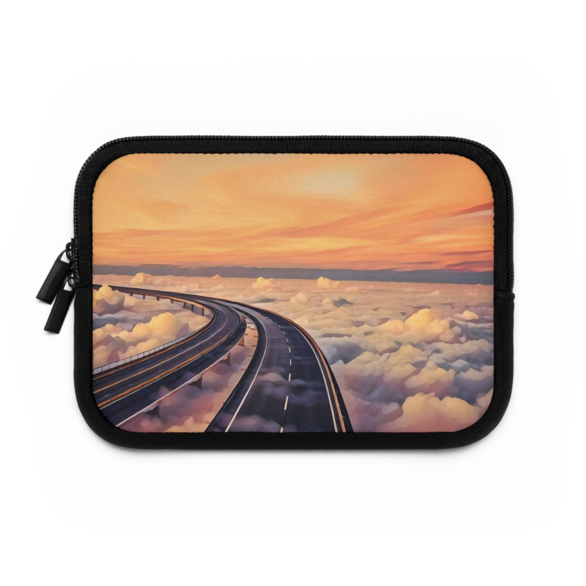 A laptop sleeve featuring an ethereal artwork titled 'Pathway to the Heavens' by Chaia Malana. The design depicts a road above the clouds in soft peach, gold, and lavender hues, creating a serene and dreamlike atmosphere. Perfect for those who seek inspiration, freedom, and adventure. Ideal for students, professionals, and dreamers. Relevant for birthdays, graduations, and back-to-school season.
