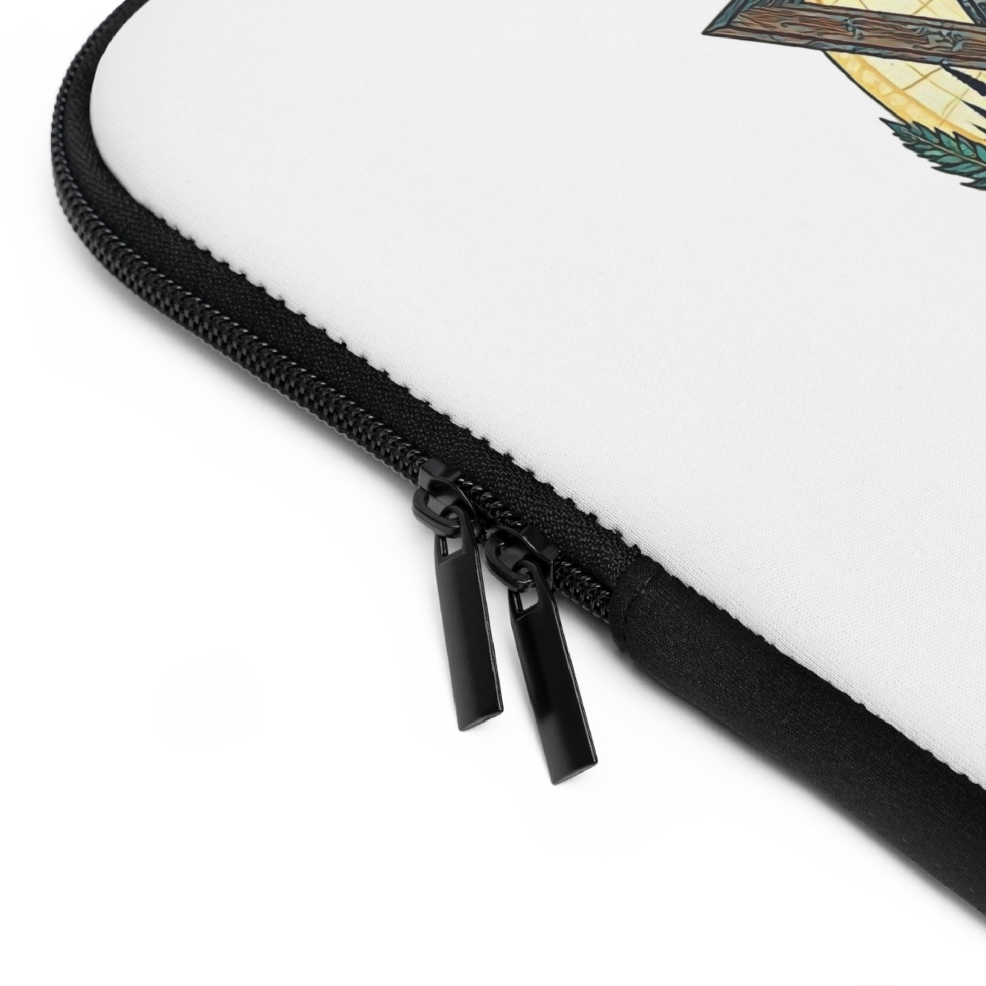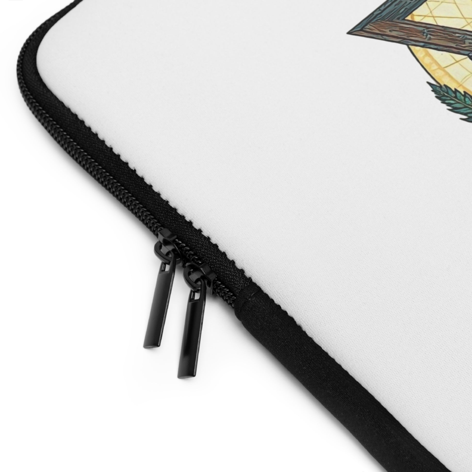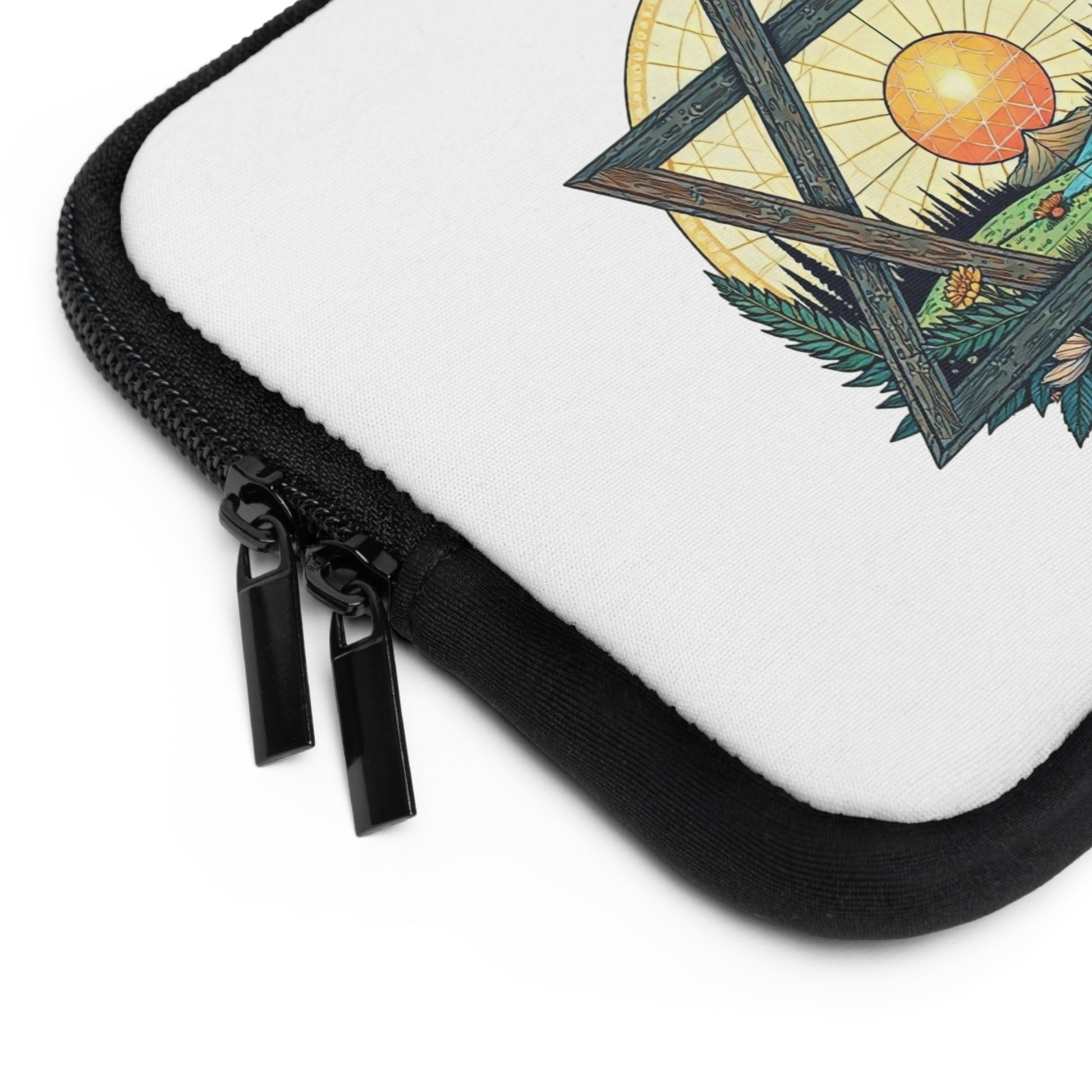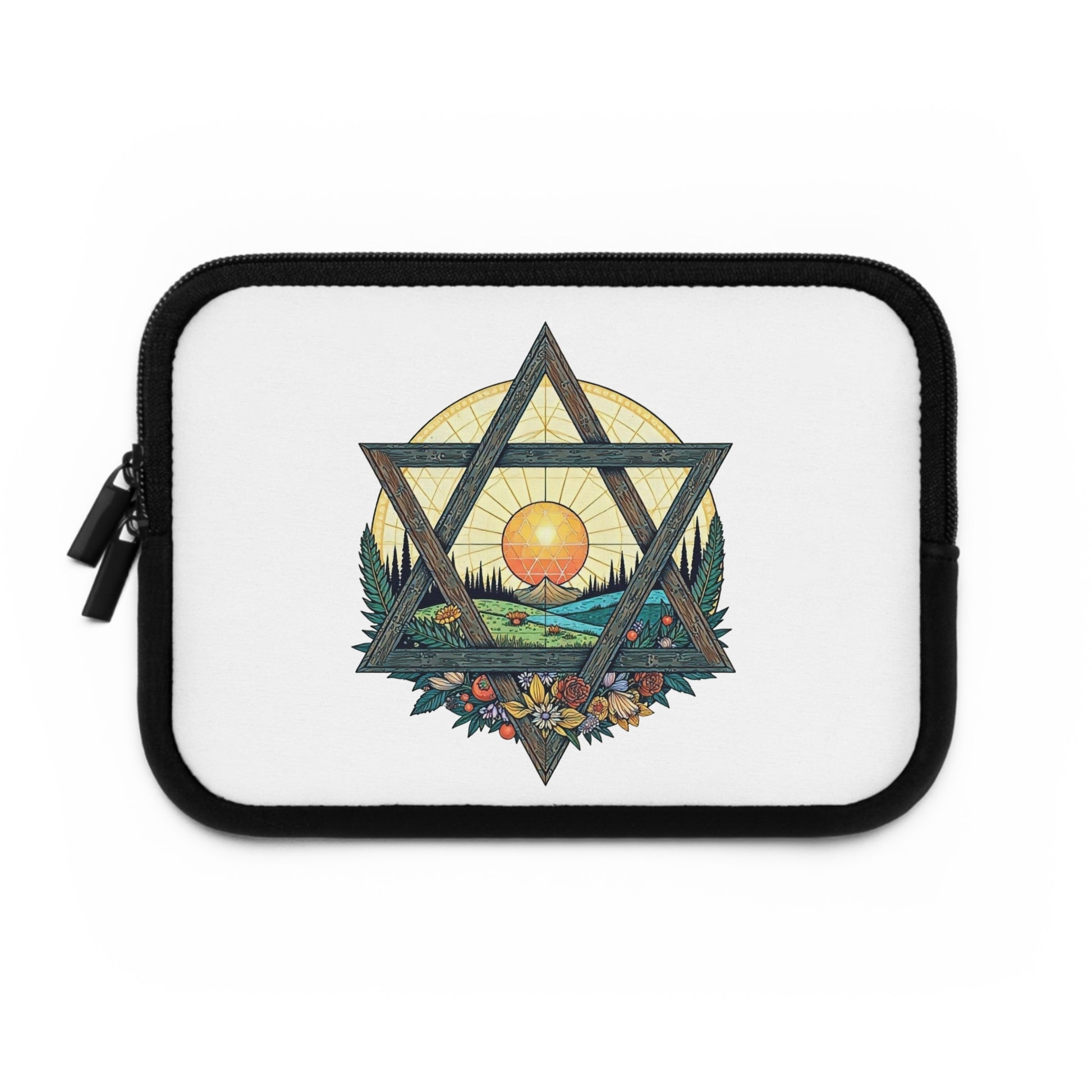 This laptop sleeve features a Magen David (Star of David) design with a tranquil natural landscape, including a radiant sun, green hills, a winding river, and vibrant wildflowers. The artwork evokes a sense of stillness and harmony between earthly and spiritual realms. Relevant for those celebrating Jewish holidays or seeking a spiritual connection to nature.