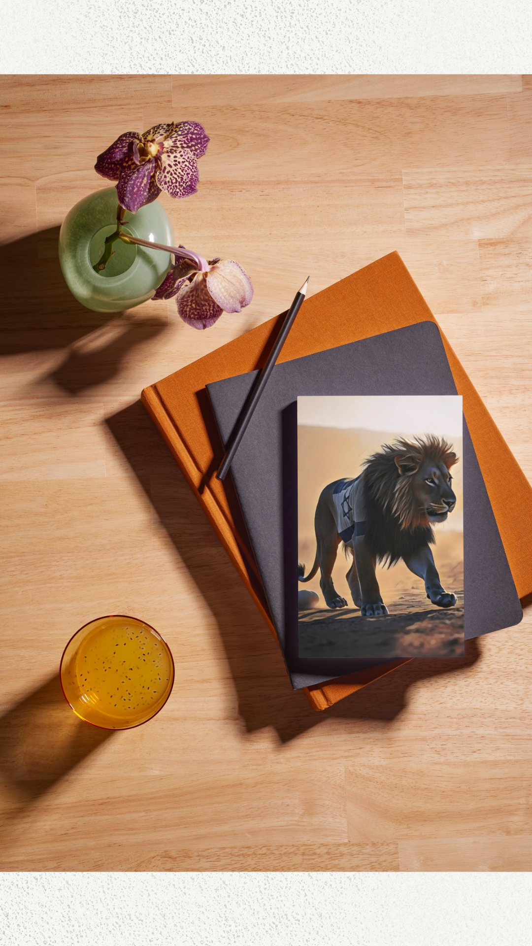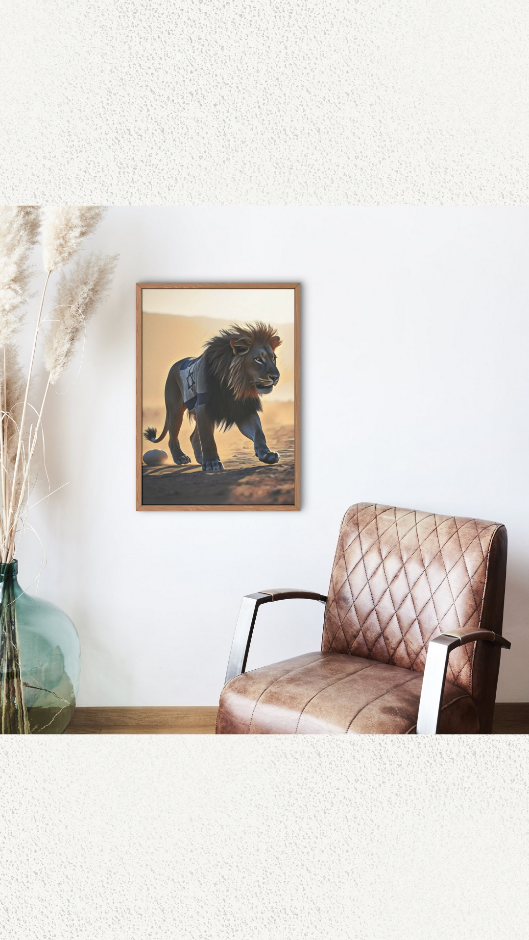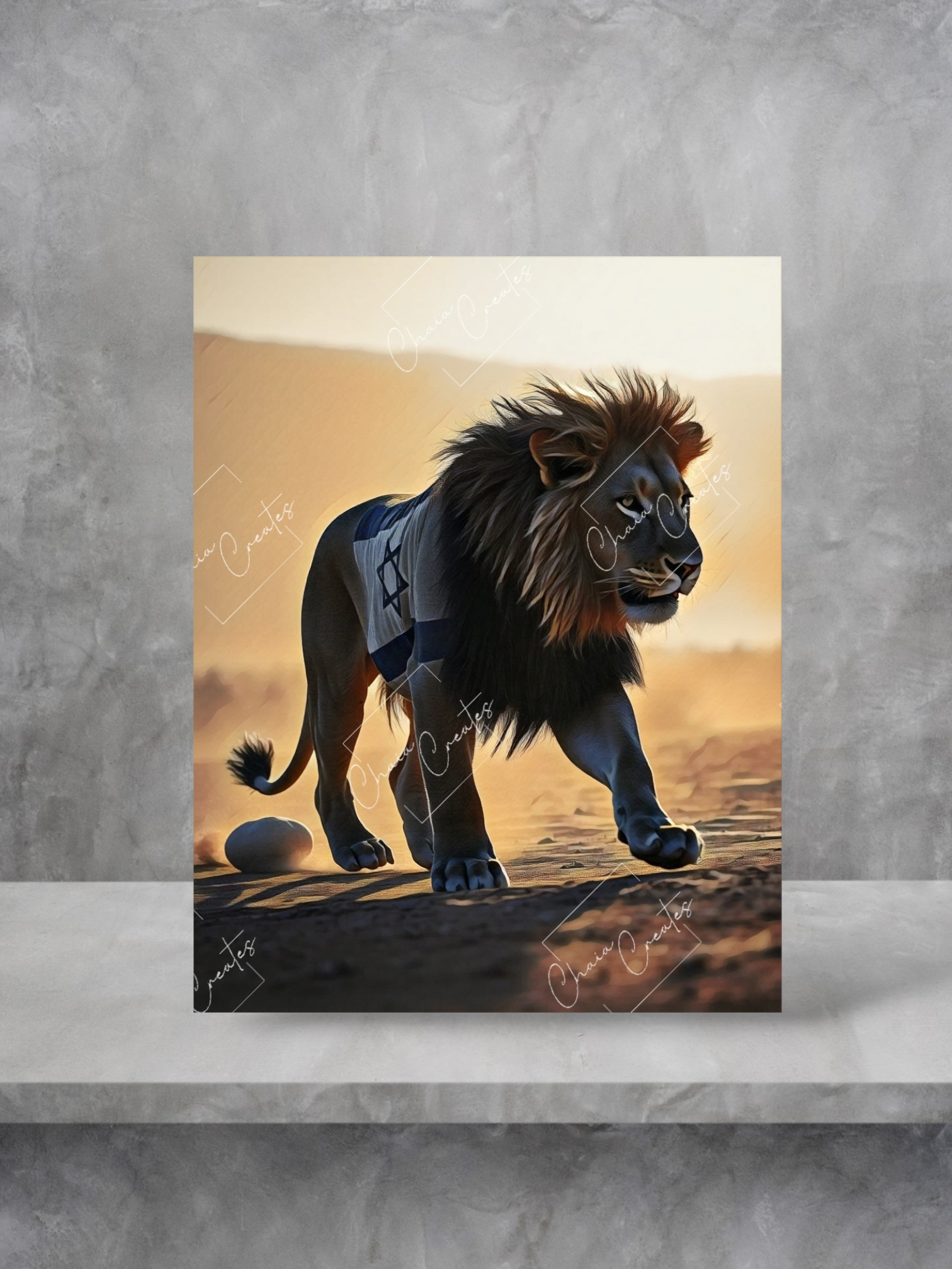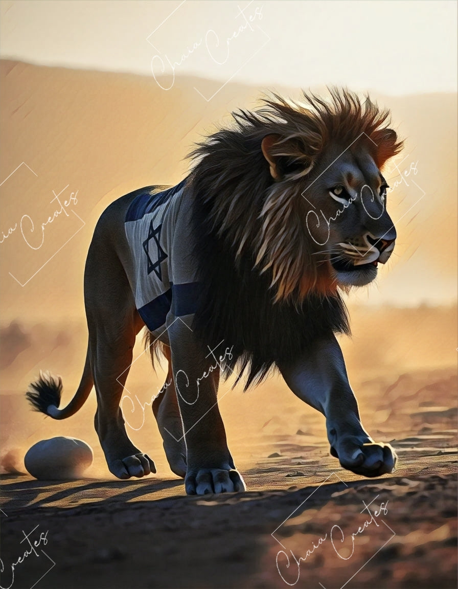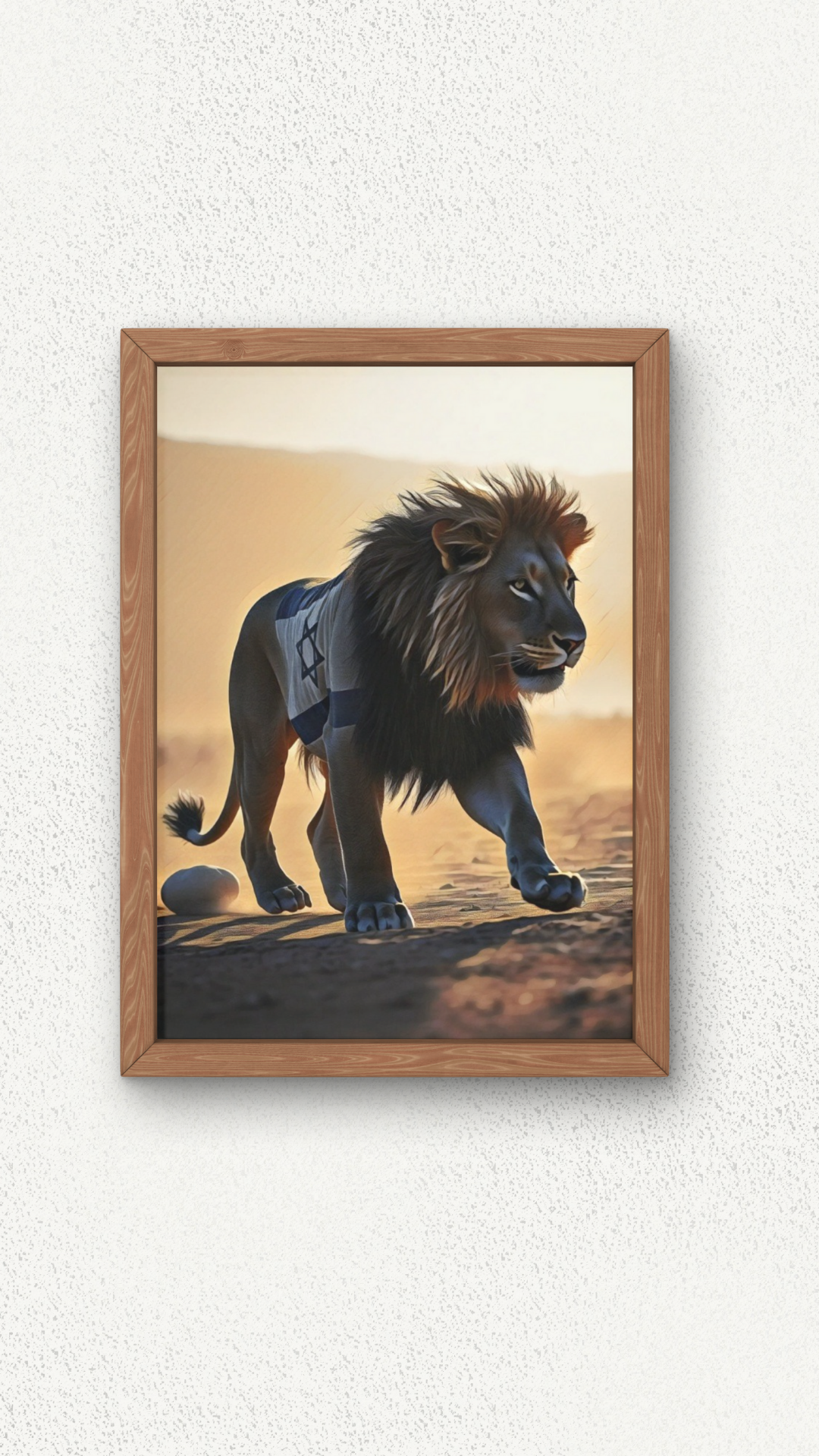 In this striking artwork, a powerful lion strides confidently through a desert landscape, draped in the Israeli flag. The lion, symbolic of the ancient tribe of Judah and the enduring spirit of Israel, exudes strength and majesty as the warm sunlight illuminates its mane. Its gaze is focused and determined, embodying both courage and resilience. The arid desert around it represents the historical and modern challenges faced by the nation, while the Israeli flag on its back highlights a deep connection to heritage, pride, and survival.