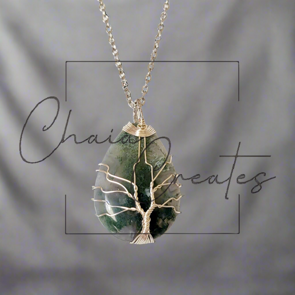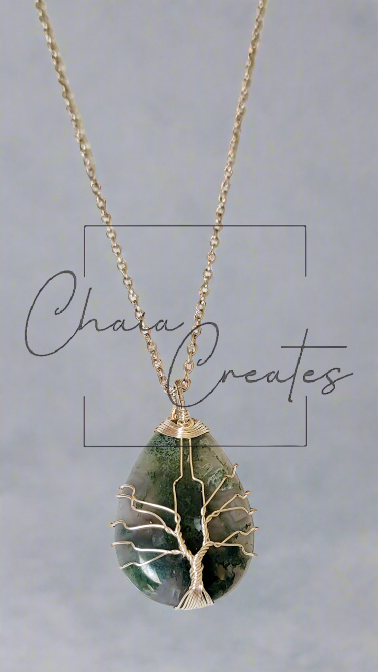 Moss Agate Teardrop Tree of Life Wire Wrap Necklace