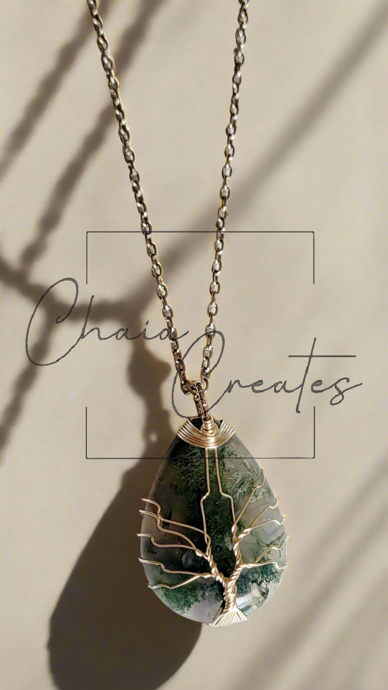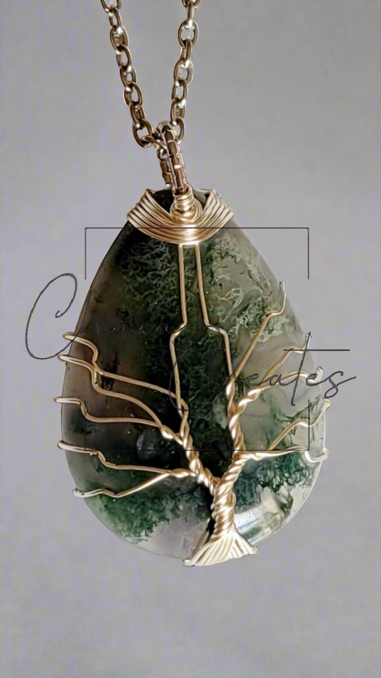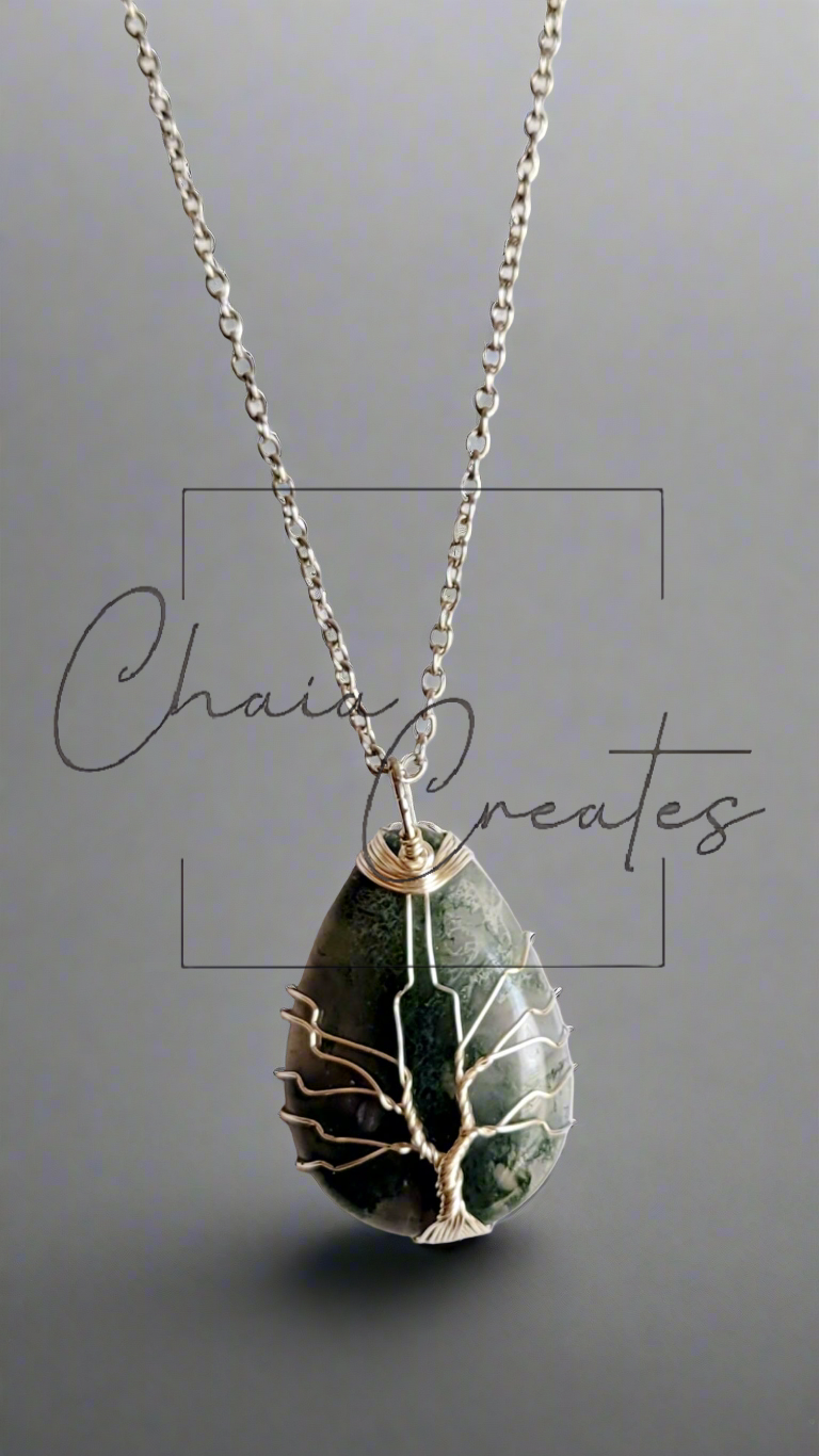 Explore the captivating allure of our Moss Agate Teardrop Tree of Life Wire Wrap Necklace, meticulously handcrafted to embody natural beauty and spiritual harmony. Each necklace is a unique masterpiece, showcasing the mesmerizing patterns and soothing hues of Moss Agate, a gemstone renowned for its healing properties and connection to nature.