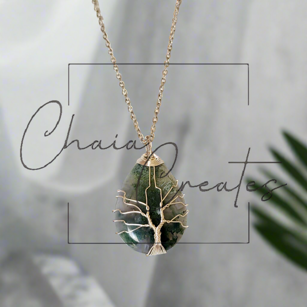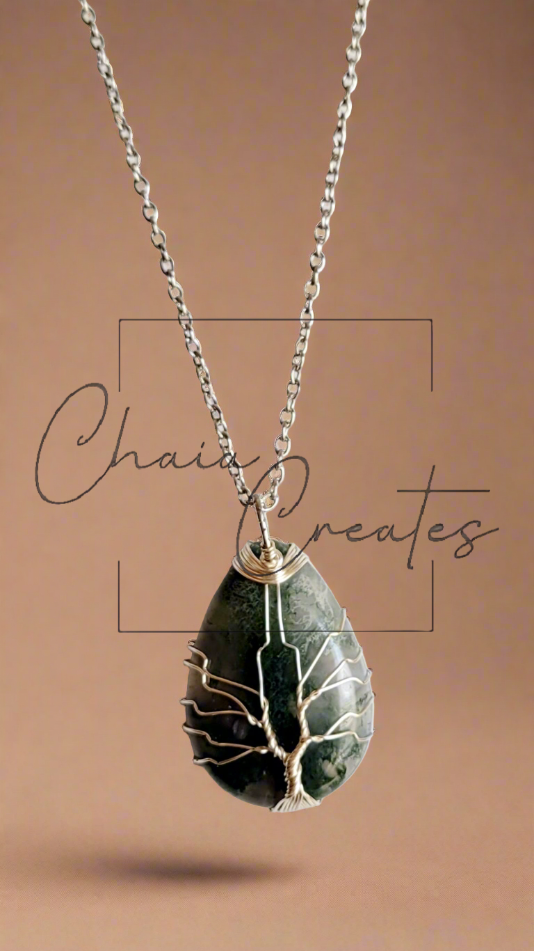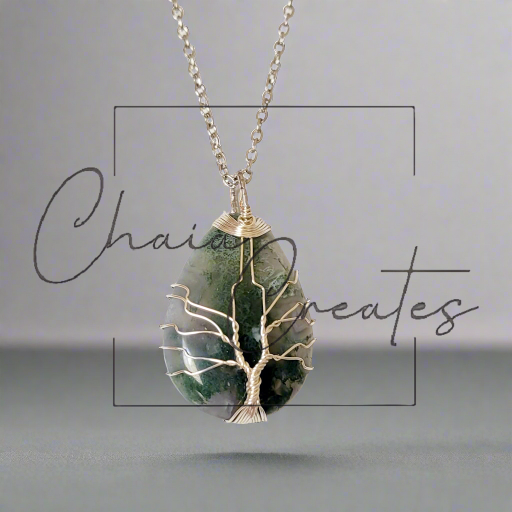 Explore the captivating allure of our Moss Agate Teardrop Tree of Life Wire Wrap Necklace, meticulously handcrafted to embody natural beauty and spiritual harmony. Each necklace is a unique masterpiece, showcasing the mesmerizing patterns and soothing hues of Moss Agate, a gemstone renowned for its healing properties and connection to nature.