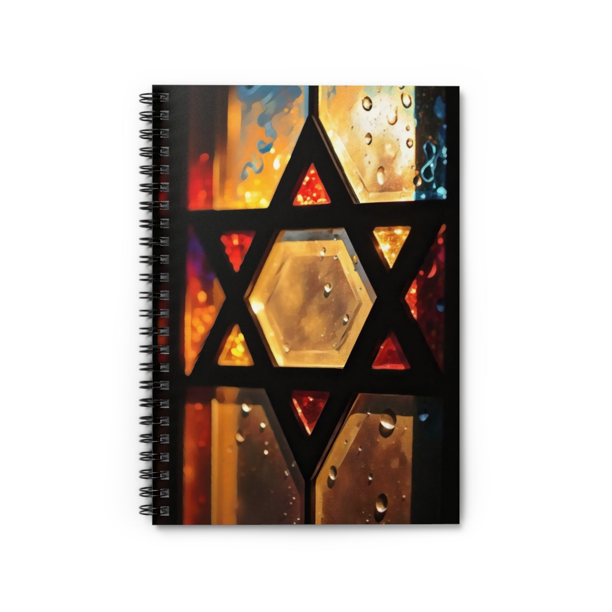 The 'Eternal Light: Star of Remembrance' Spiral Notebook features a stunning Star of David design framed within a stained-glass window, symbolizing faith and heritage. With warm hues and raindrop accents, this notebook exudes a sense of reflection and hope. Perfect for those seeking unity, remembrance, and tradition, this notebook is a timeless tribute to enduring spirit and beauty.
