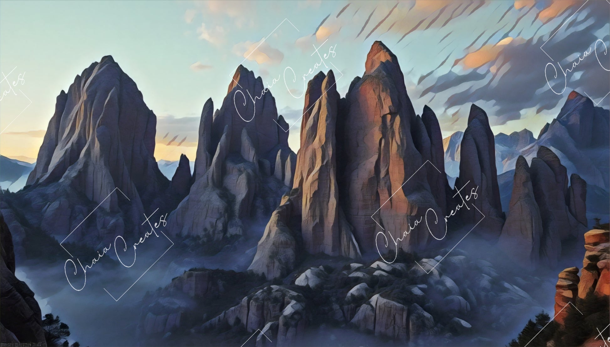 Premium download is free of watermarks.Chaia Malana’s Peaks of Eternity reveals a breathtaking vista where towering stone formations rise majestically into the glowing light of dawn or dusk. The mountains are painted with hues of warm amber and soft pink, casting shadows that deepen the mystery of the valleys below. A mist hovers at the base of the cliffs, creating a dreamlike quality that transports the viewer to a place untouched by time. Each peak stands tall and resilient, like ancient guardians watching over the rugged landscape with quiet strength.