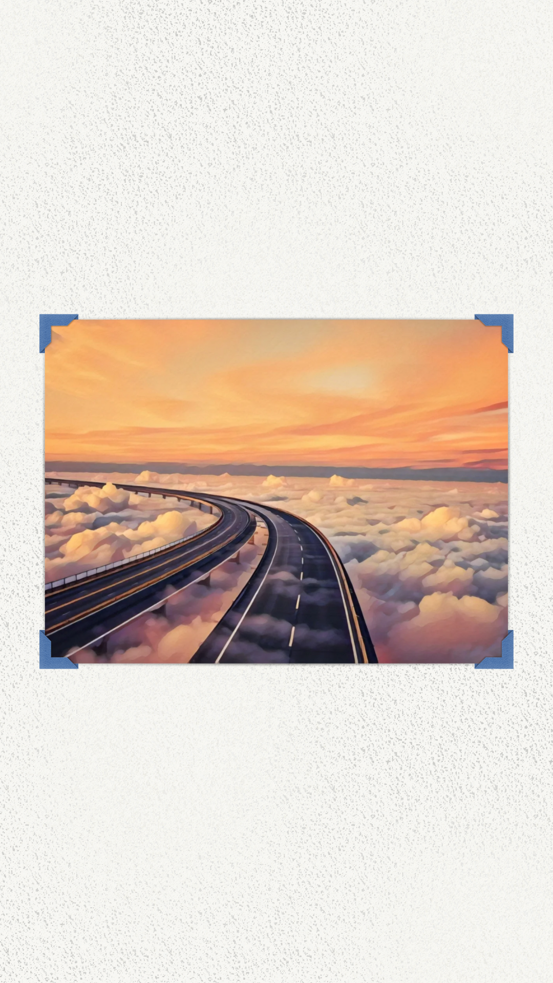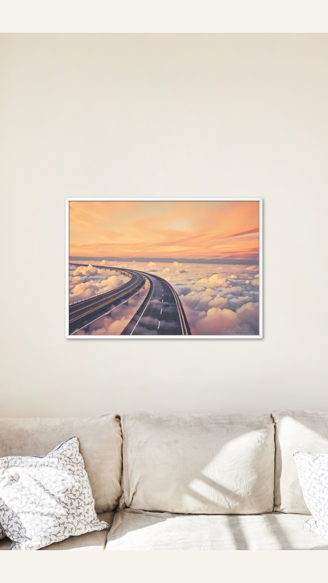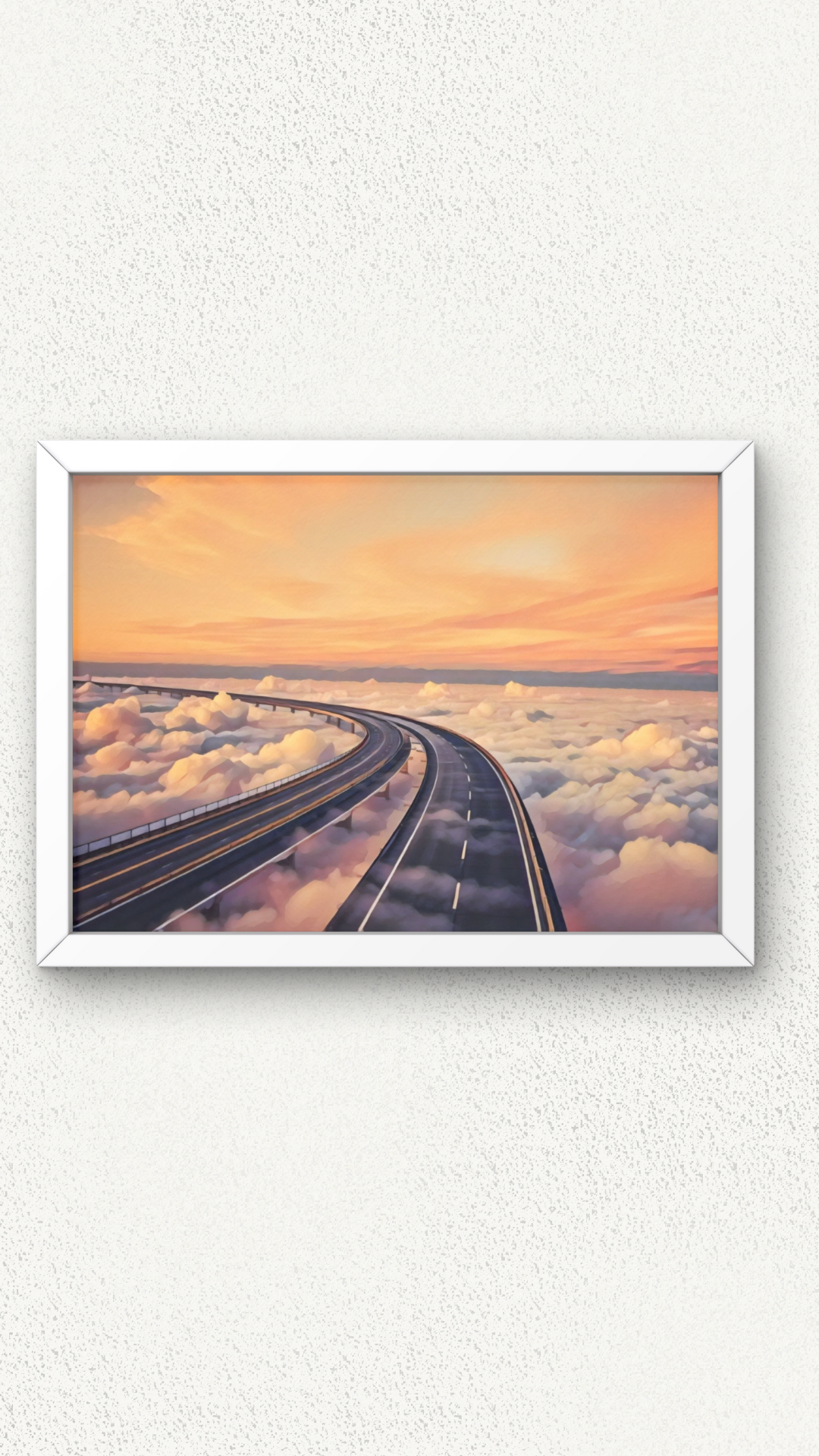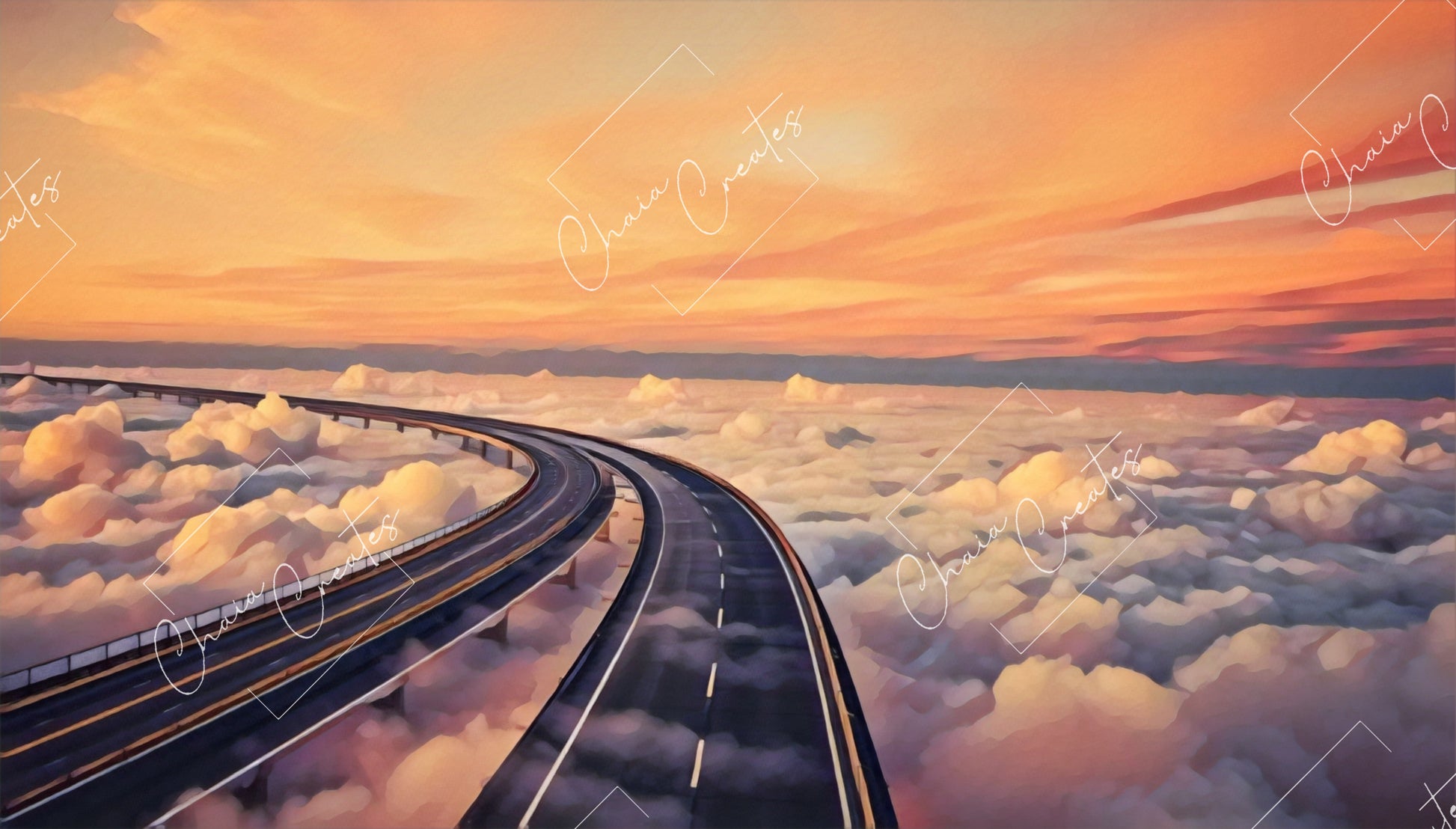 This ethereal artwork depicts a road stretching high above the clouds, winding gracefully through an endless sky painted in soft shades of peach, gold, and lavender. The scene is both surreal and serene, evoking a sense of calm and boundless possibility. The vibrant sunset bathes the clouds in warm hues, creating an atmosphere that feels dreamlike and otherworldly. As the road curves into the distance, it invites viewers to imagine traveling toward the unknown, where earthly limits no longer apply. This journey through the clouds symbolizes freedom, aspiration, and the pursuit of dreams beyond what seems possible. The image captures the allure of adventure and the quiet peace of soaring above the world.