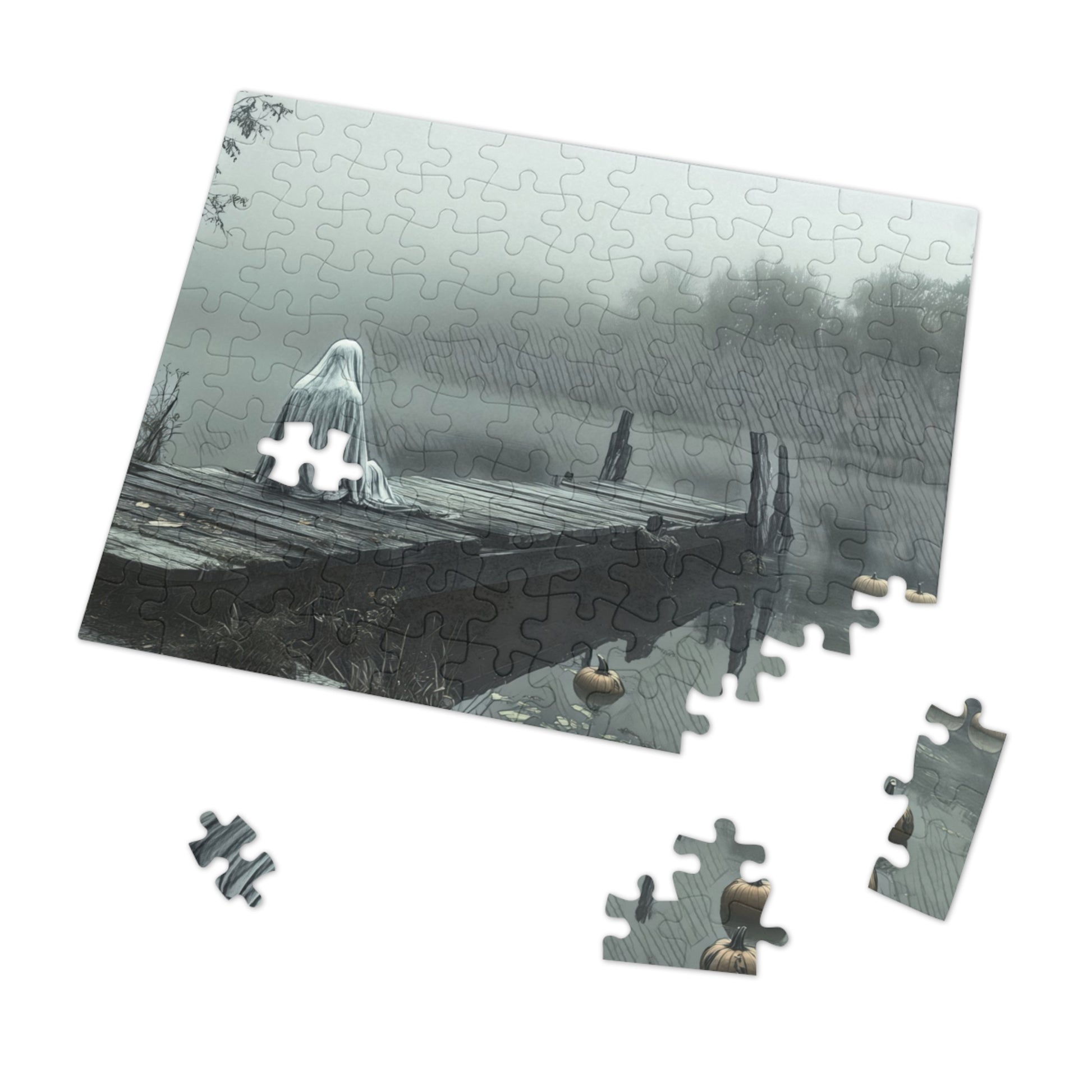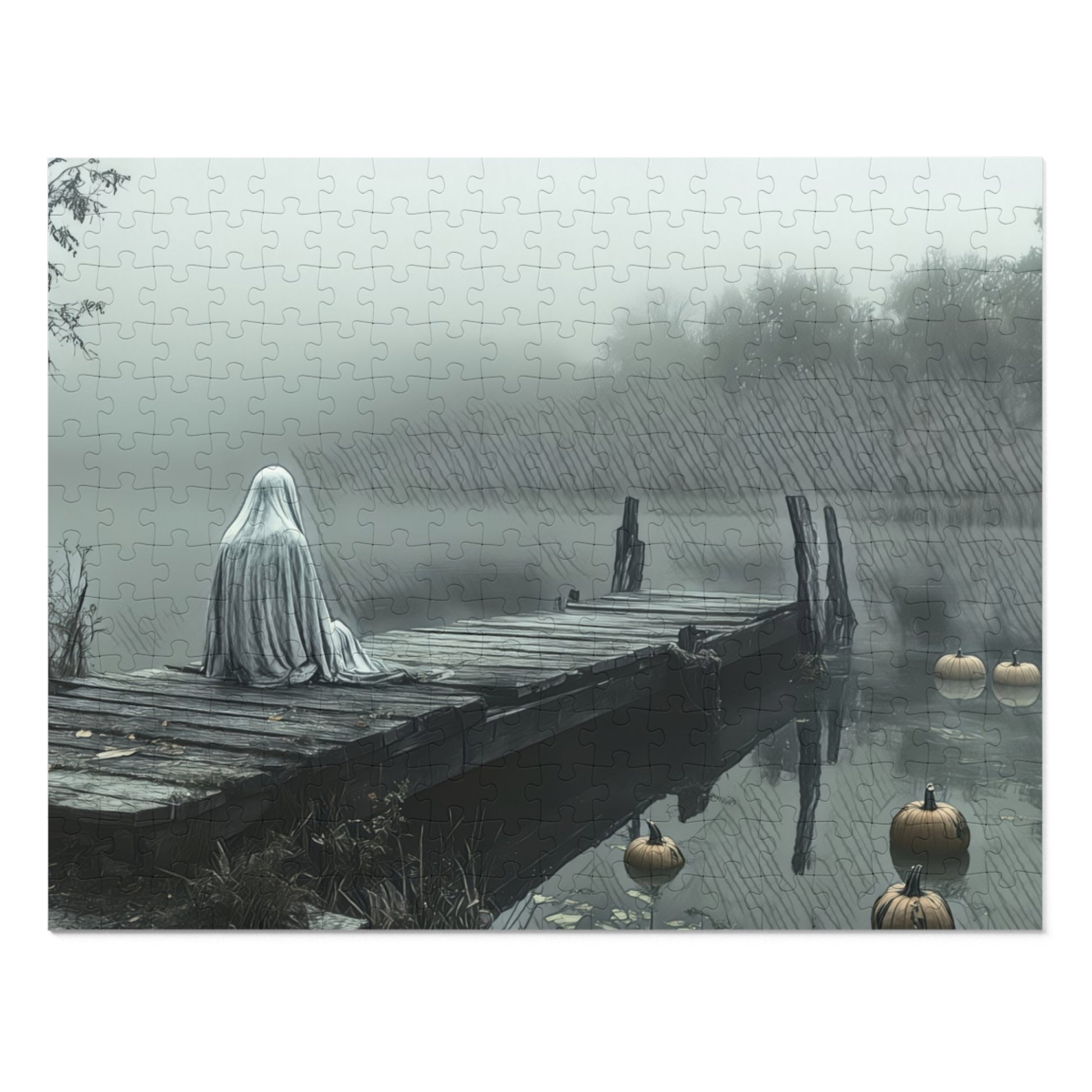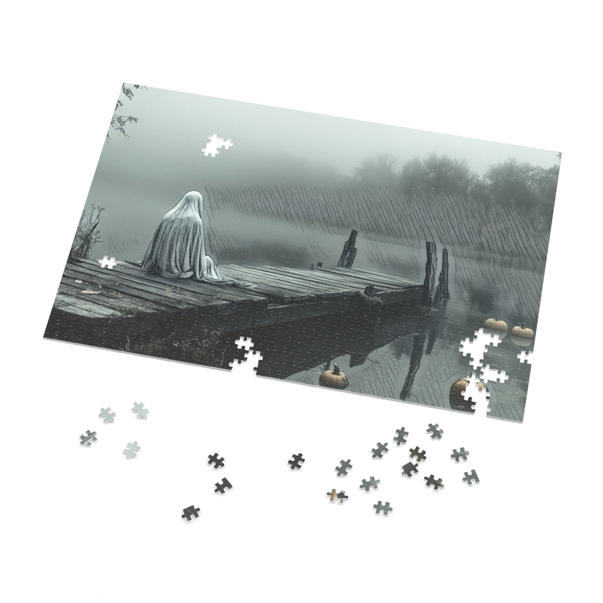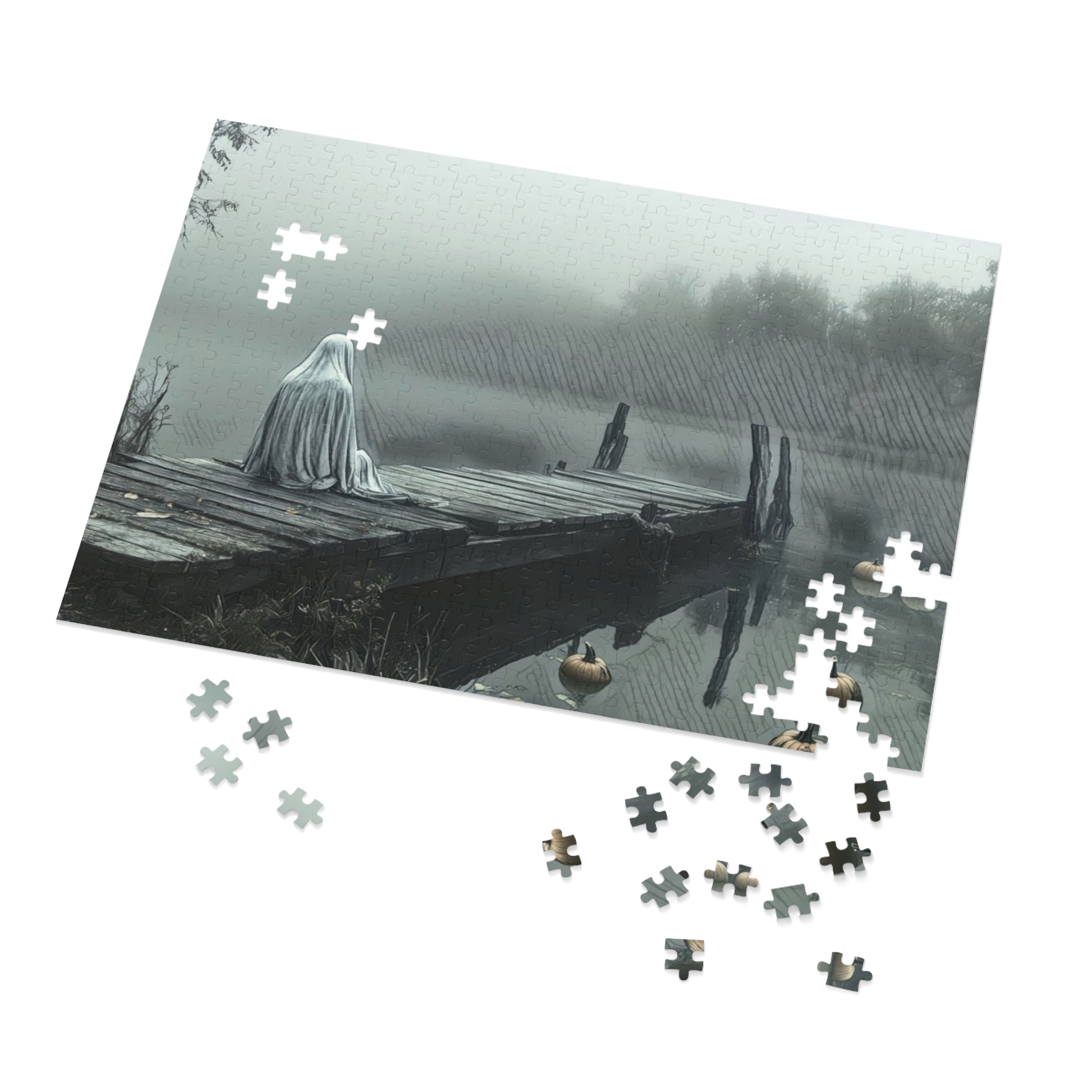 Experience the eerie tranquility of an early autumn morning with Whispers of the Veiled Lake jigsaw puzzle. This mysterious design featuring a spectral figure, faded pumpkins, and monochromatic landscape creates a dreamlike ambiance, perfect for those who enjoy reflective atmospheres. Ideal for puzzle enthusiasts who seek a challenging and captivating experience, this puzzle is perfect for cozying up on a rainy day or enjoying a peaceful evening at home. Great for Halloween, autumn, or anytime you want to immerse yourself in a mysterious vibe.