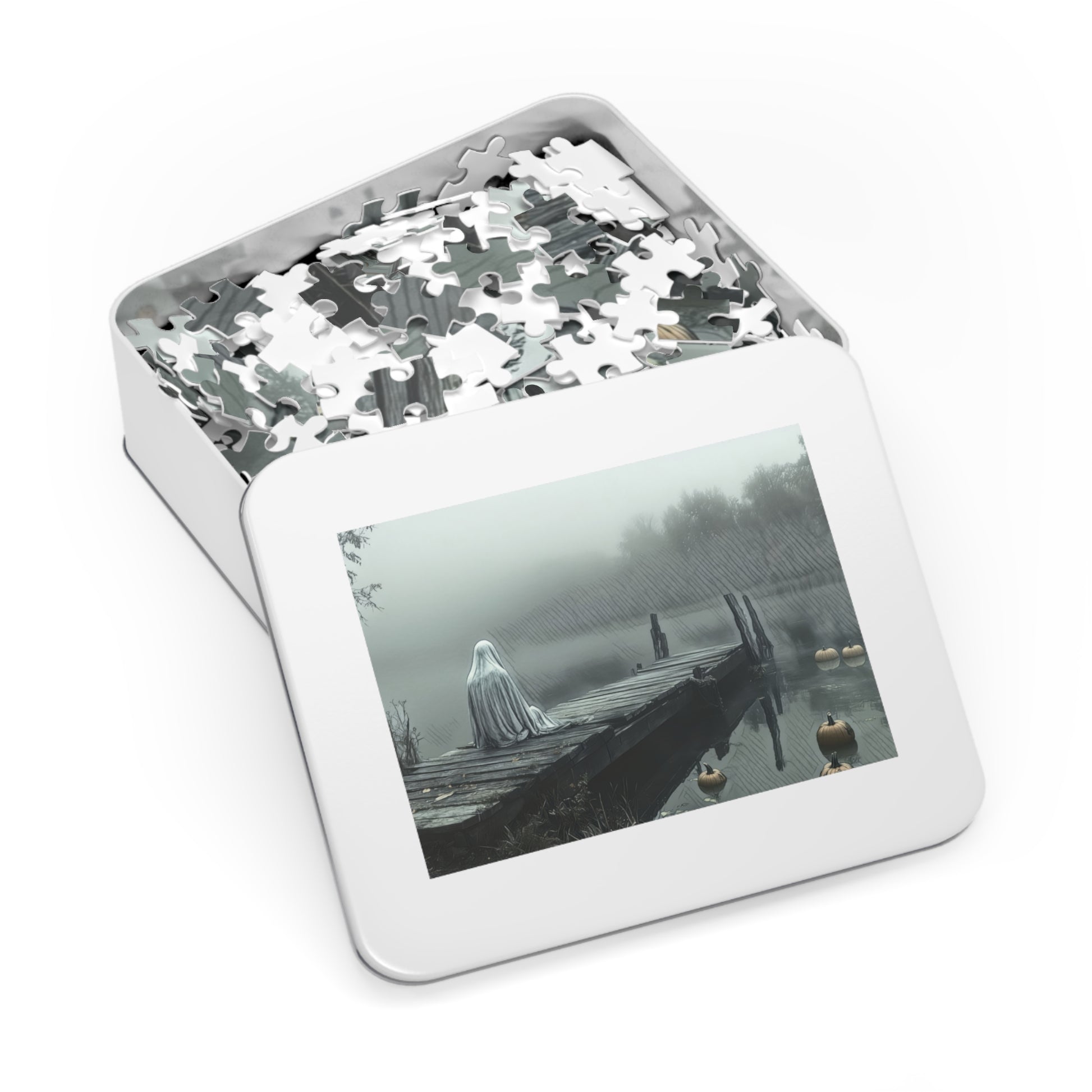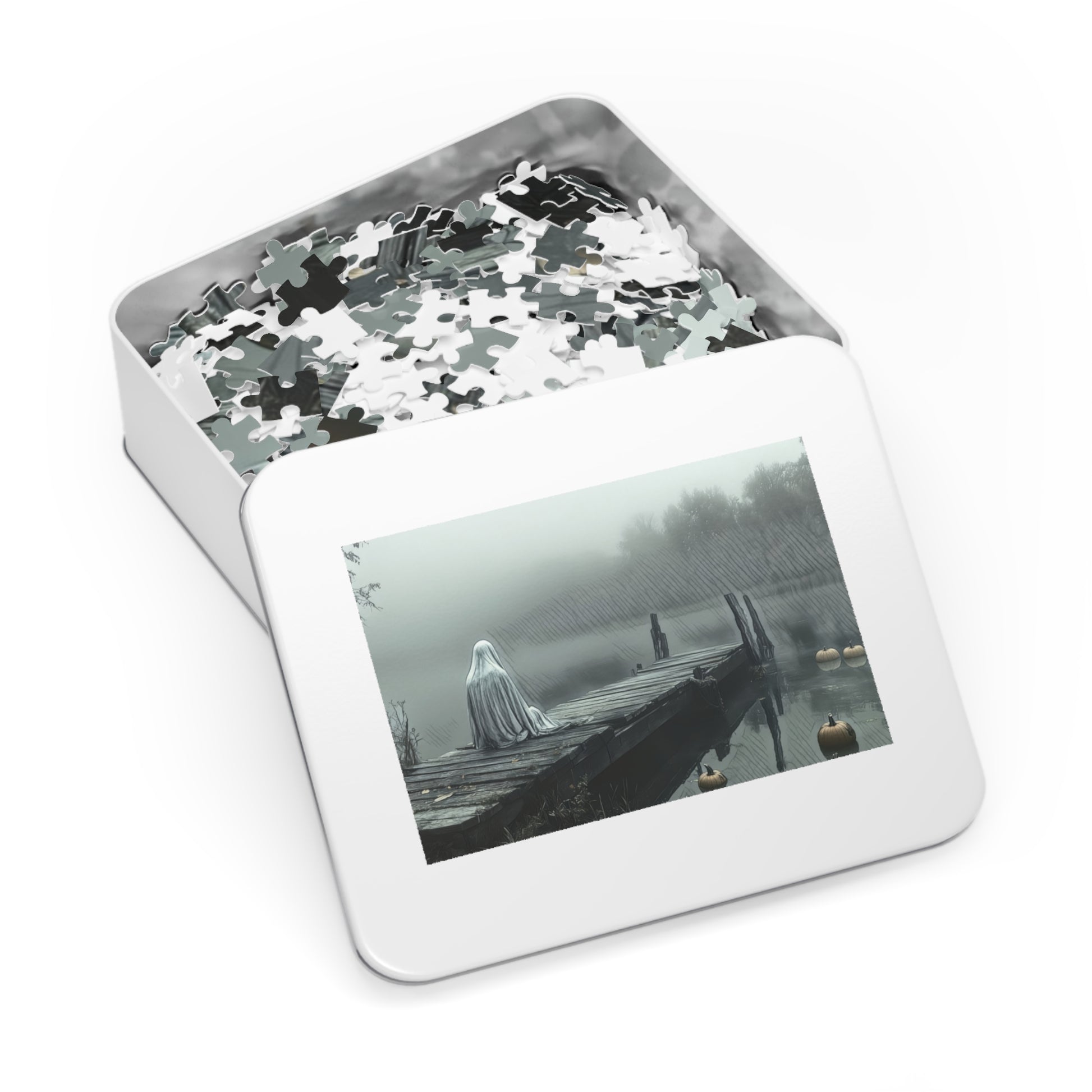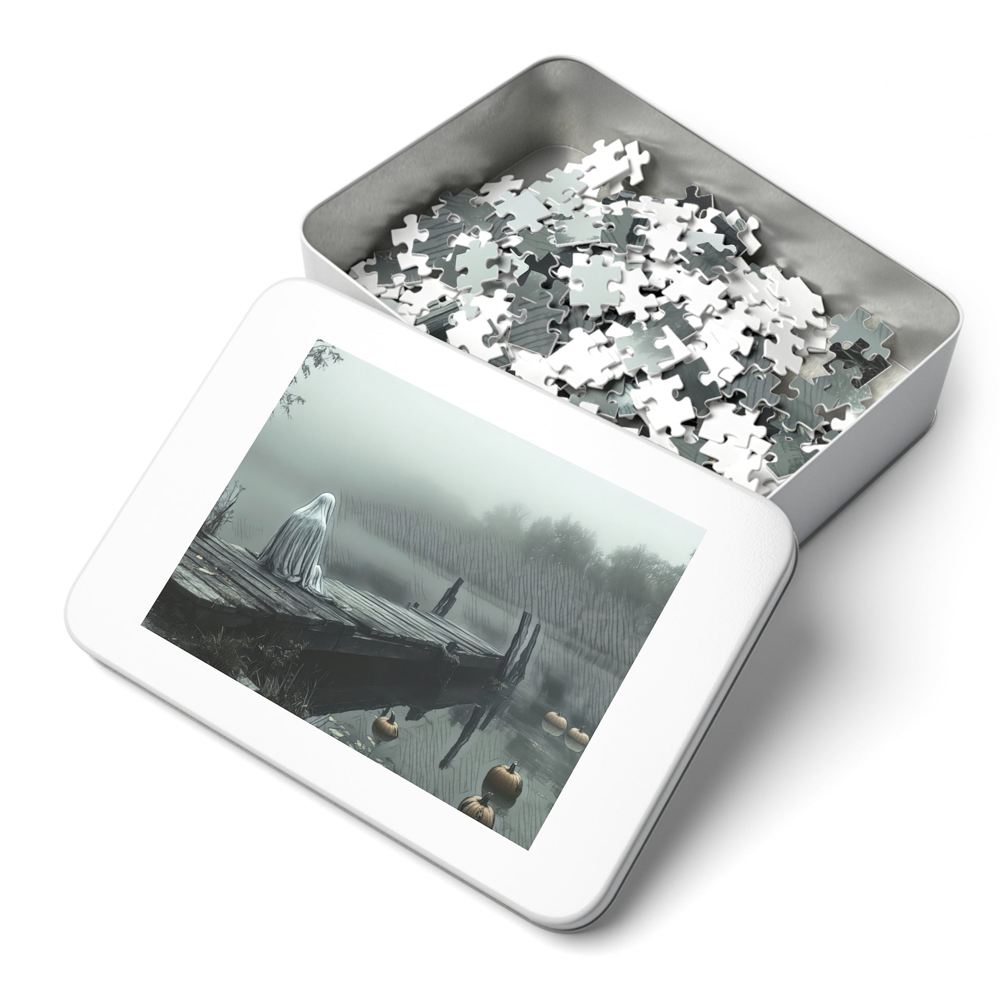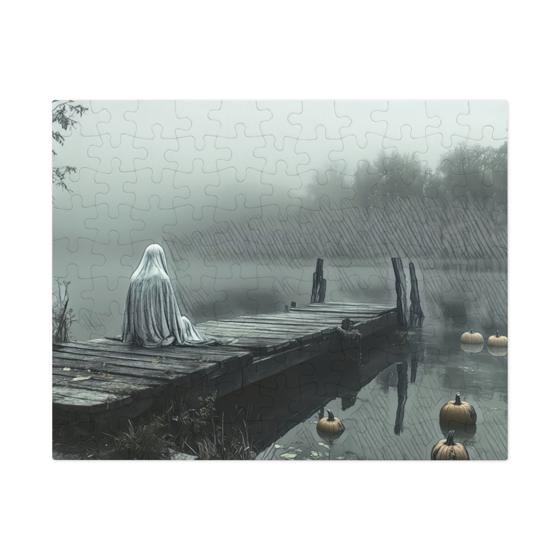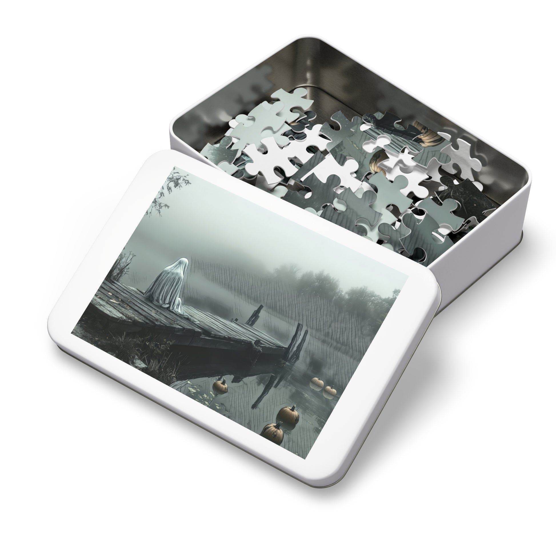 Experience the eerie tranquility of an early autumn morning with Whispers of the Veiled Lake jigsaw puzzle. This mysterious design featuring a spectral figure, faded pumpkins, and monochromatic landscape creates a dreamlike ambiance, perfect for those who enjoy reflective atmospheres. Ideal for puzzle enthusiasts who seek a challenging and captivating experience, this puzzle is perfect for cozying up on a rainy day or enjoying a peaceful evening at home. Great for Halloween, autumn, or anytime you want to immerse yourself in a mysterious vibe.