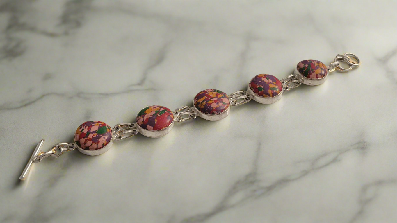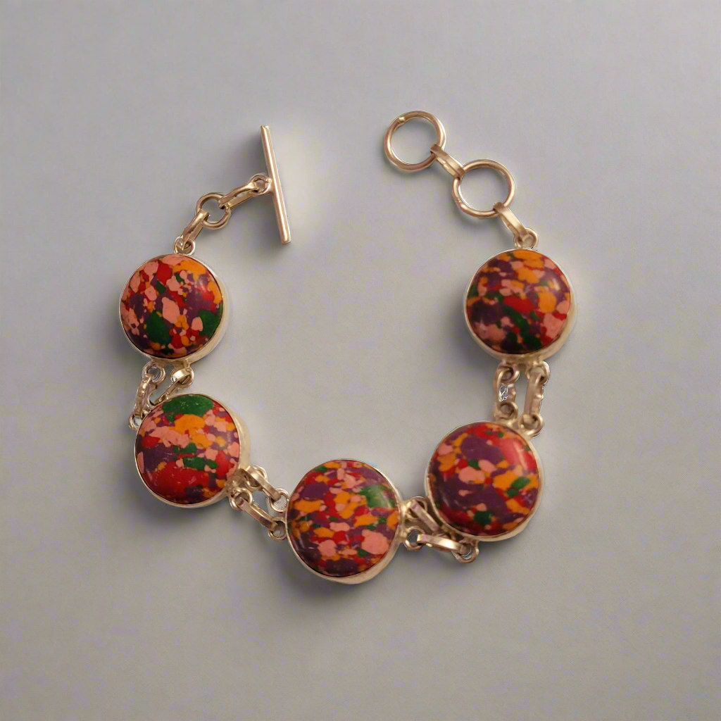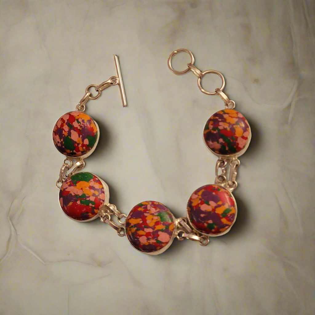 This beautiful bracelet features a stunning combination of rainbow calsilica gemstones and sterling silver links. The bracelet is crafted with care and attention to detail, making it a perfect addition to any jewelry collection. The bracelet is round in shape and features five gemstones, each with a unique multicolor design. The bracelet is perfect for adding a pop of color to any outfit, and the sterling silver links ensure durability and longevity. This bracelet is a must-have for anyone who loves fine jewelry and wants to add a touch of elegance to their wardrobe.