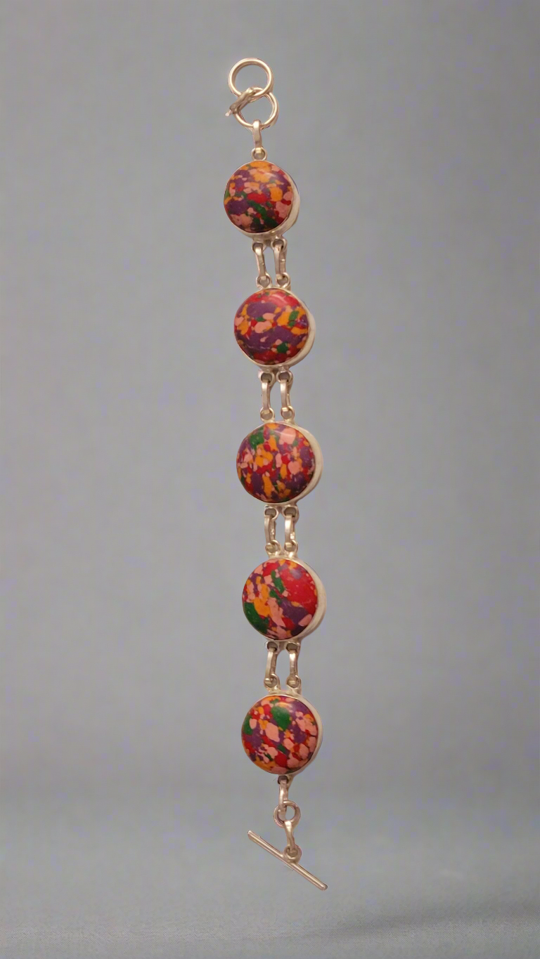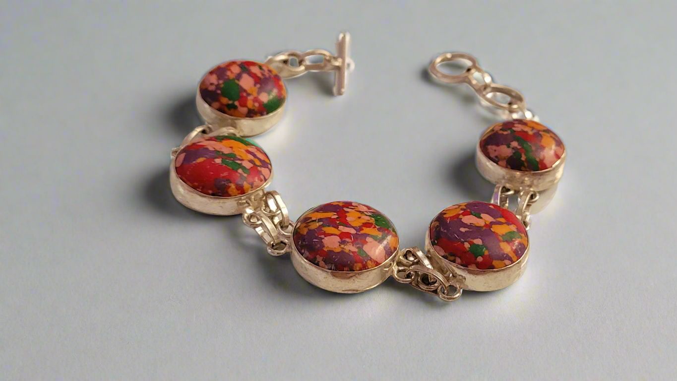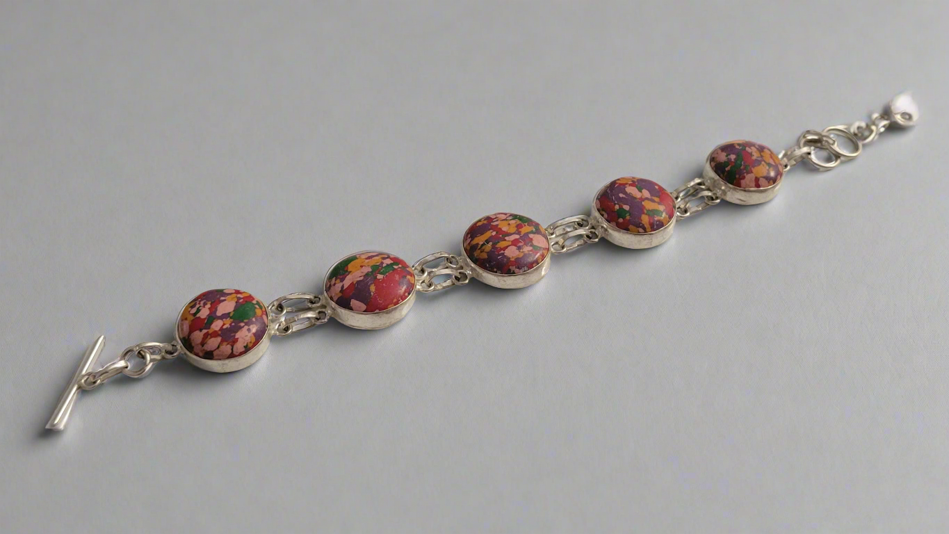 This beautiful bracelet features a stunning combination of rainbow calsilica gemstones and sterling silver links. The bracelet is crafted with care and attention to detail, making it a perfect addition to any jewelry collection. The bracelet is round in shape and features five gemstones, each with a unique multicolor design. The bracelet is perfect for adding a pop of color to any outfit, and the sterling silver links ensure durability and longevity. This bracelet is a must-have for anyone who loves fine jewelry and wants to add a touch of elegance to their wardrobe.
