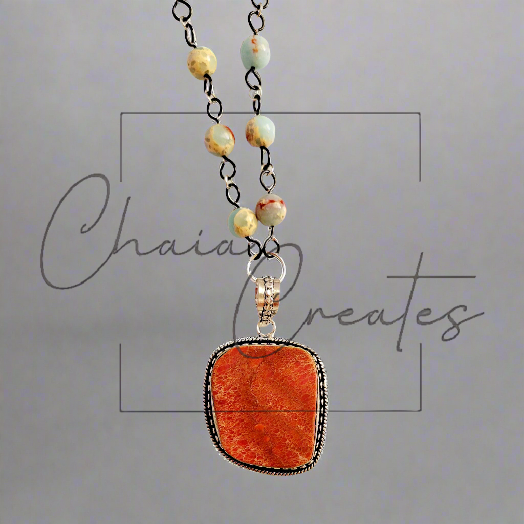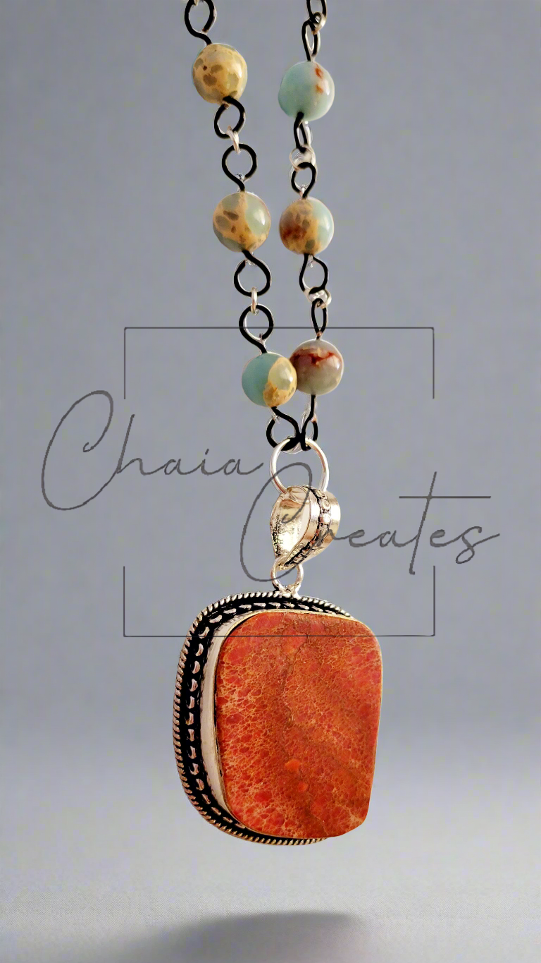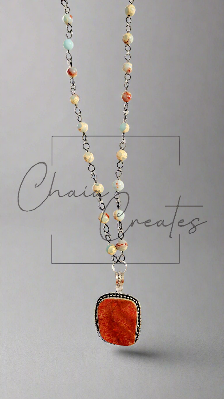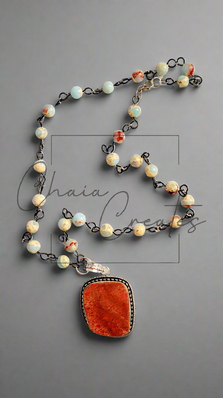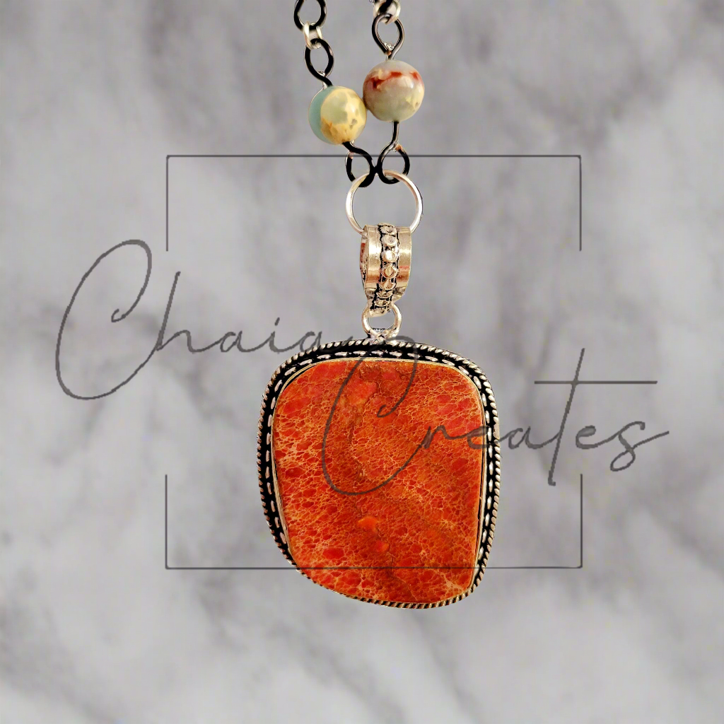Embrace the captivating beauty of our Sea Sediment Jasper Necklace. This stunning piece features a vibrant red sea sediment jasper pendant, set in elegant sterling silver. The pendant hangs gracefully from a link chain made of copper plated with black metal alloy, adorned with sea sediment jasper beads in shades of blue, tan, and hints of red. Each bead is carefully selected to create a harmonious blend of colors, adding a touch of nature-inspired charm. Perfect for any occasion, this necklace is a statement of elegance and earthy sophistication.