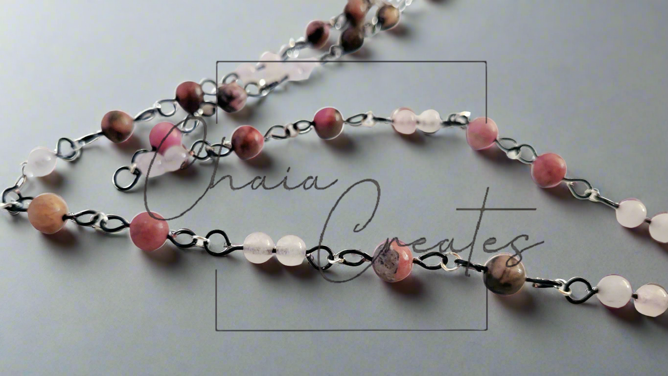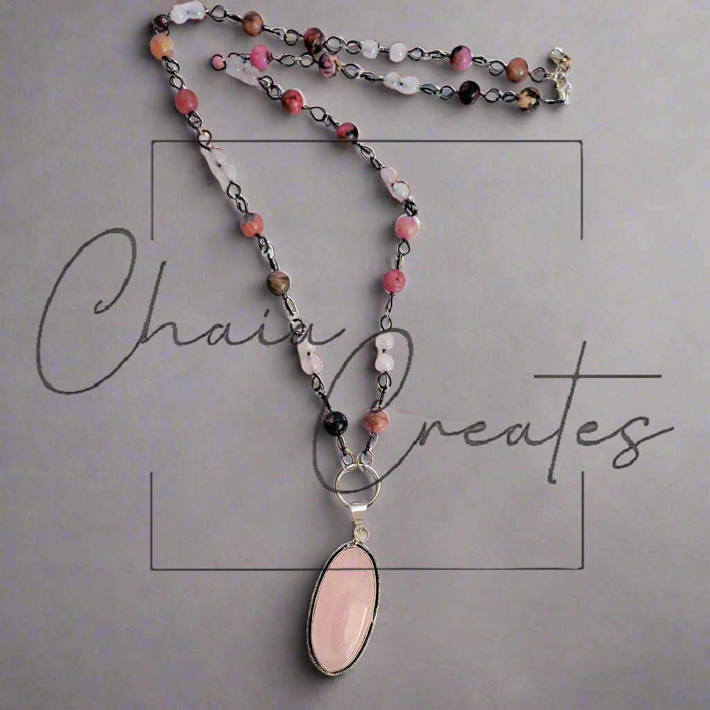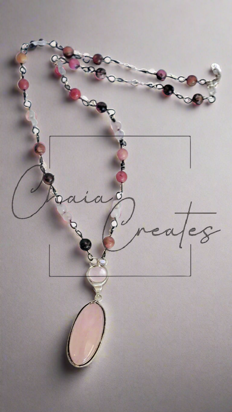 This stunning necklace from Chaia Creates features a beautiful teardrop-shaped pendant made of black onyx, a natural stone. The pendant hangs from a wire wrap chain with a lobster closure and is accented with rose quartz and quartz secondary stones. This handmade piece is a must-have for anyone who loves unique and high-quality jewelry.