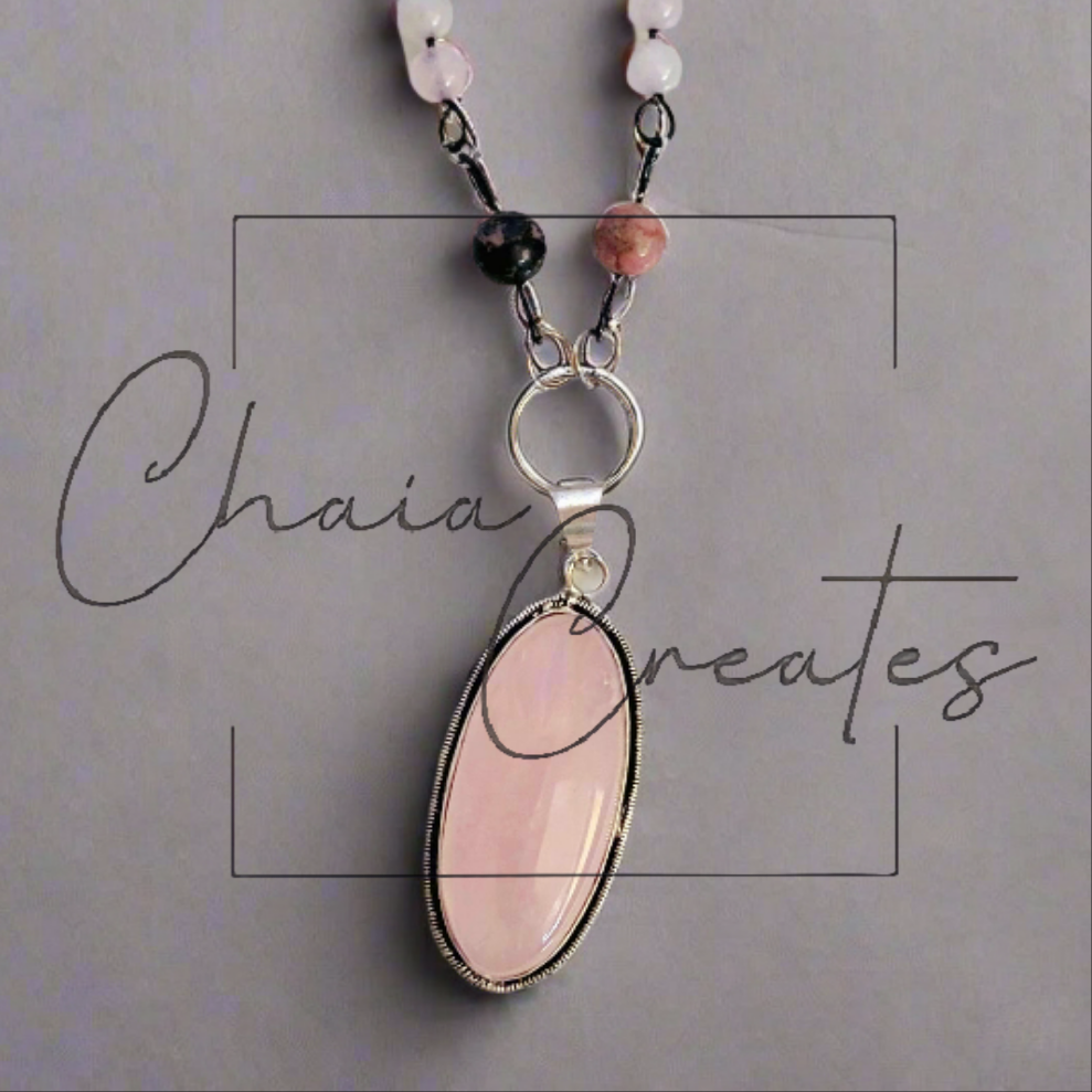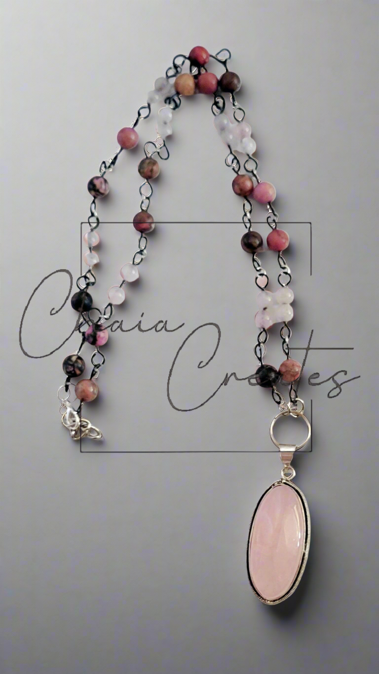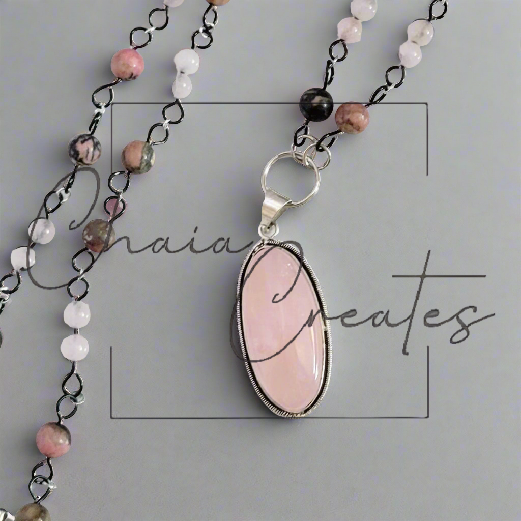 Rose Quartz Oval Sterling Silver Amulet on Rose Quartz and Rhodonite Beaded Necklace