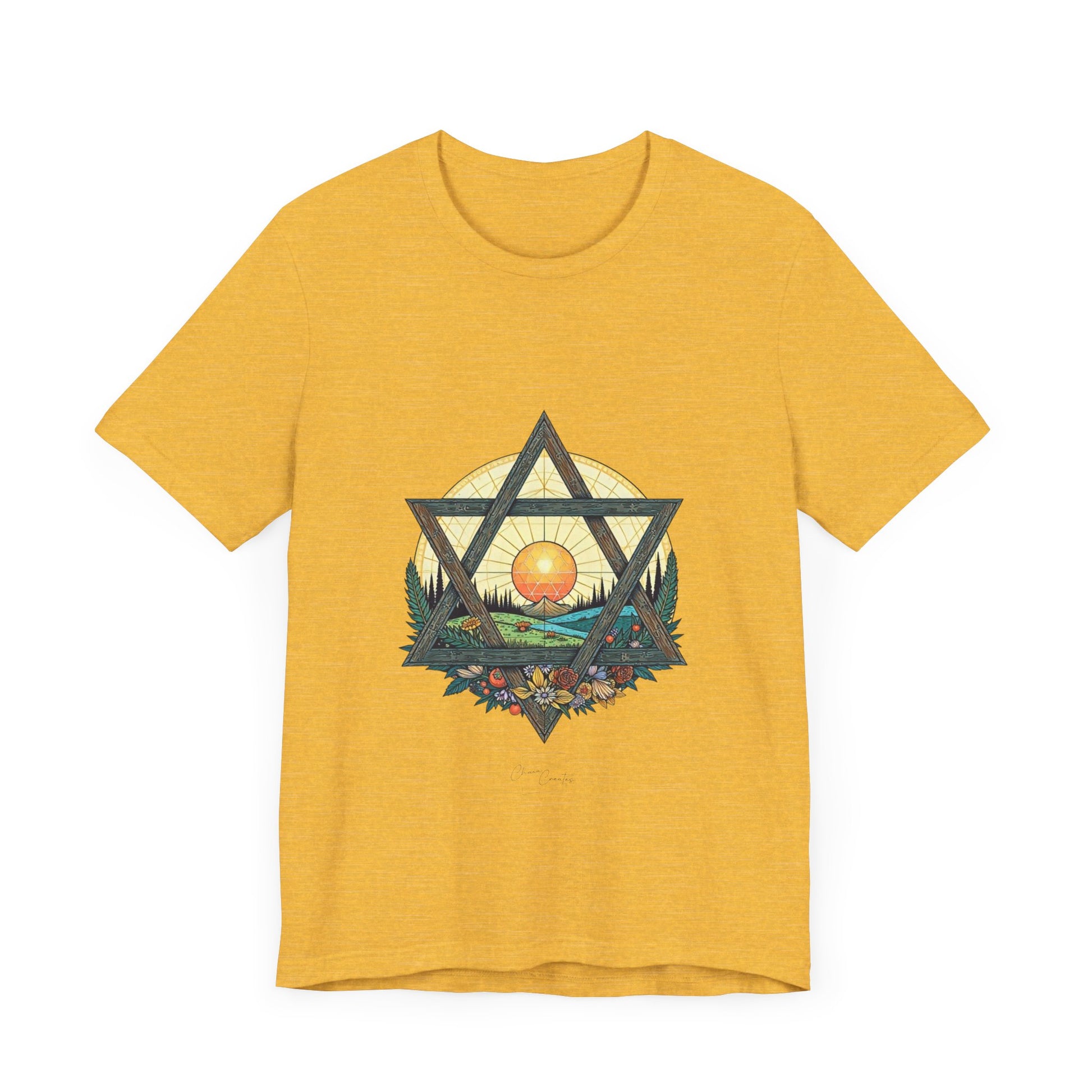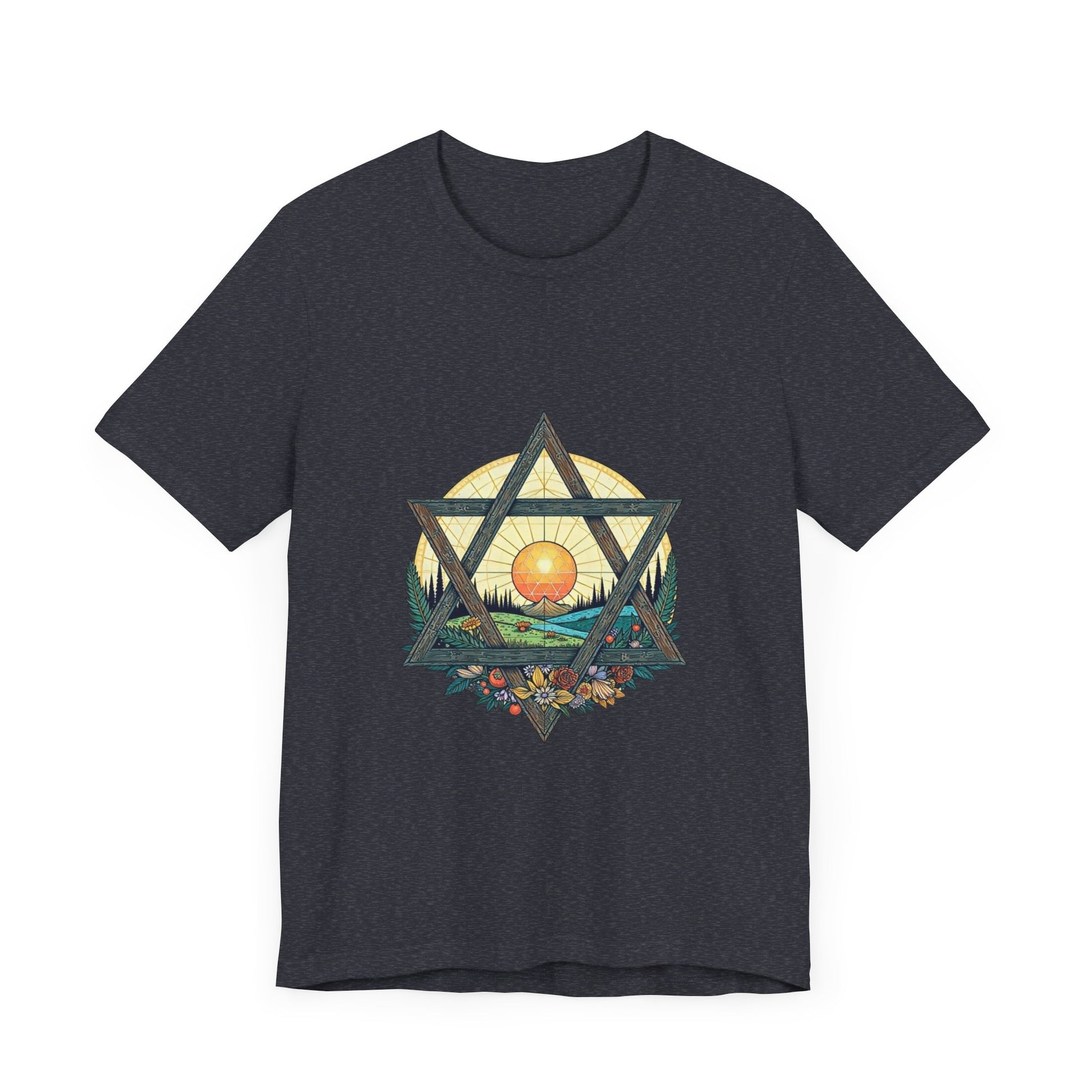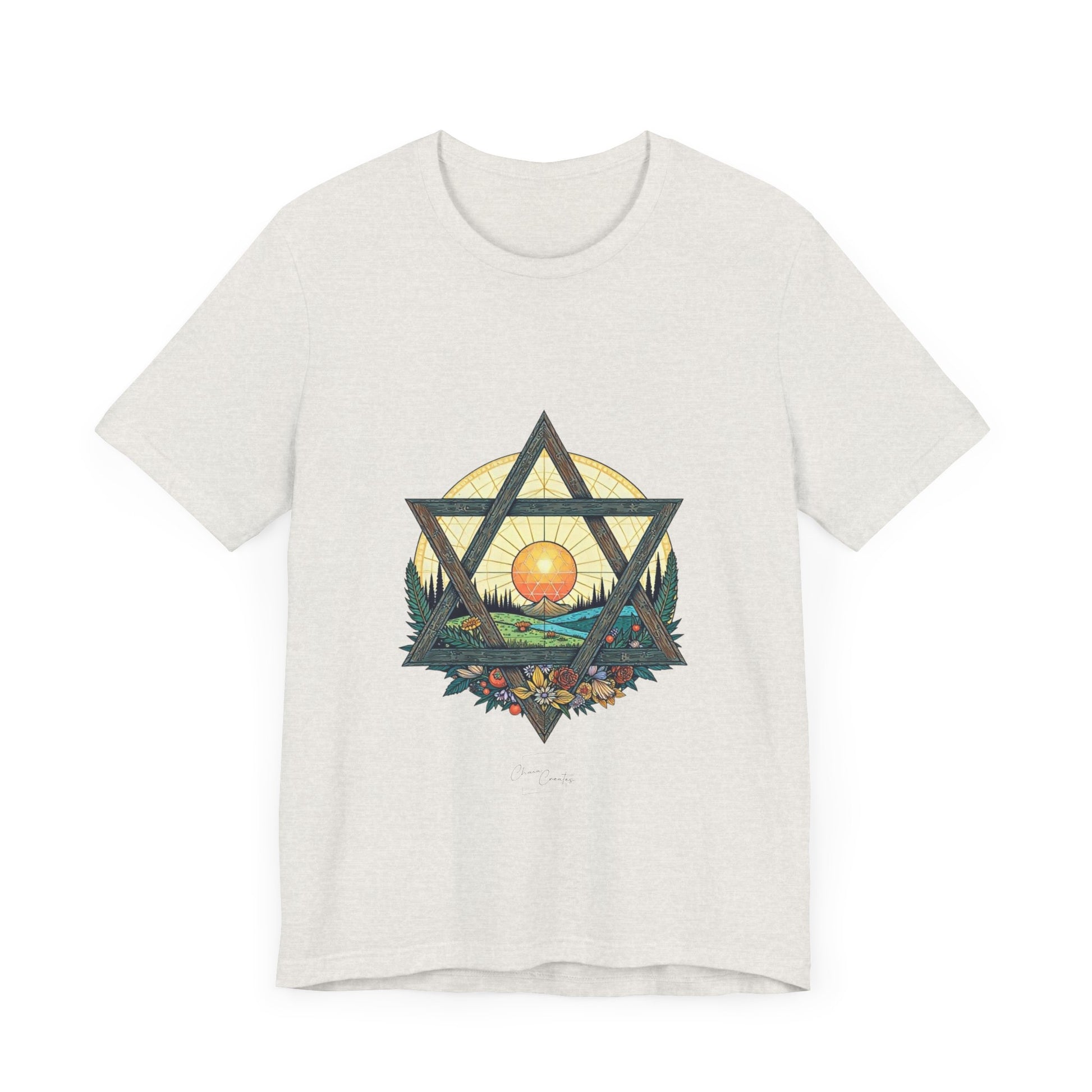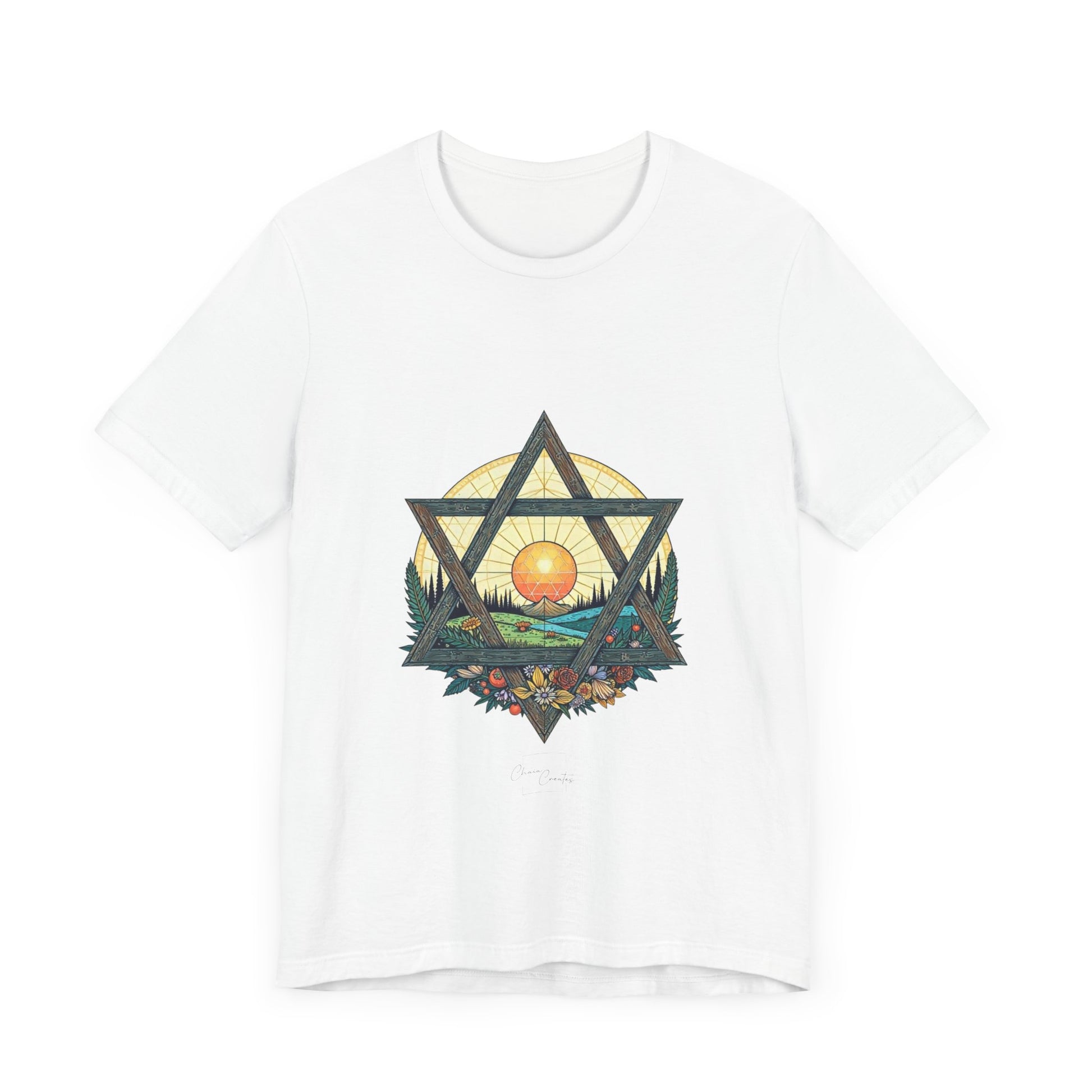 This T-Shirt features a Magen David (Star of David) design with a tranquil natural landscape, including a radiant sun, green hills, a winding river, vibrant wildflowers, and evergreen trees. The design combines spiritual symbolism with elements of nature, creating a harmonious and grounded yet elevated expression. Perfect for those looking to incorporate Jewish symbolism and nature-inspired artwork into their wardrobe, suitable for holidays and spiritual observances.
