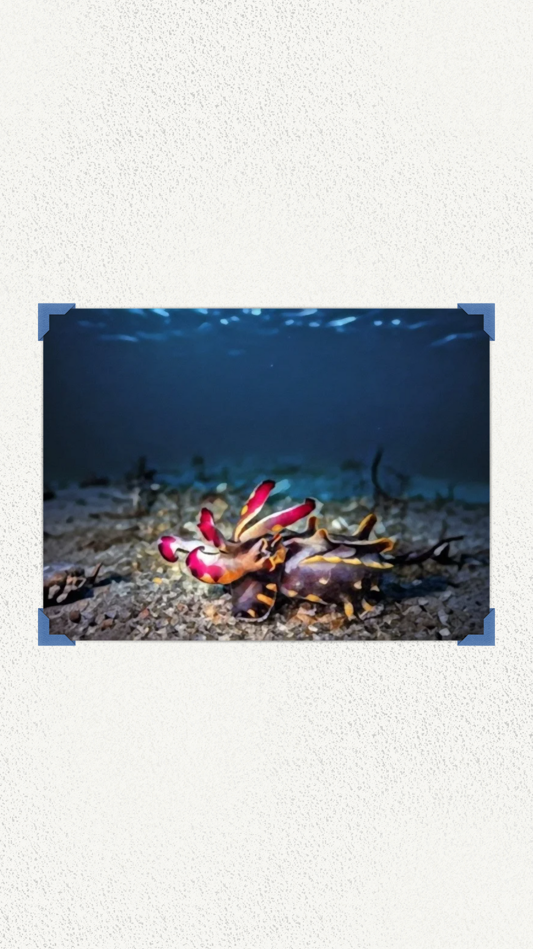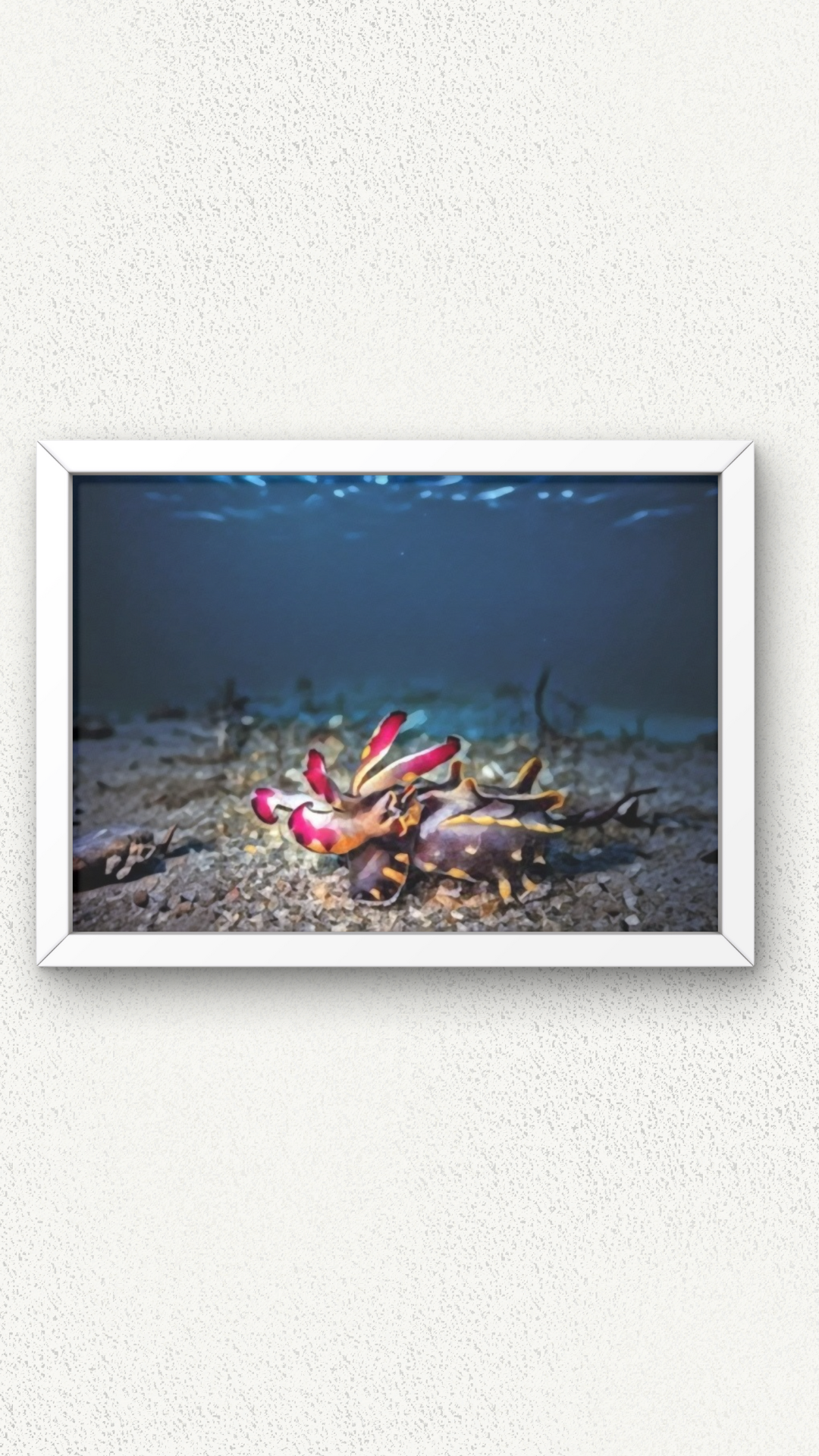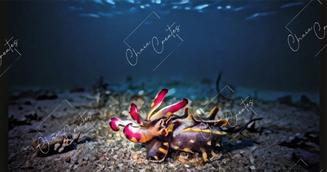 In this striking artwork by Chaia Malana, the flamboyant cuttlefish takes center stage, celebrating its vibrant colors and rare beauty. Unlike many sea creatures, this cuttlefish is a solitary walker, moving gracefully along the ocean floor rather than swimming. The intricate detailing and rich hues bring out its unique character and captivating presence. This piece is a tribute to the flamboyant cuttlefish, honoring its individuality and the mesmerizing display it brings to the underwater world. Ideal for ocean lovers and those inspired by nature's hidden wonders.