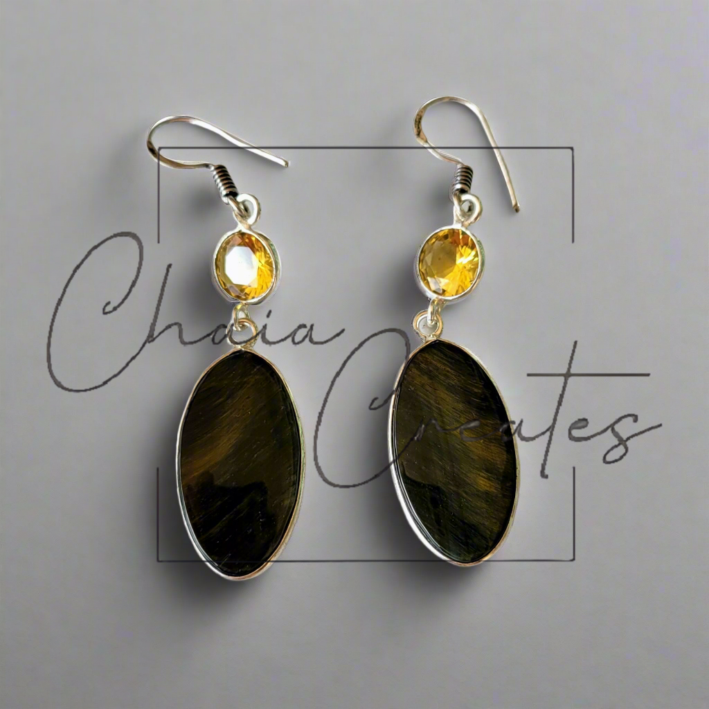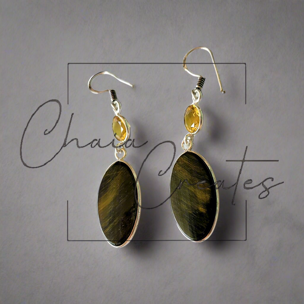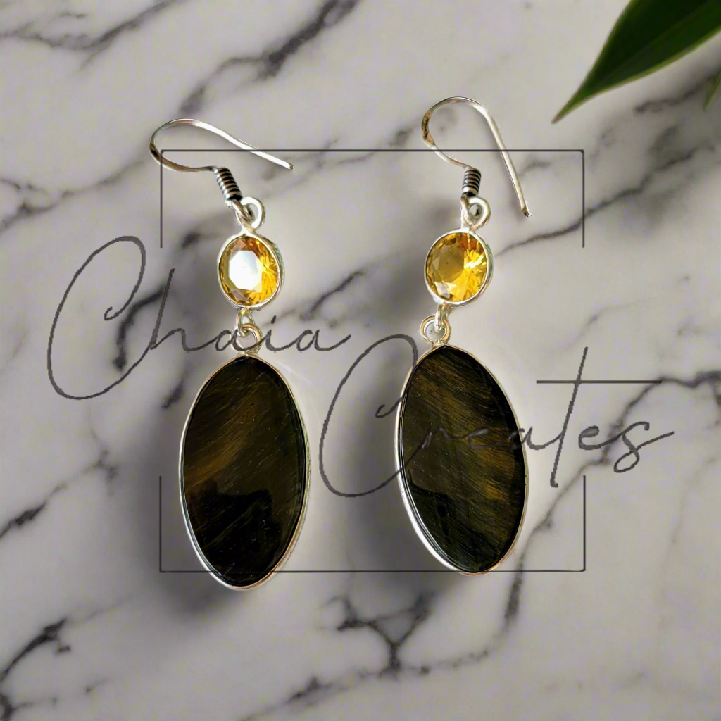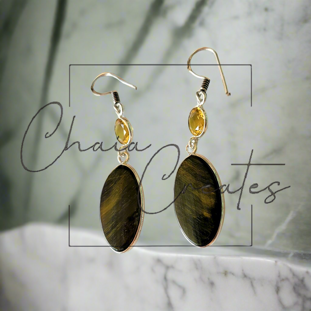 Crafted with meticulous attention to detail, these dangle earrings offer both style and substance. The sterling silver setting provides a sophisticated finish, while the unique properties of Tiger's Eye and Citrine lend both grounding and uplifting energies. Whether you're dressing up for a special event or adding a touch of elegance to your everyday look, these earrings are a versatile and meaningful choice.