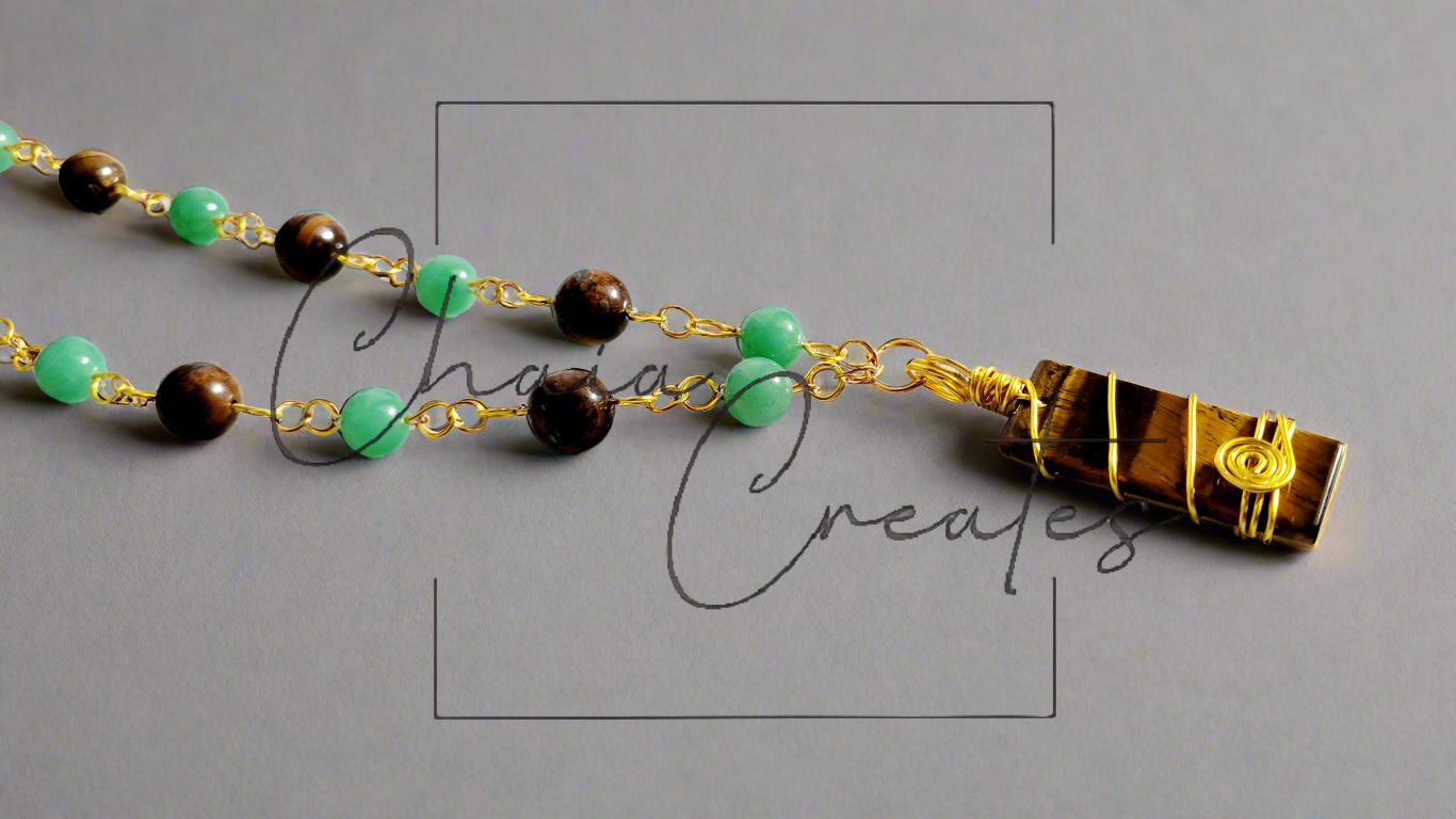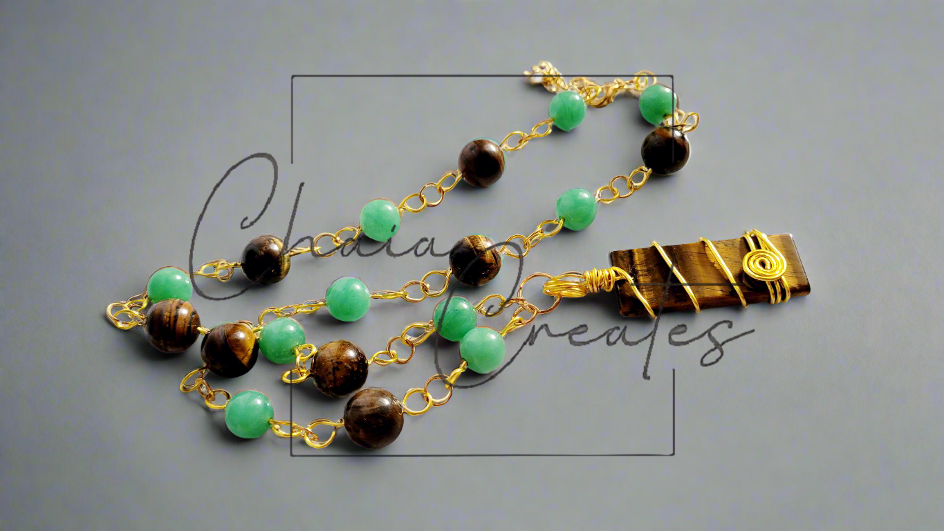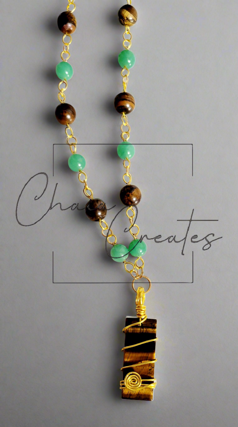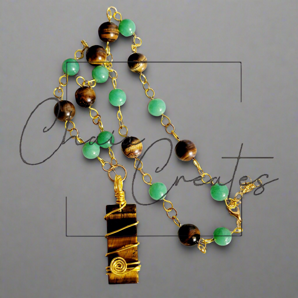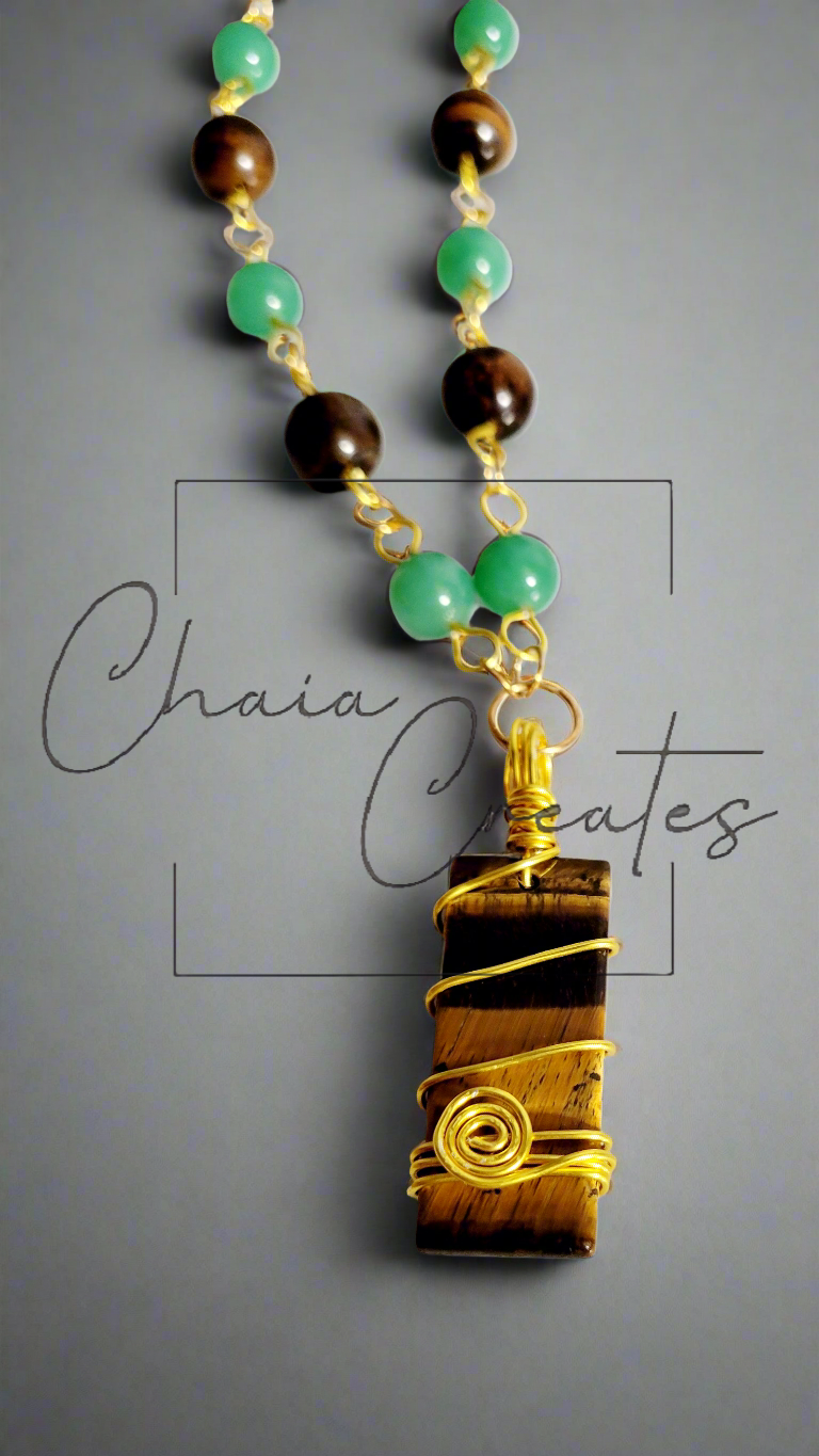 Elevate your style with this striking Tiger's Eye Pendant Necklace, intricately wire-wrapped in golden hues. The pendant, made from mesmerizing Tiger's Eye, is accentuated by an elegant golden wire design, exuding sophistication and timeless charm. The necklace features a stunning combination of Tiger's Eye and Green Aventurine beads, each carefully linked to create a harmonious blend of earthy tones and vibrant greens. Perfect for any occasion, this necklace adds a touch of natural beauty and elegance to your ensemble.