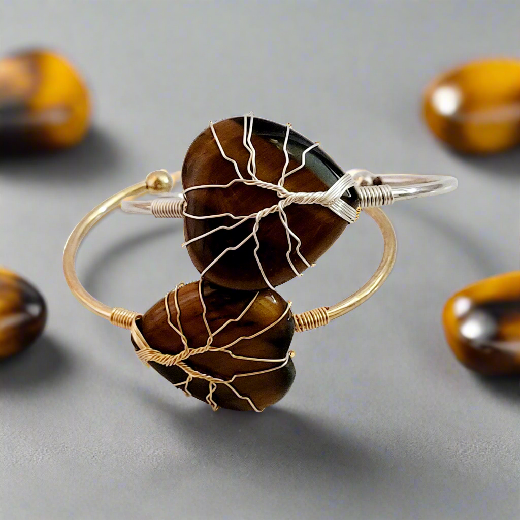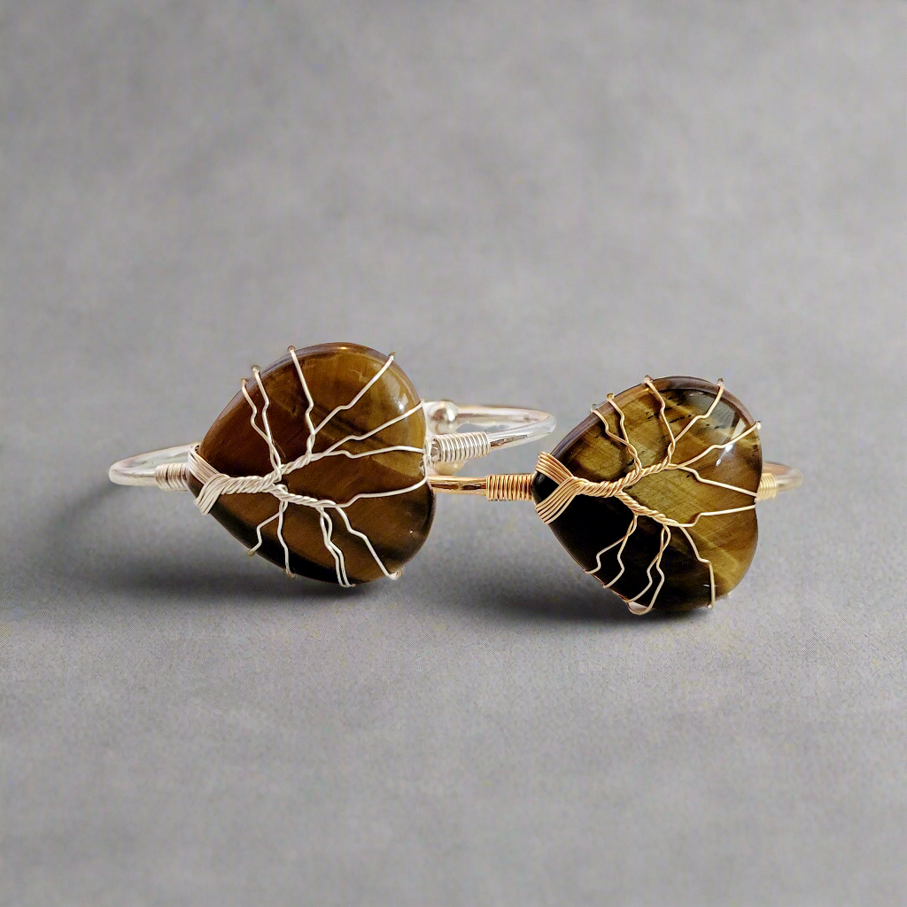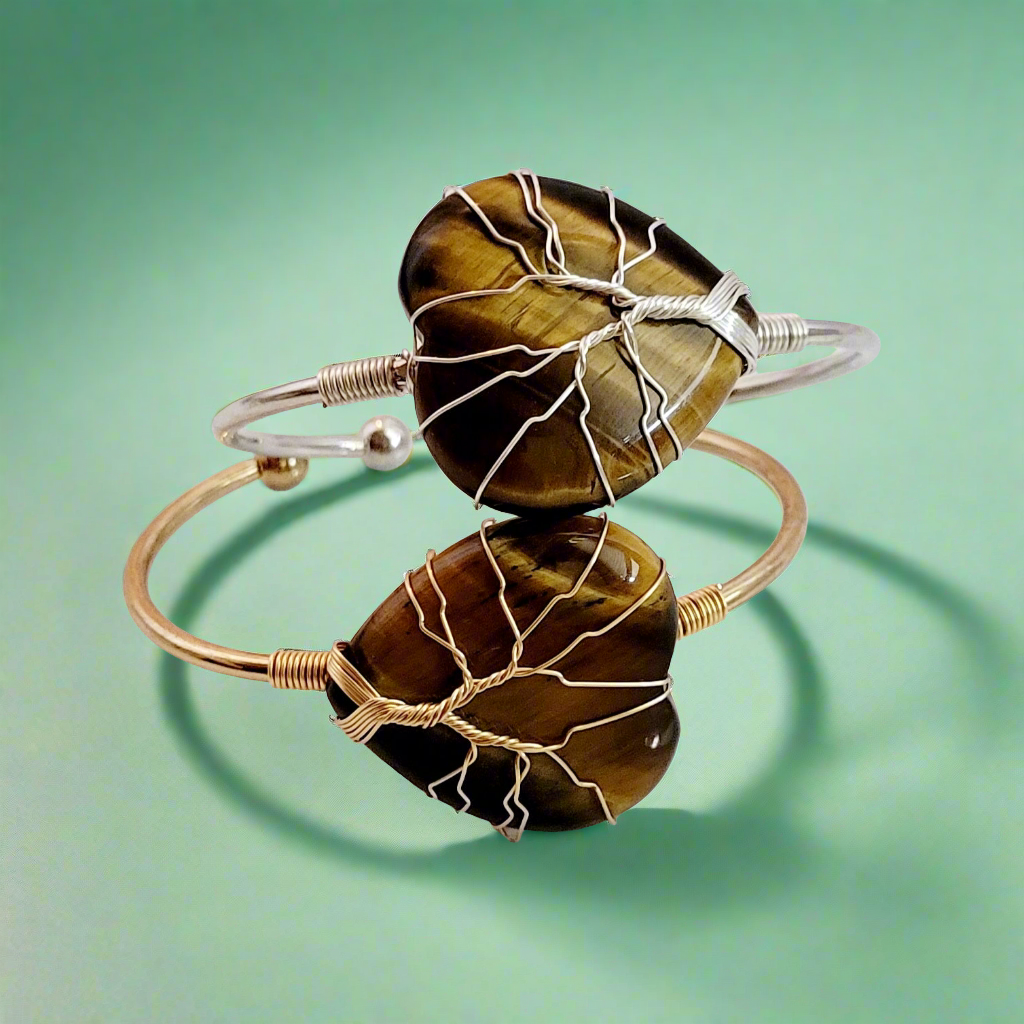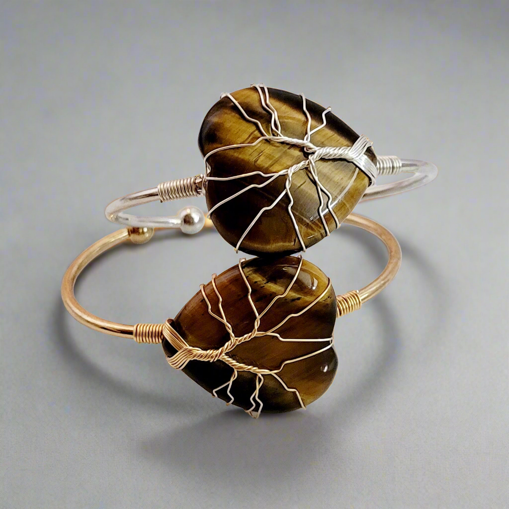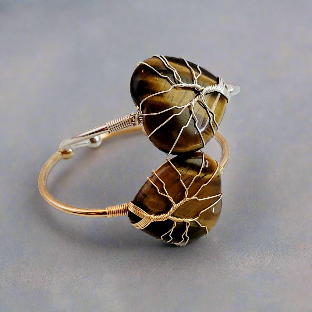 Tree of Life Wire Wrapped Tiger's Eye Heart Bangle Bracelet