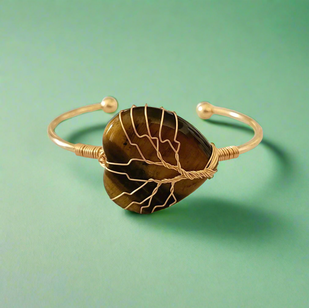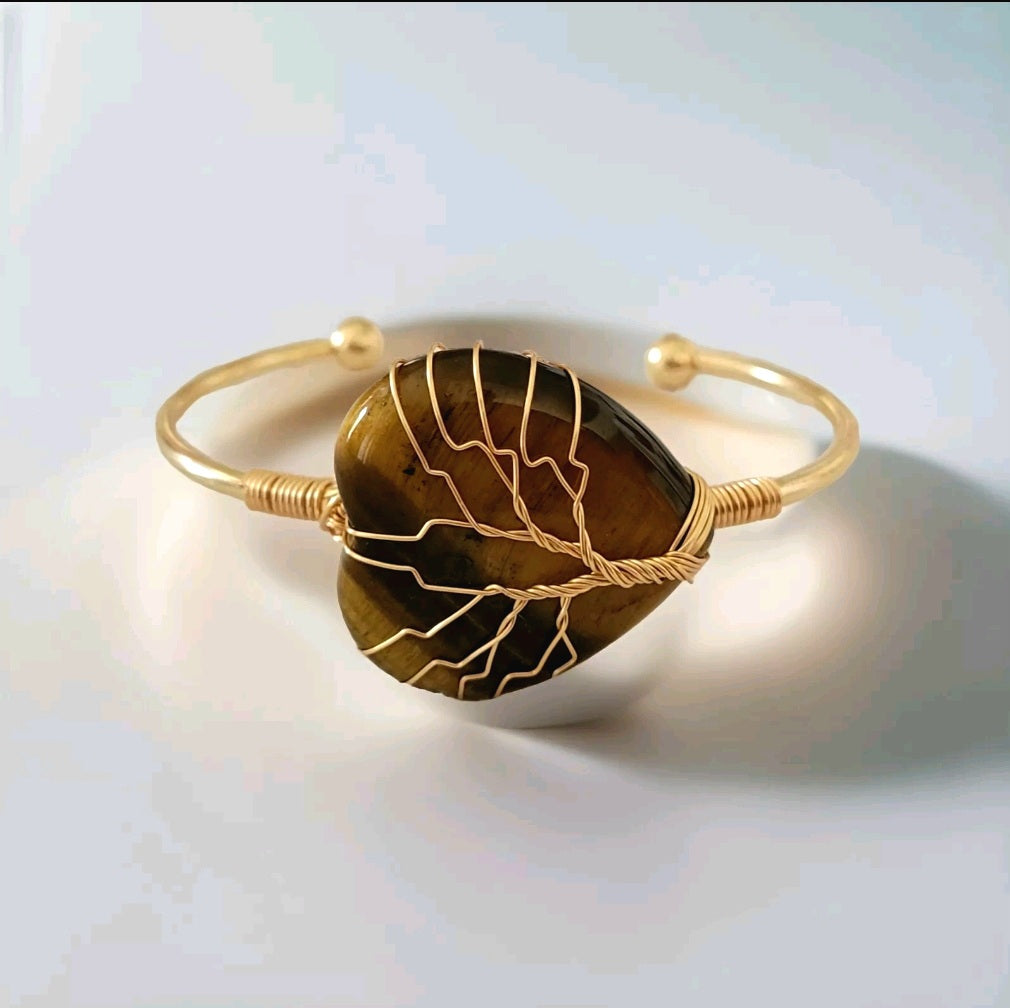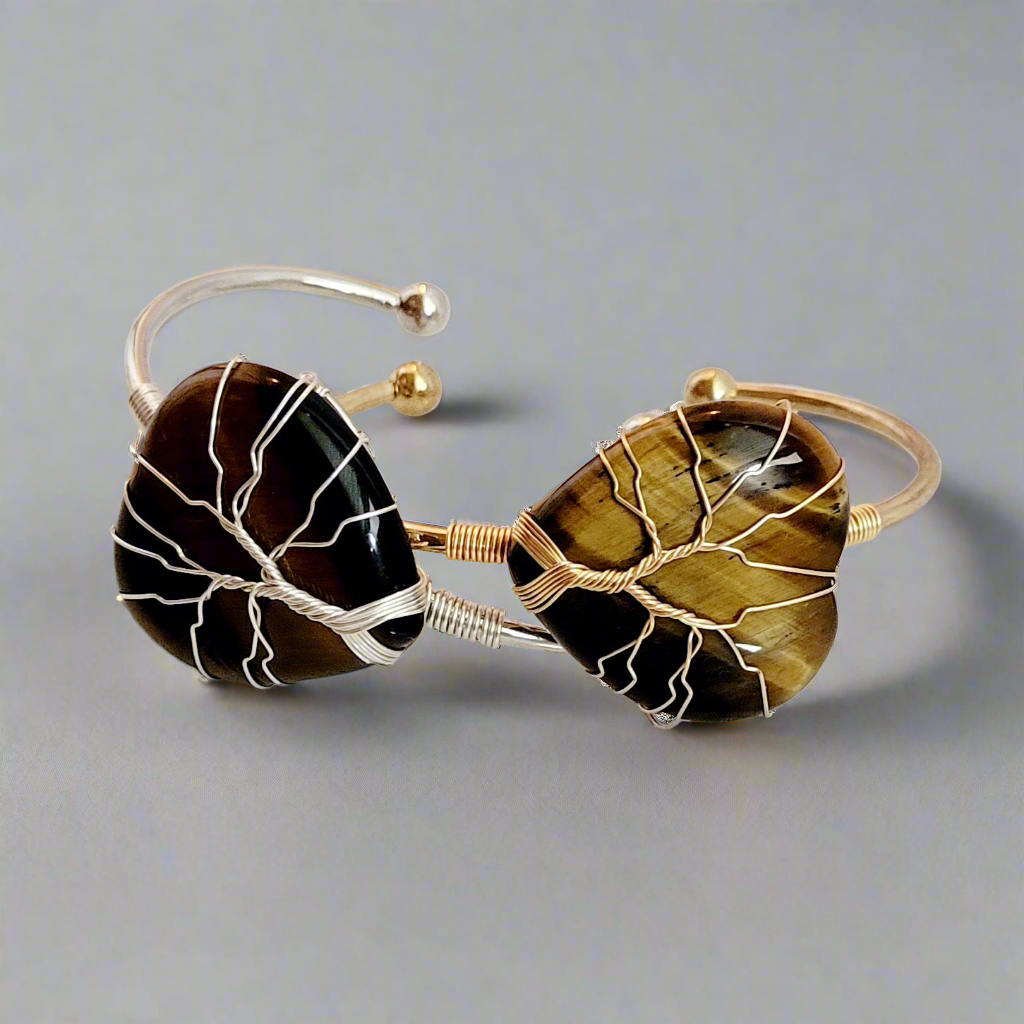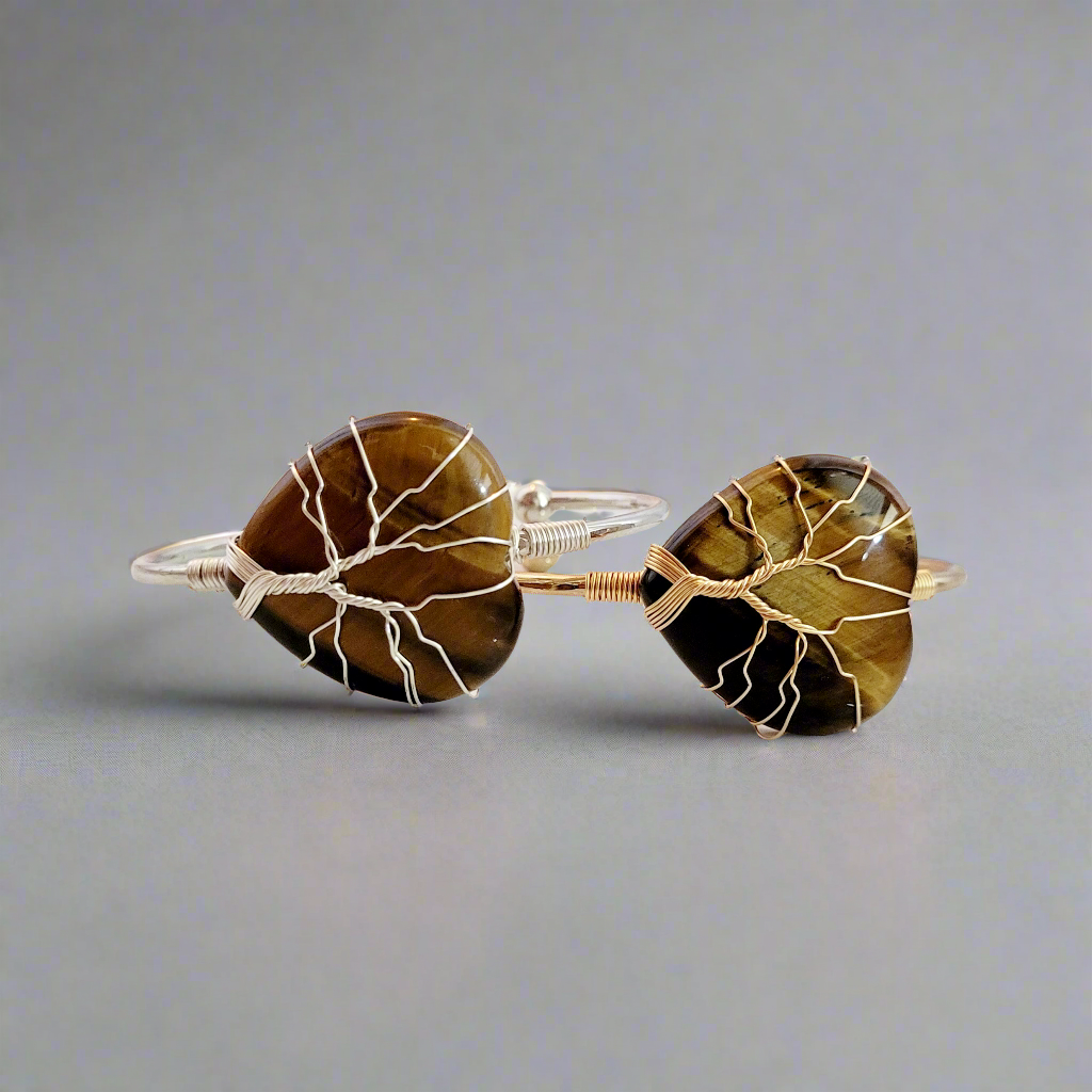 Tree of Life Wire Wrapped Tiger's Eye Heart Bangle Bracelet