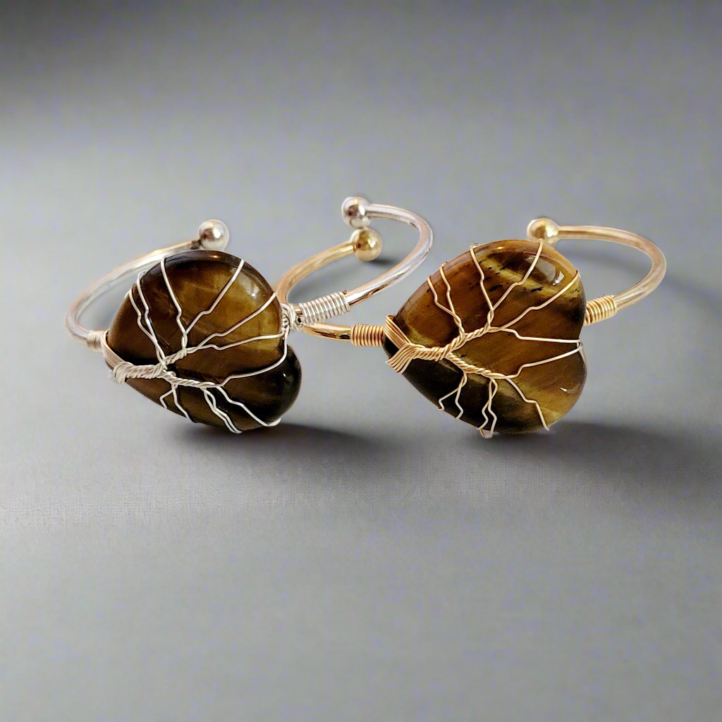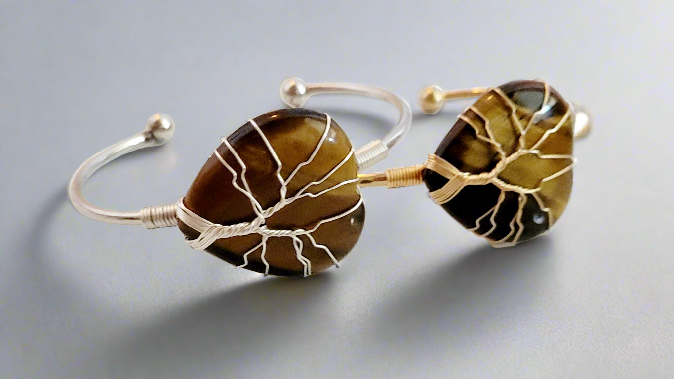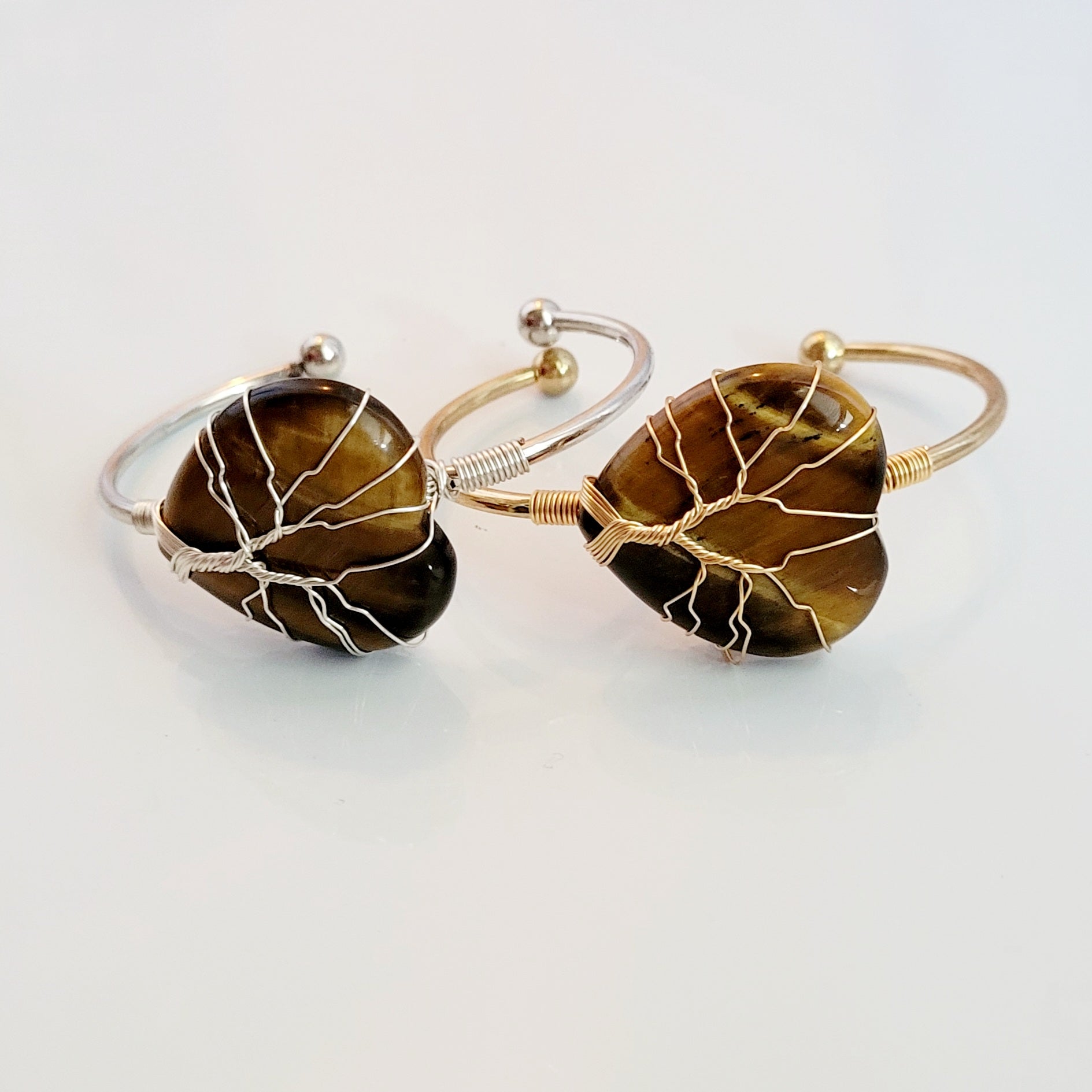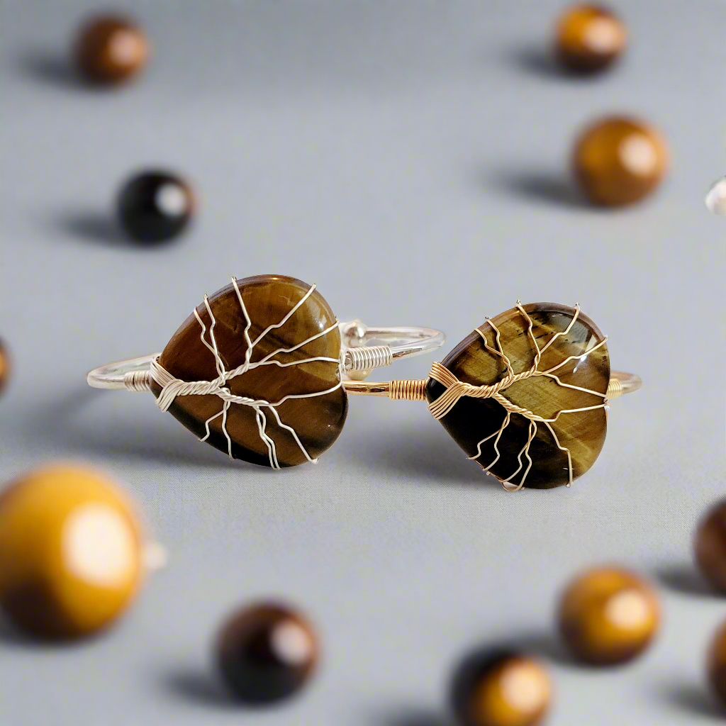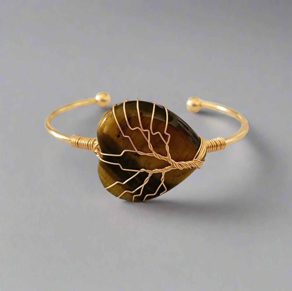 Tree of Life Wire Wrapped Tiger's Eye Heart Bangle Bracelet