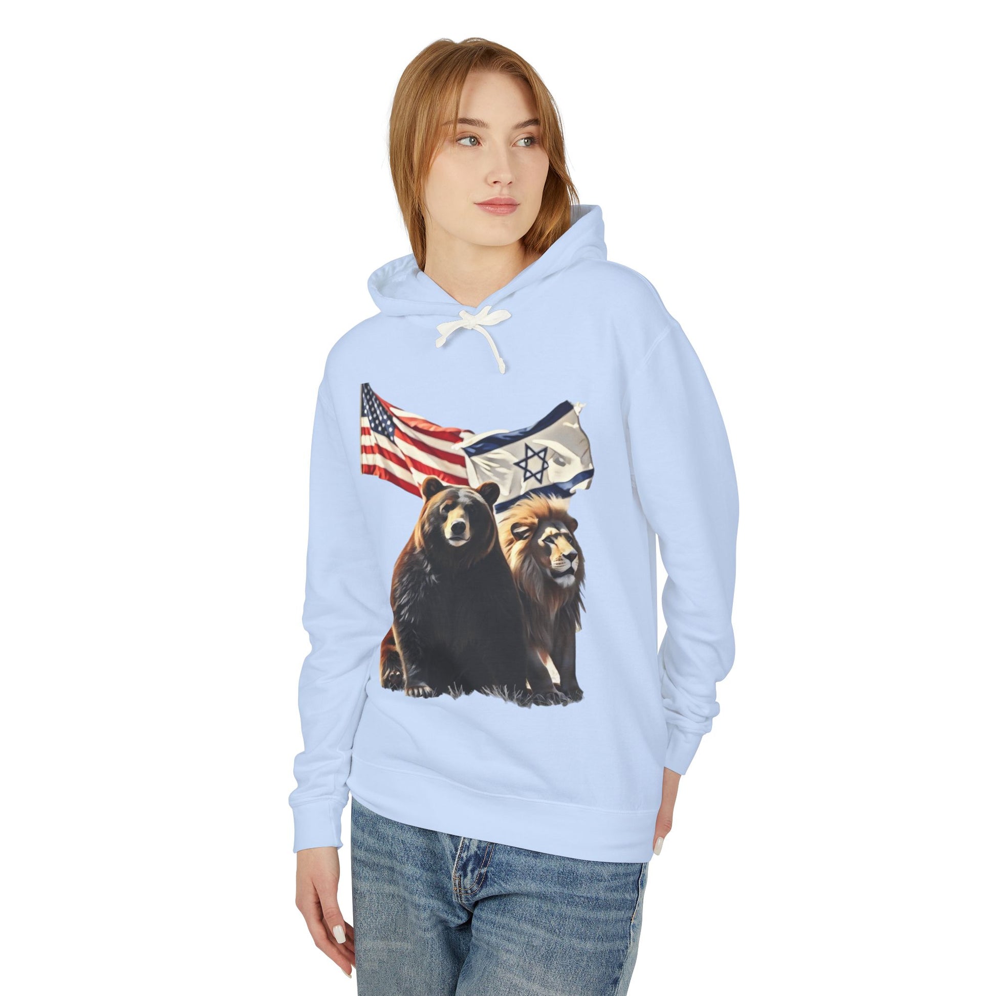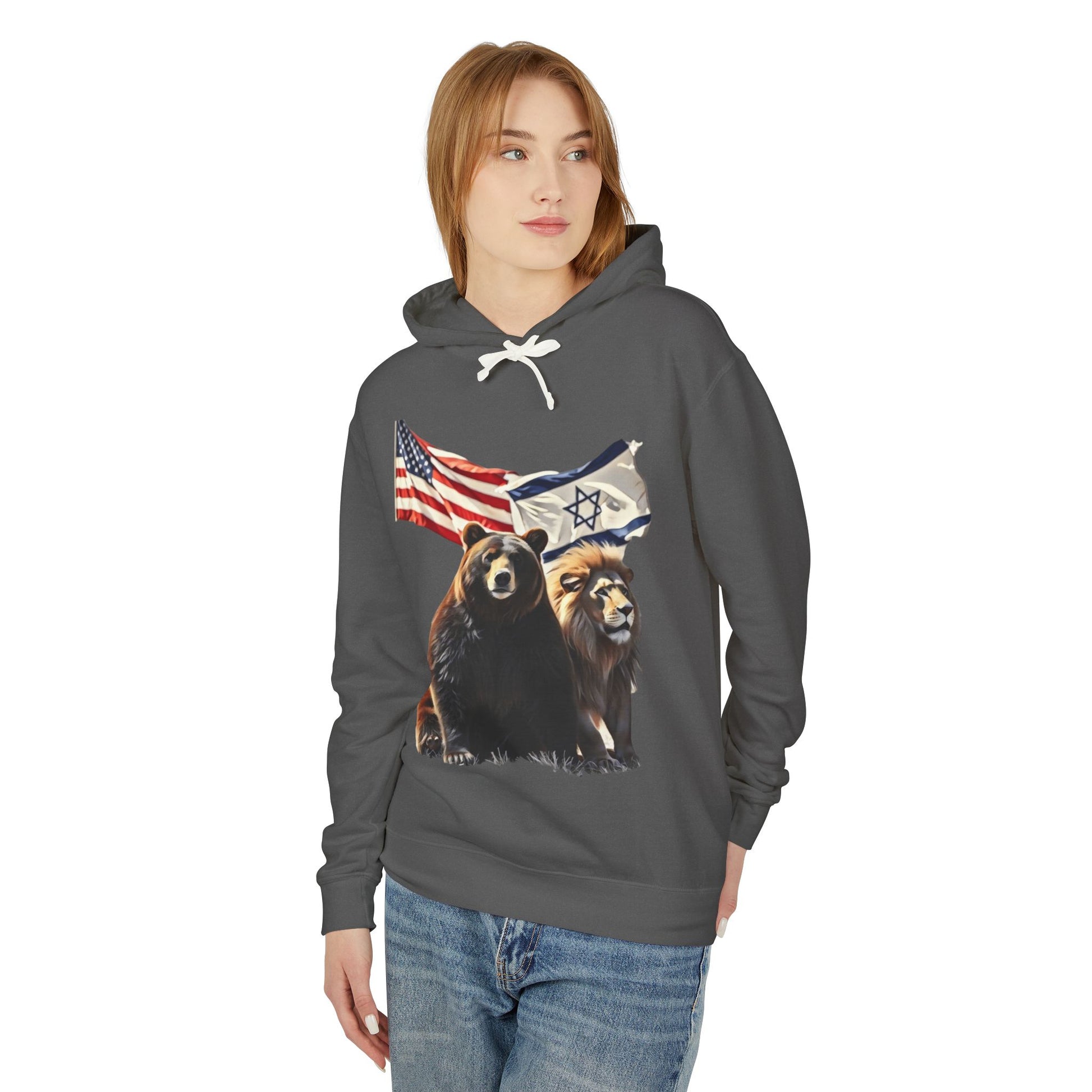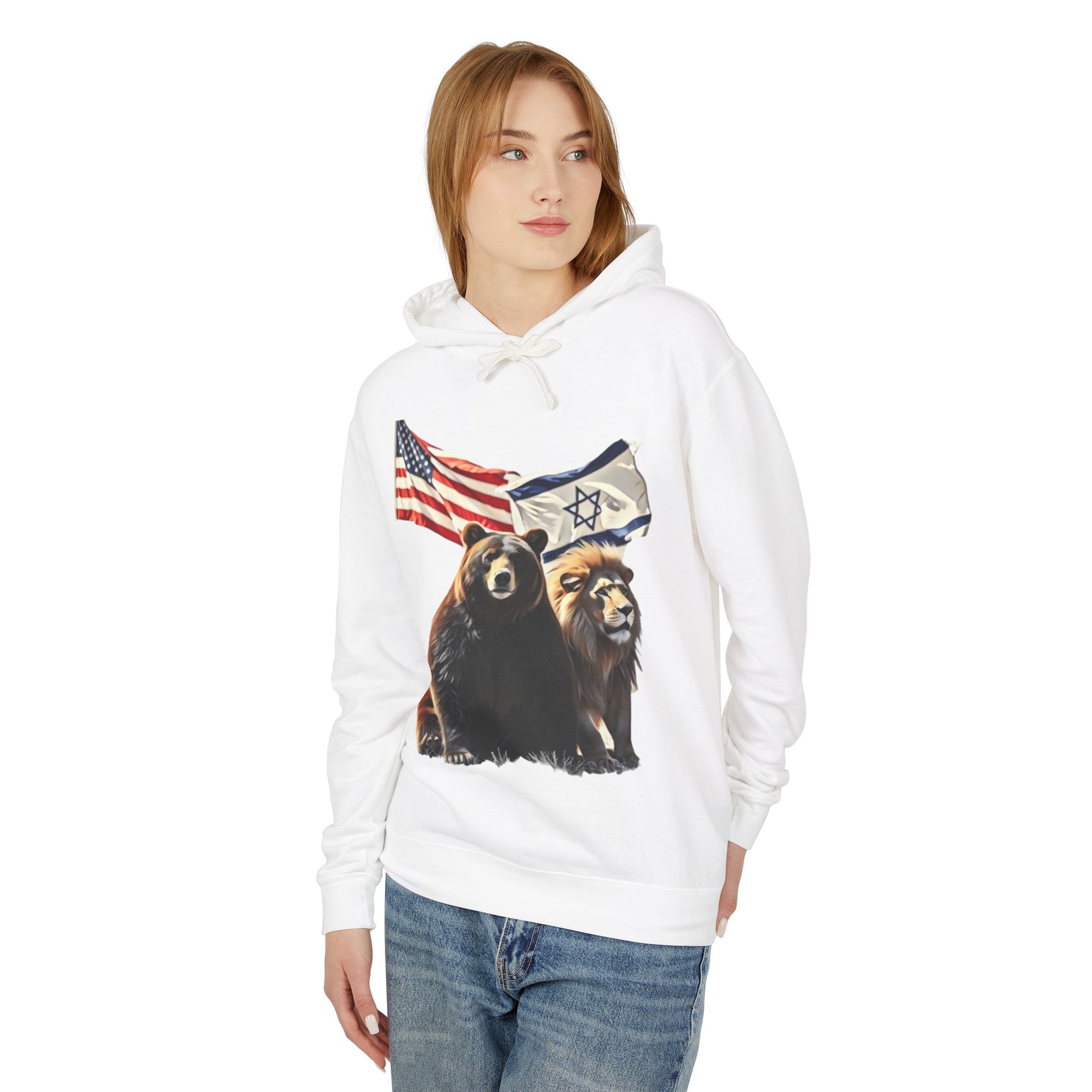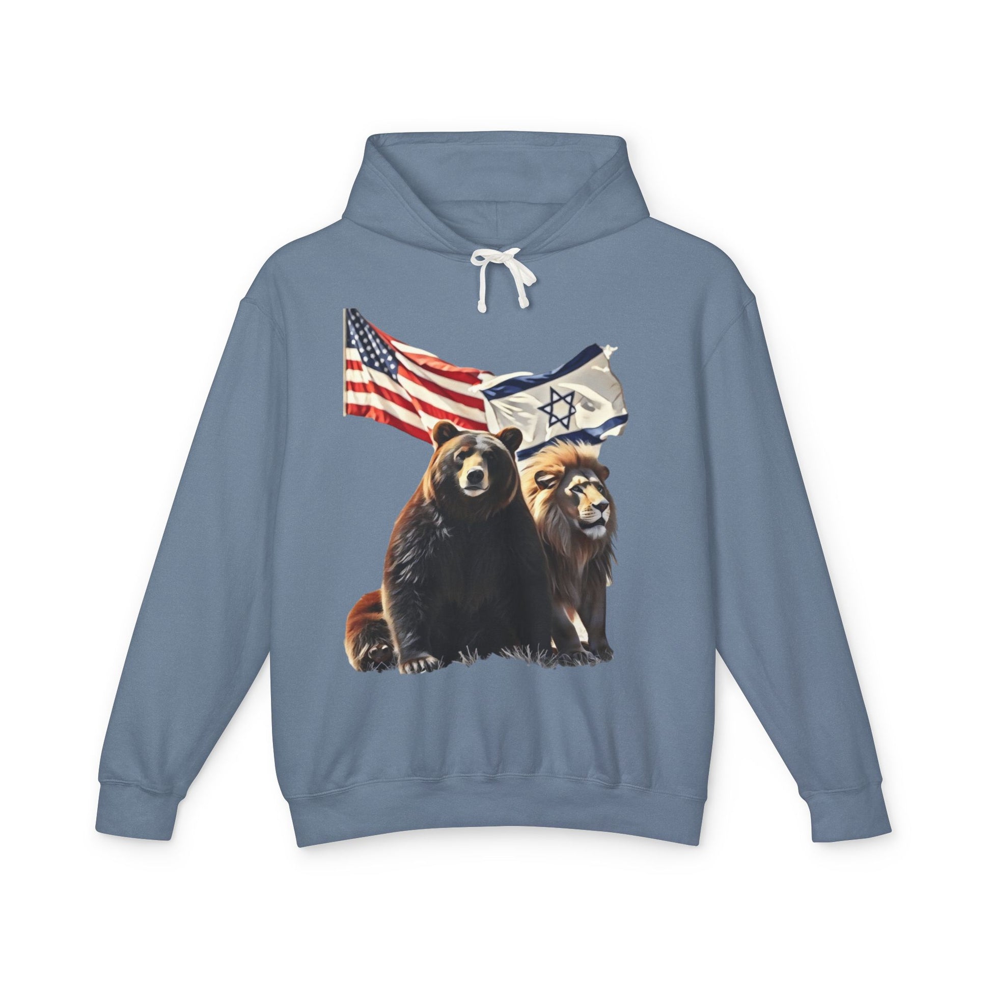 This powerful 'Allies of Strength' design showcases a bear and a lion against the backdrop of American and Israeli flags, symbolizing unity, resilience, and shared strength. The bear represents endurance and wisdom, while the lion embodies courage and leadership. This hoodie exudes a sense of solidarity and is perfect for those who value strength and mutual support. Ideal for patriotic occasions, celebrations, and those who appreciate meaningful symbolism.