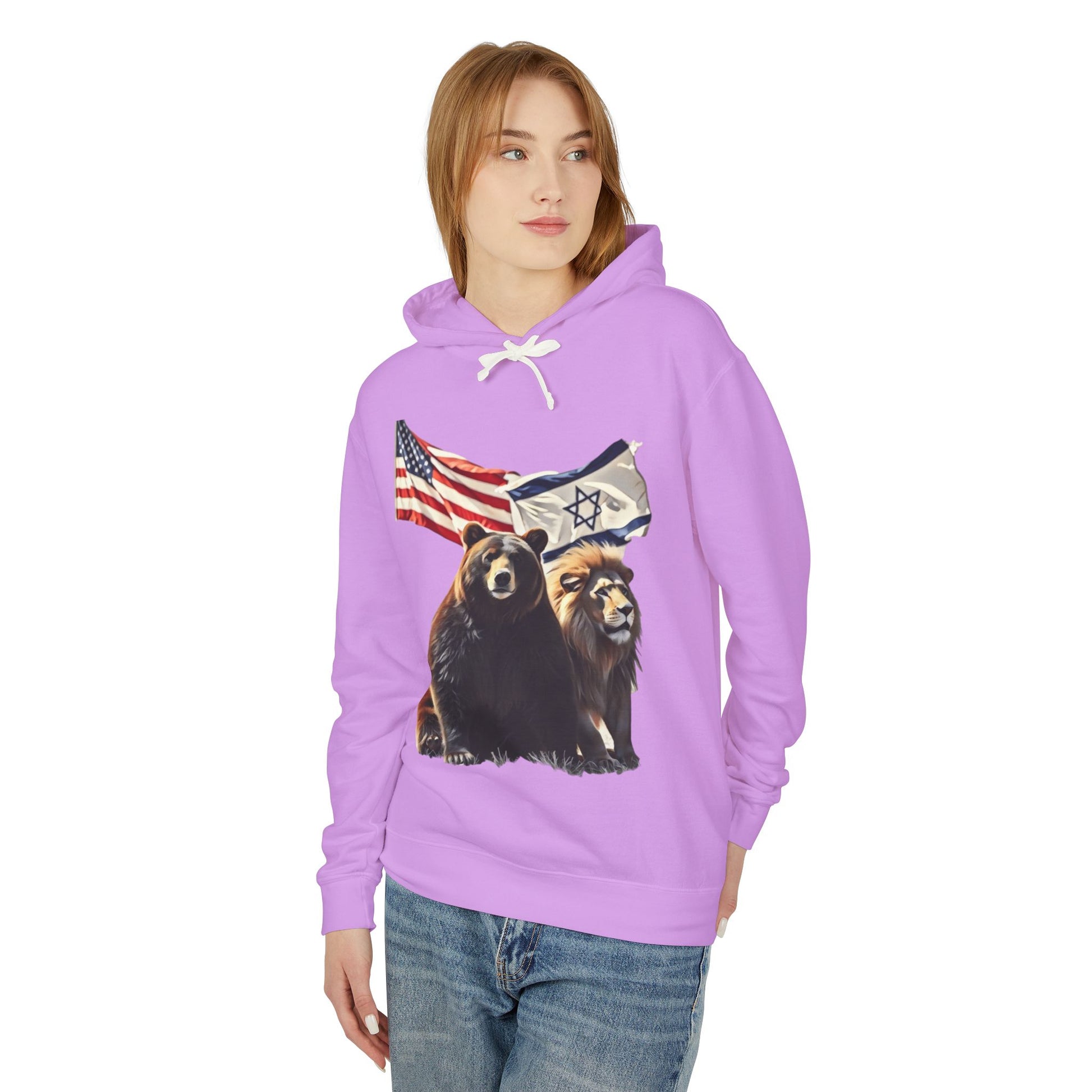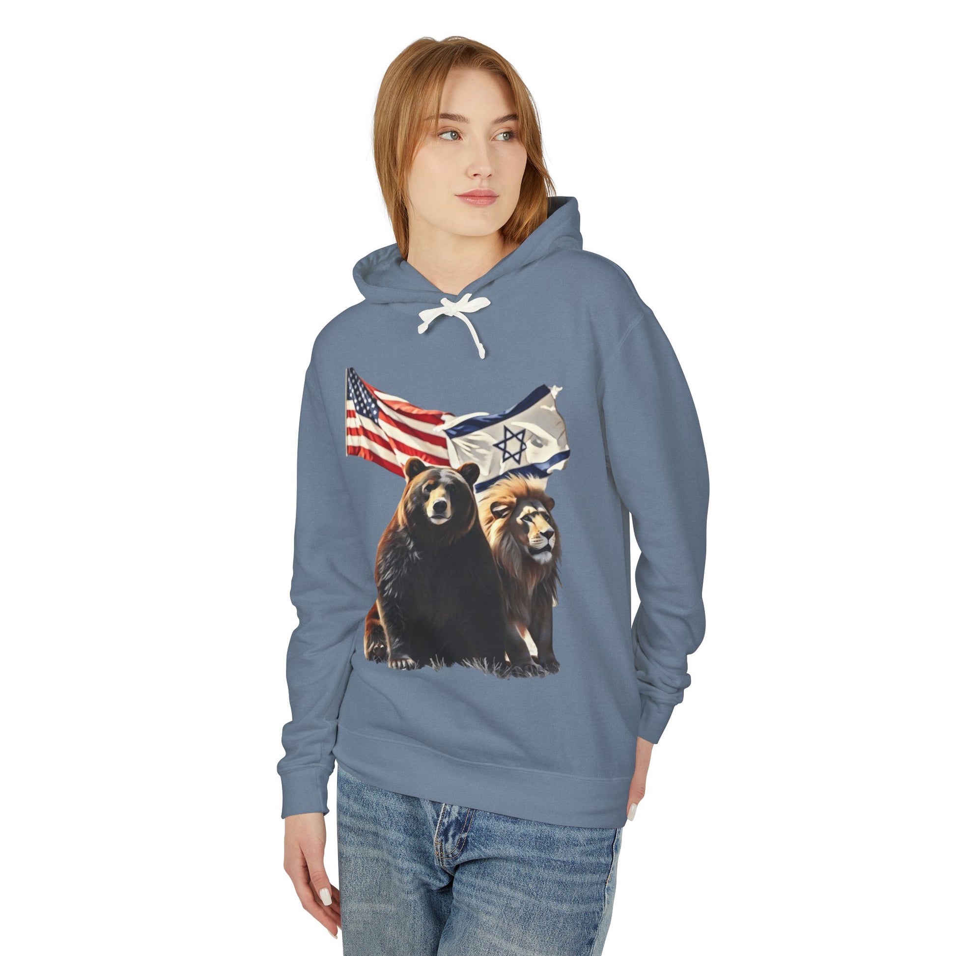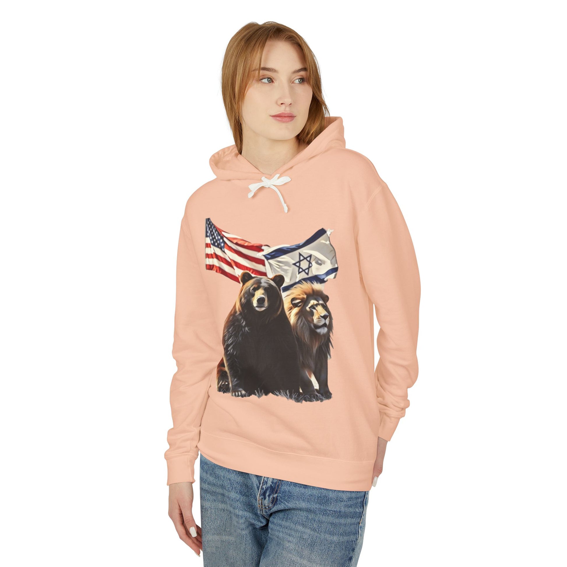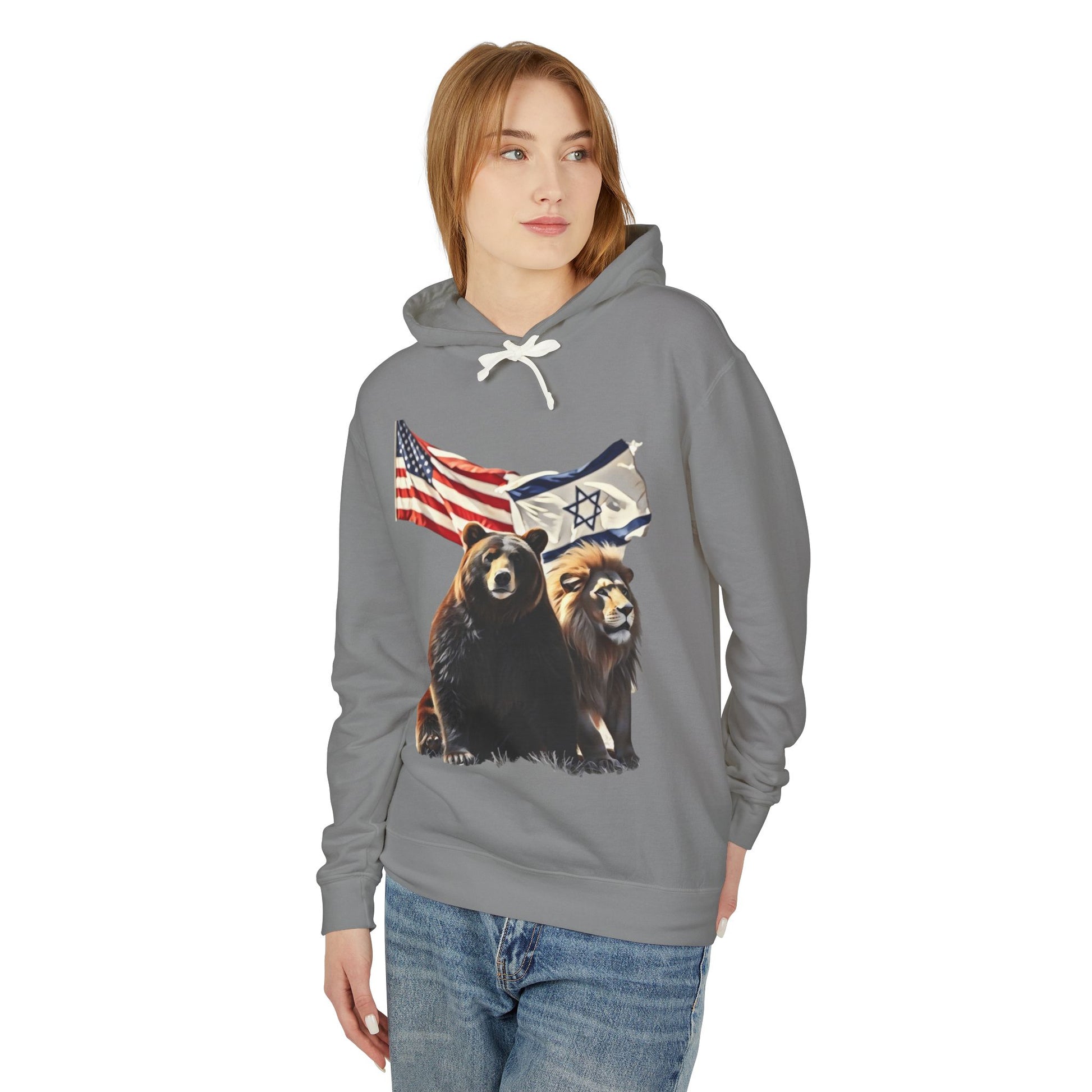This powerful 'Allies of Strength' design showcases a bear and a lion against the backdrop of American and Israeli flags, symbolizing unity, resilience, and shared strength. The bear represents endurance and wisdom, while the lion embodies courage and leadership. This hoodie exudes a sense of solidarity and is perfect for those who value strength and mutual support. Ideal for patriotic occasions, celebrations, and those who appreciate meaningful symbolism.