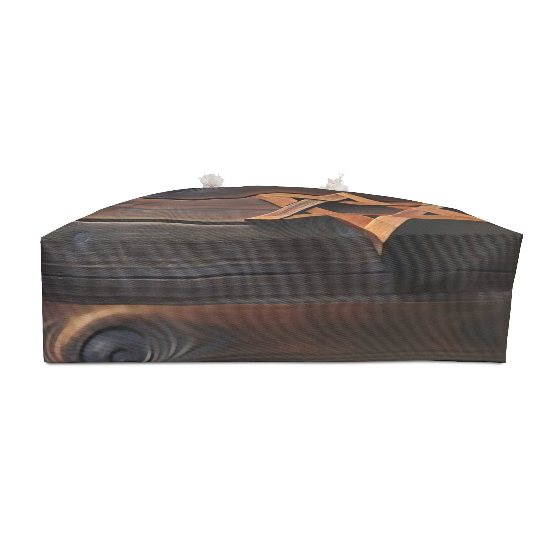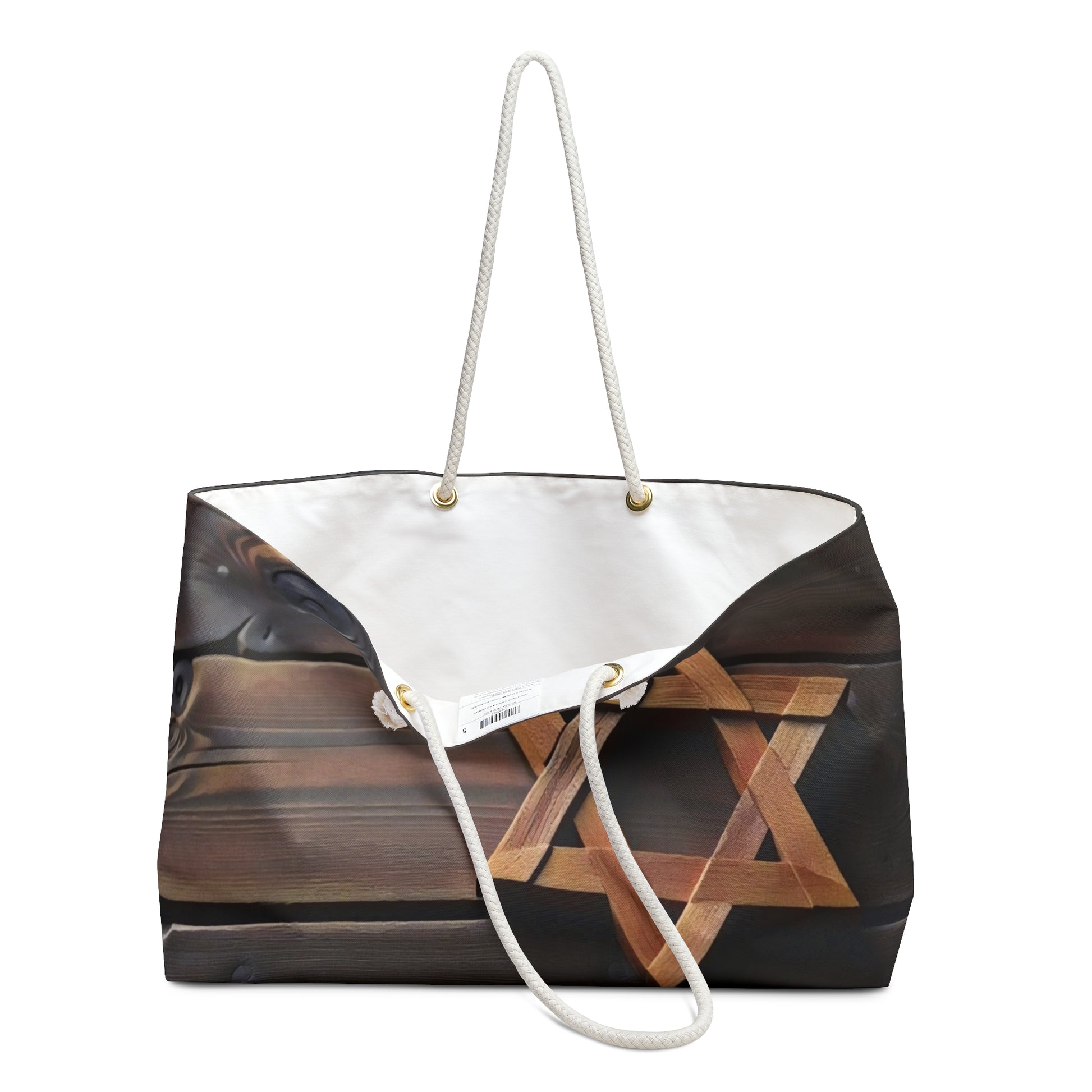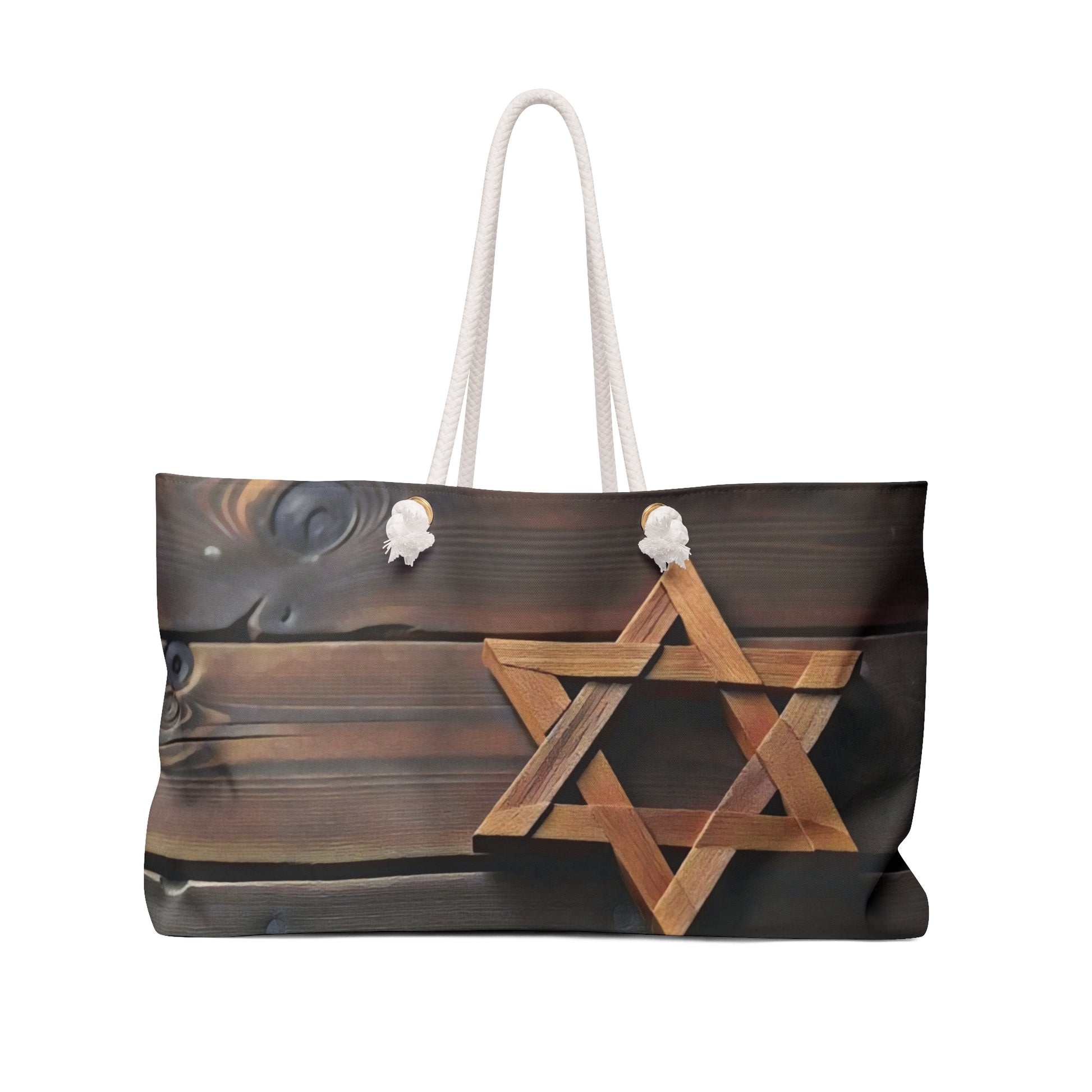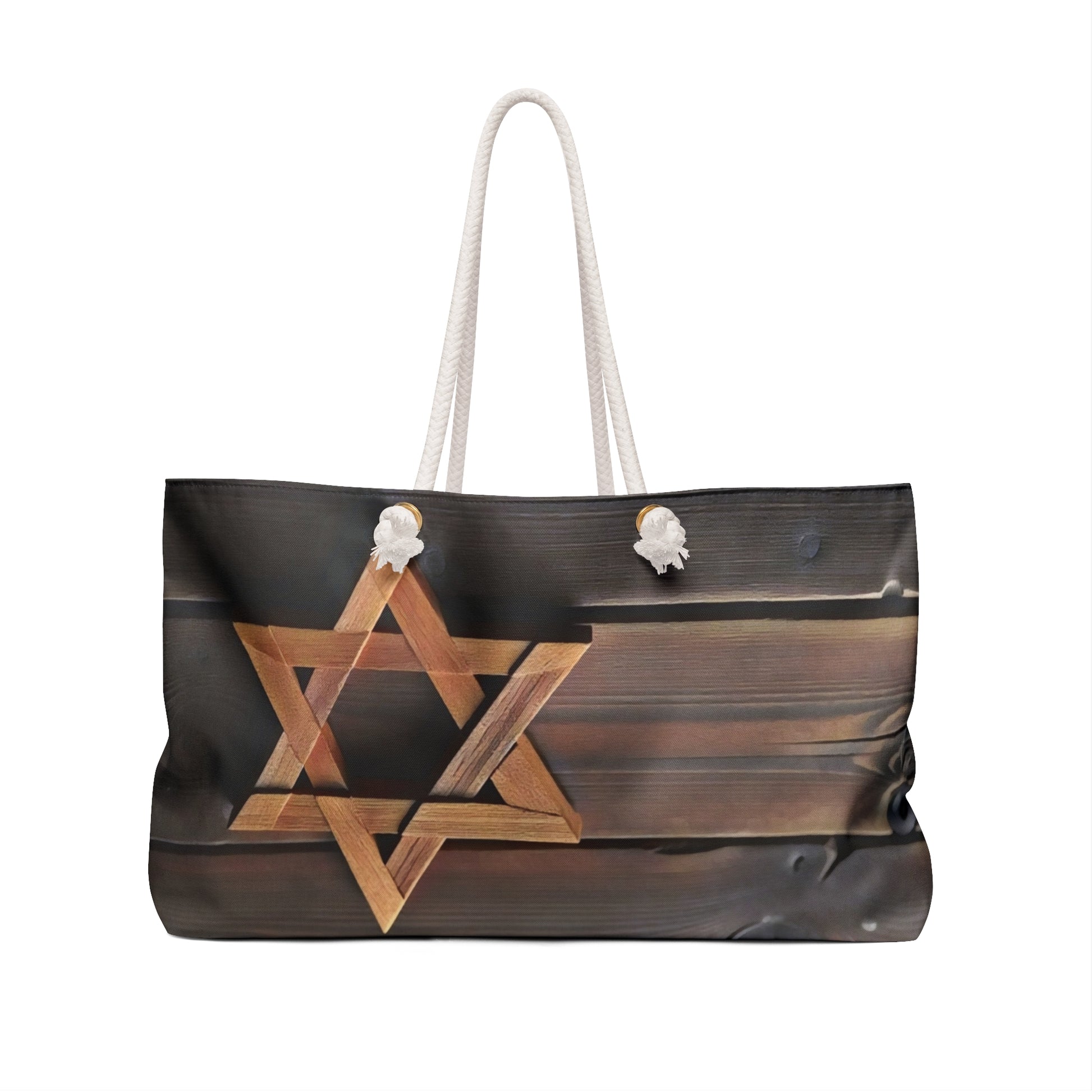 This Weekender Bag features a Jewish Star of David Wooden Design on a wood plank backdrop, giving off a rustic and cultural vibe. Perfect for weekend getaways or as a stylish overnight bag. Ideal for those who celebrate Jewish holidays and festivals.