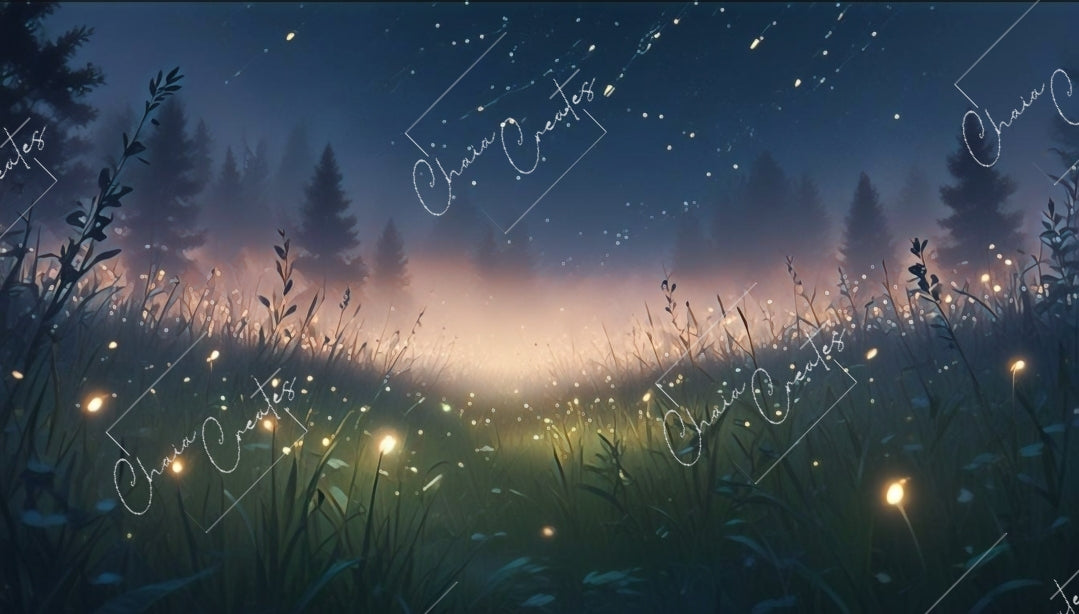 Chaia Malana’s Whispers of the Night captures a magical meadow bathed in soft, otherworldly light. In this serene, misty landscape, fireflies and gentle glimmers of light hover among tall grasses, casting a warm, delicate glow that contrasts with the cool, deep blue of the evening sky. Silhouetted pines stand quietly in the background, forming a natural frame that encloses the illuminated meadow, creating a sense of intimacy and quiet wonder. Above, the sky sparkles with distant stars and faint streaks of light, as if the heavens themselves are raining down whispers of ancient secrets.