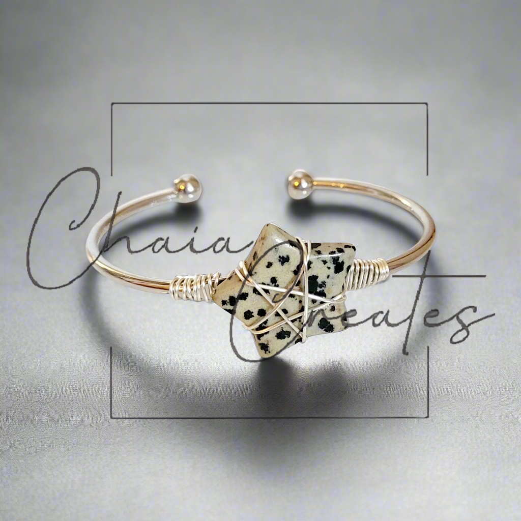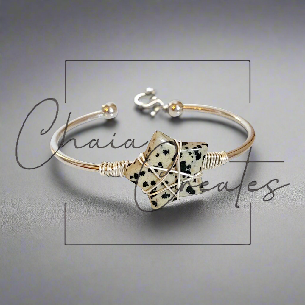 Order now to experience the charming blend of whimsical elegance and artisanal craftsmanship with our Wire-Wrapped Stone Star Silver Bangle Bracelet featuring Dalmatian Jasper. Add a touch of celestial charm and distinctive style to your jewelry collection today!