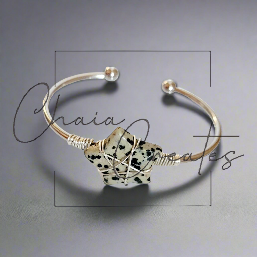 - Artisan Wire-Wrap Design: The dalmatian jasper stone is expertly wire-wrapped in a star shape, showcasing detailed craftsmanship. This intricate design not only enhances the natural beauty of the stone but also adds a celestial charm to the bracelet.