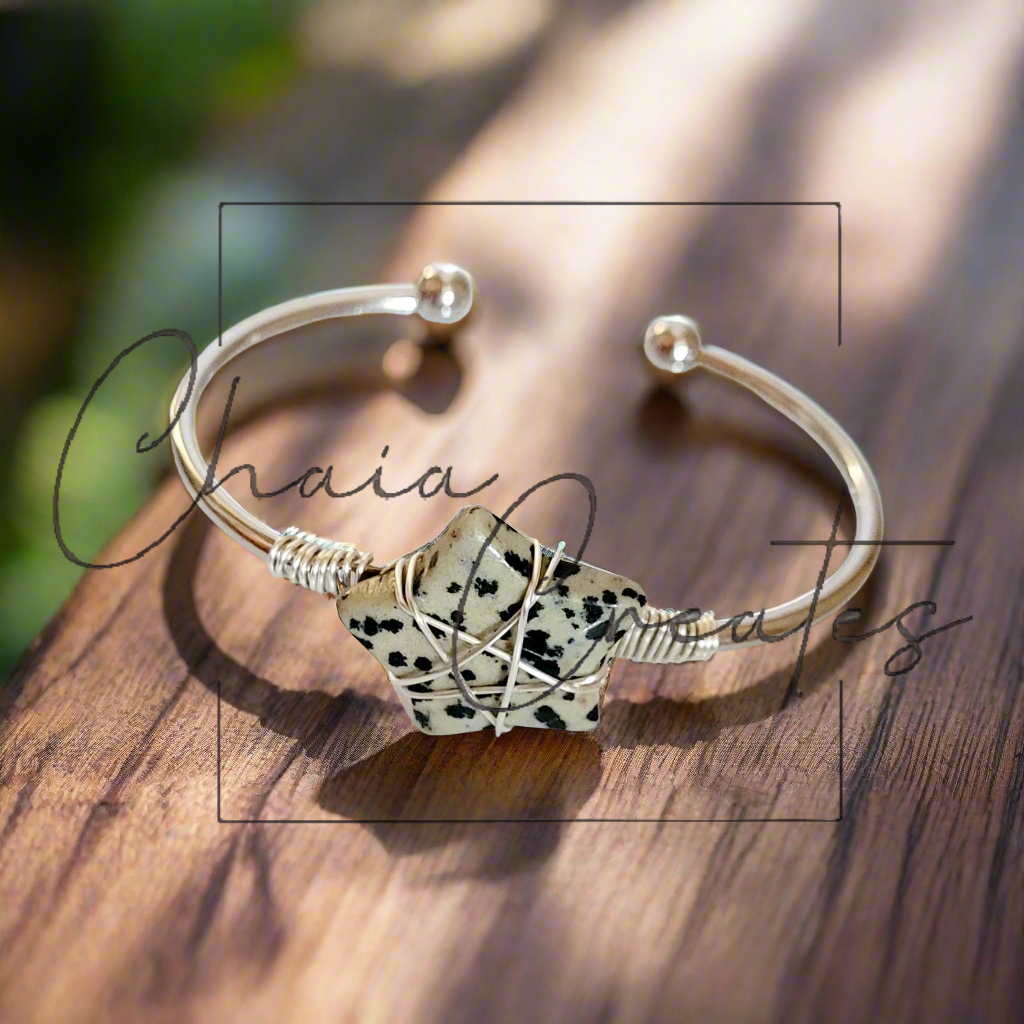 Our Wire-Wrapped Stone Star Silver Bangle Bracelet with Dalmatian Jasper is more than just an accessory—it’s a celebration of natural beauty and artistic design. The playful speckled pattern of the dalmatian jasper combined with the celestial star wire-wrap creates a distinctive and eye-catching piece. Dalmatian jasper is known for its grounding properties and ability to encourage joy, making this bracelet not only beautiful but also meaningful.
