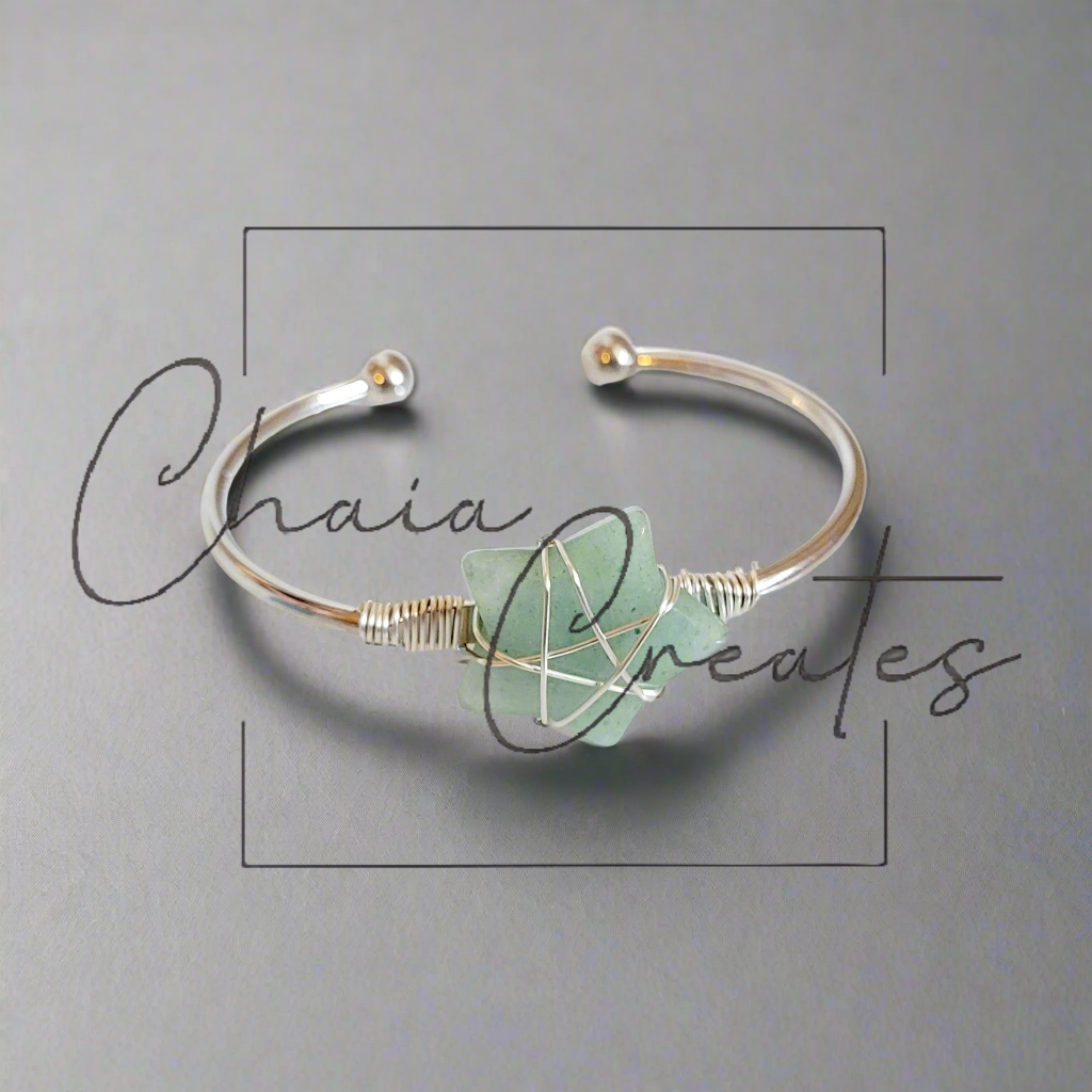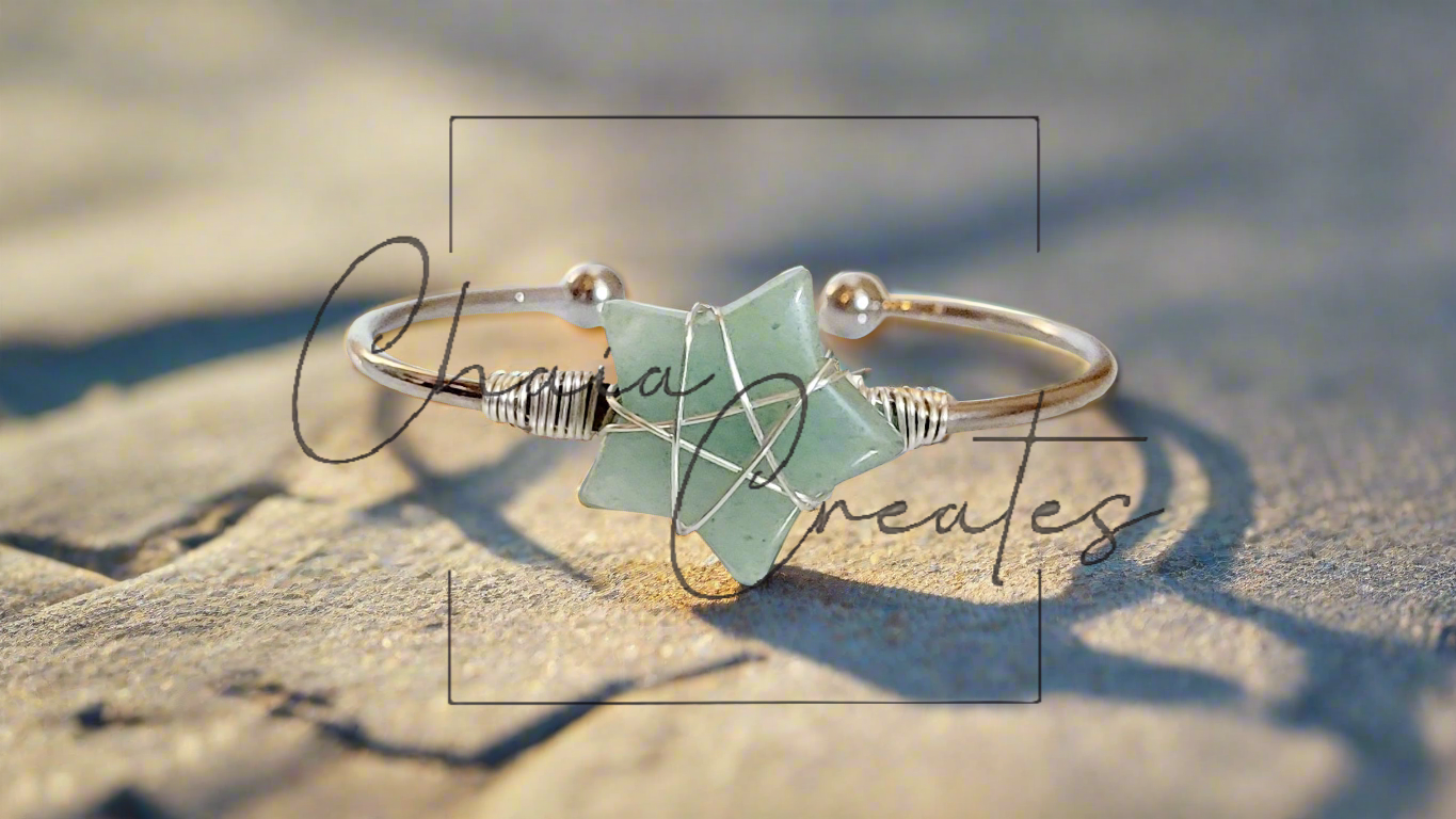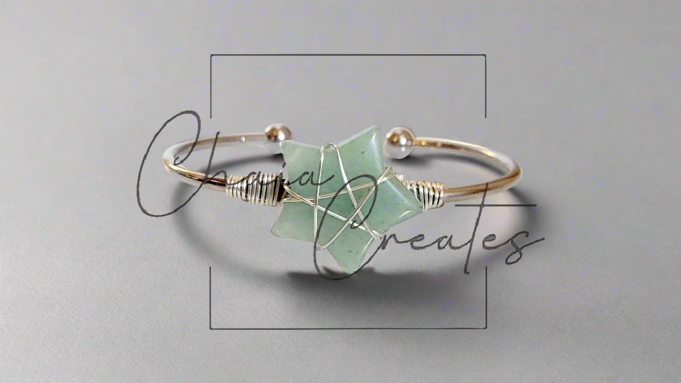Wire Wrapped Green Aventurine Stone Star Silver Bangle Bracelet